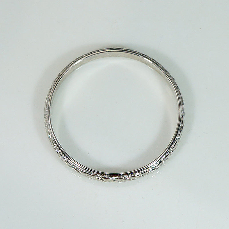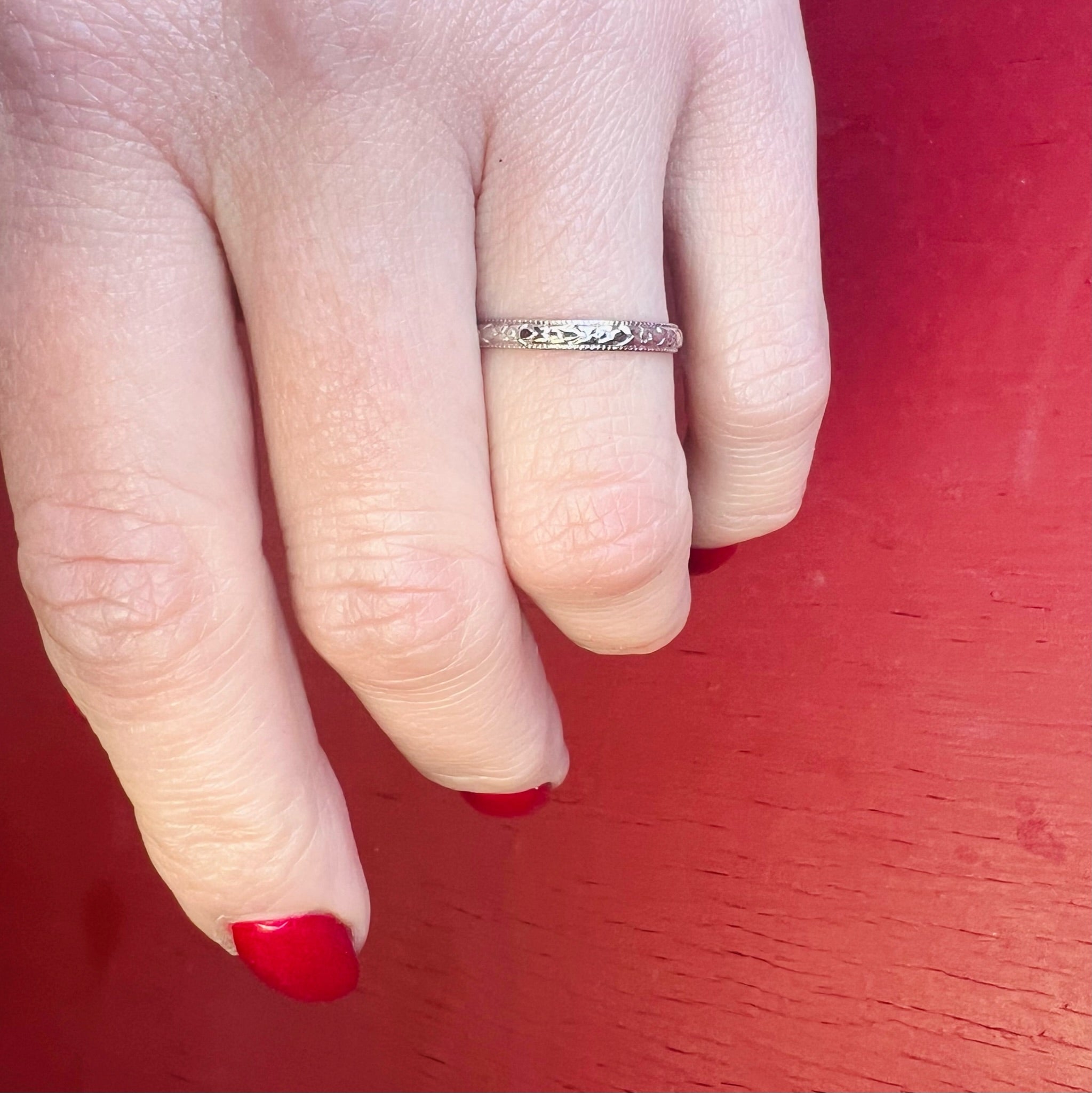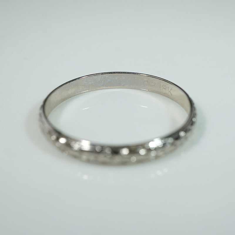 A signed Ostby & Barton band of sweet carved blossoms, bordered with a delicate engraved edge. This bright white 18k gold ring will be a perfect addition to your stack or a romantic accompaniment to your engagement ring. The interior of the band is marked "OB" for Ostby & Barton and 18k. Circa 1920.