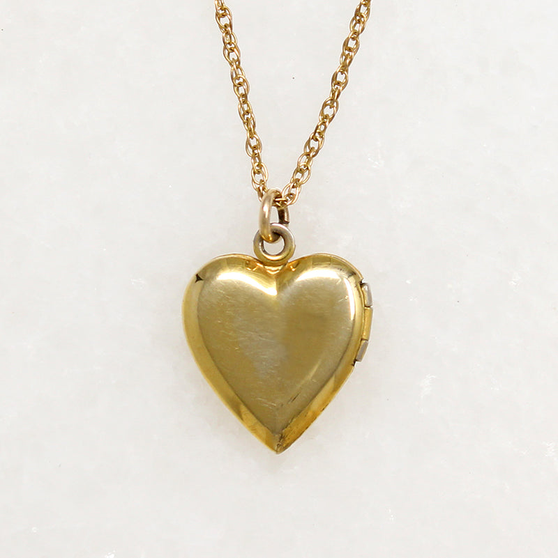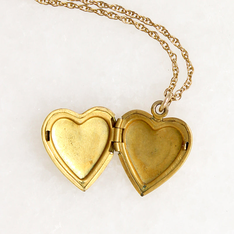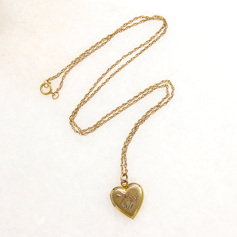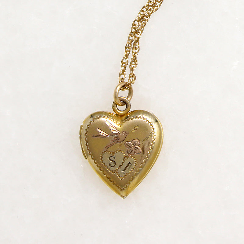 A sweet sparrow is engraved on this adorable heart-shaped locket; the little bird flies over hearts and flowers. The two engraved hearts bear the initials "S" and "I." This small gold-filled locket is fancy on the front and plain and polished on the back. The interior is in clean condition with no frames. A jump ring bale suspends the locket from a gold-filled rope chain. So sweet, the ideal Mother's Day present. Circa 1960.