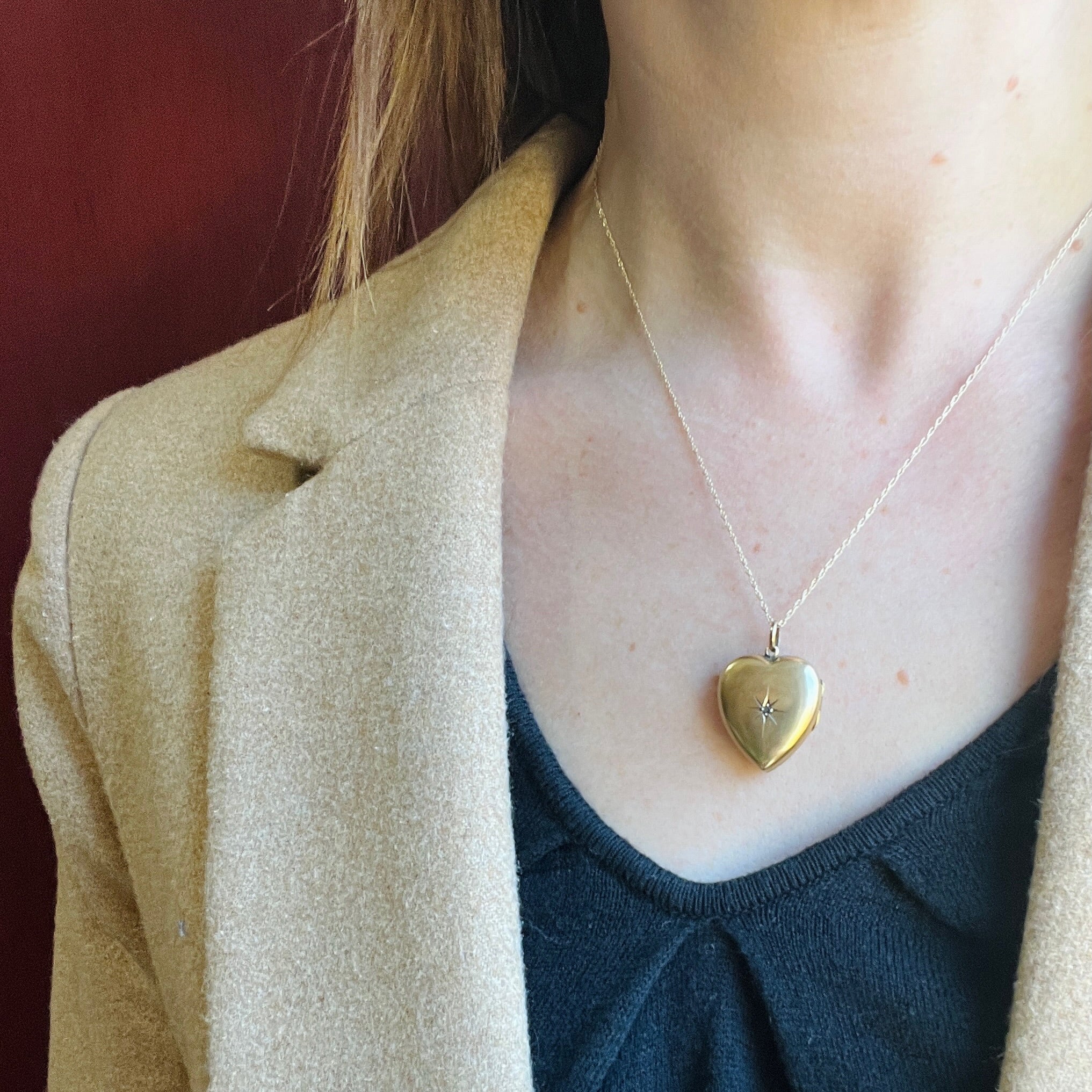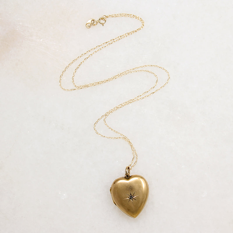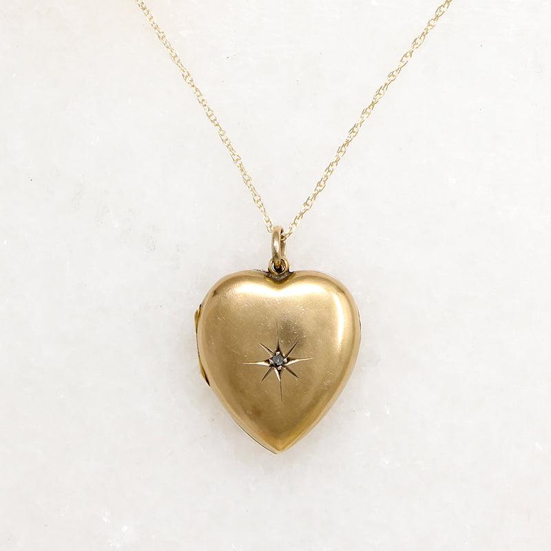 An English heart locket with a single diamond set in an incised star. The back of the locket is plain, highly polished, and stamped "9ct Gold Back & Front," which means the exterior of the locket is 9ct gold while the hinge and interior metal are not precious. The interior of the locket has glass and a frame intact on one side. It hangs on a modern recycled 10k gold rope chain from a simple jump ring bale. A sweet heart for your sweetheart. Circa 1900.
