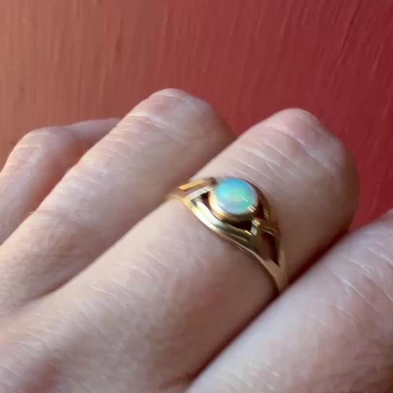 Pretty rosy gold ring set with an Opal cabochon. The band's interior bears Ostby and Barton's mark "O.B.10k." This is the perfect ring for an Ostby and Barton collector. Circa 1910.