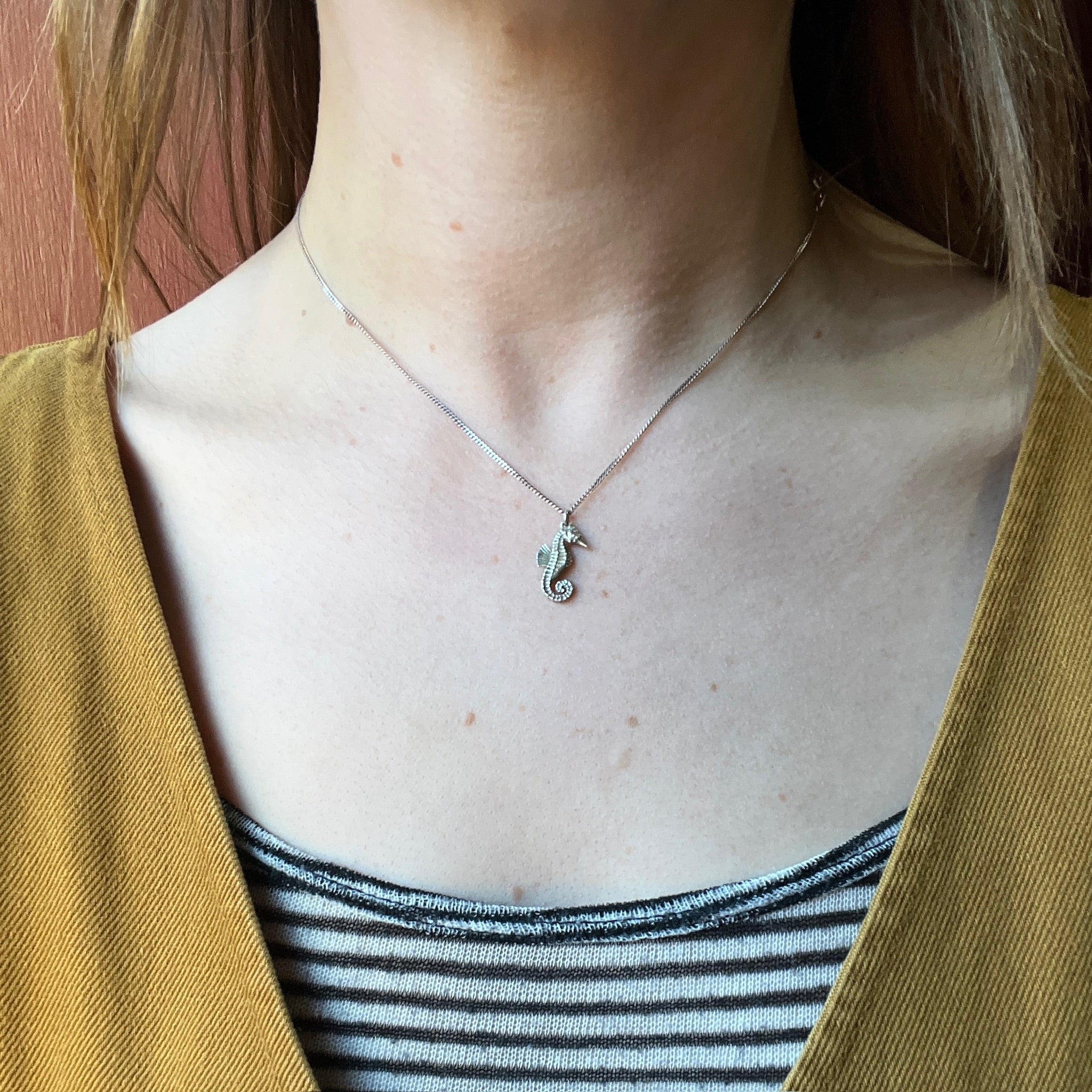 What a sweetie! A wee sterling silver seahorse charm is displayed on a fine gauge cable chain. The sea creature is double-sided and three-dimensional, with great naturalistic detail. This happy Hippocampus charm hangs on a jump ring bale from a recycled sterling silver chain. Circa 1950.