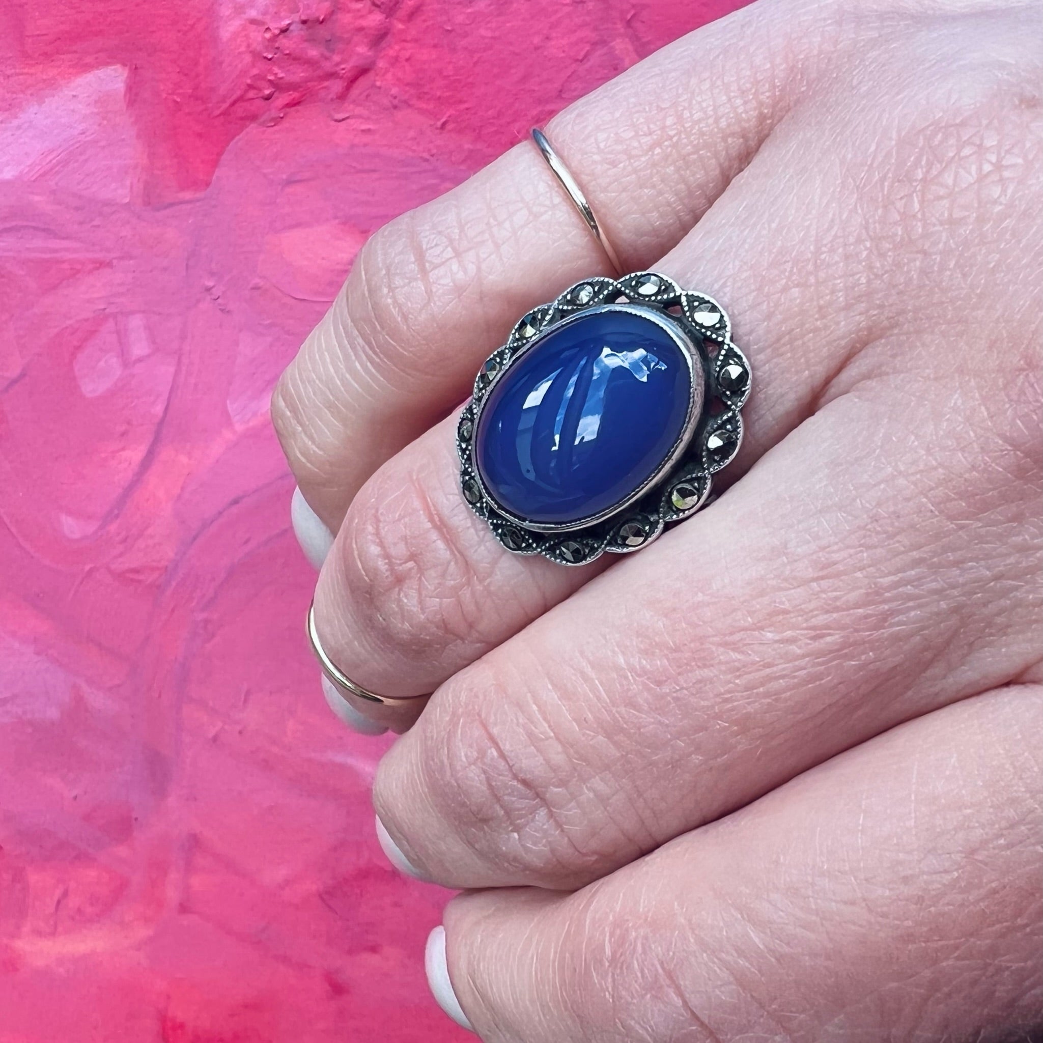 A sweetheart of an Art Deco statement ring set with dreamy lambent blue chalcedony. The oval cabochon gemstone is bezel set within a frame of scalloped sterling silver. The frame is an openwork halo of tiny marcasite-set navettes. The decorative top of the ring sits above fancy shoulders, pierced and engraved with a pattern of spirals and hearts. So romantic, the perfect gift for a lover of Deco style. Circa 1920.