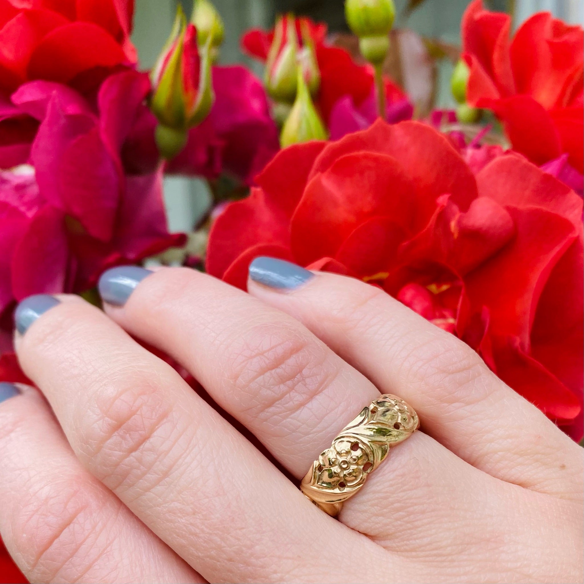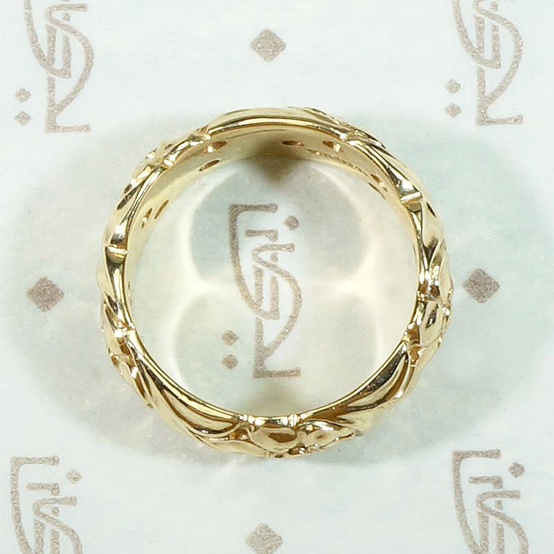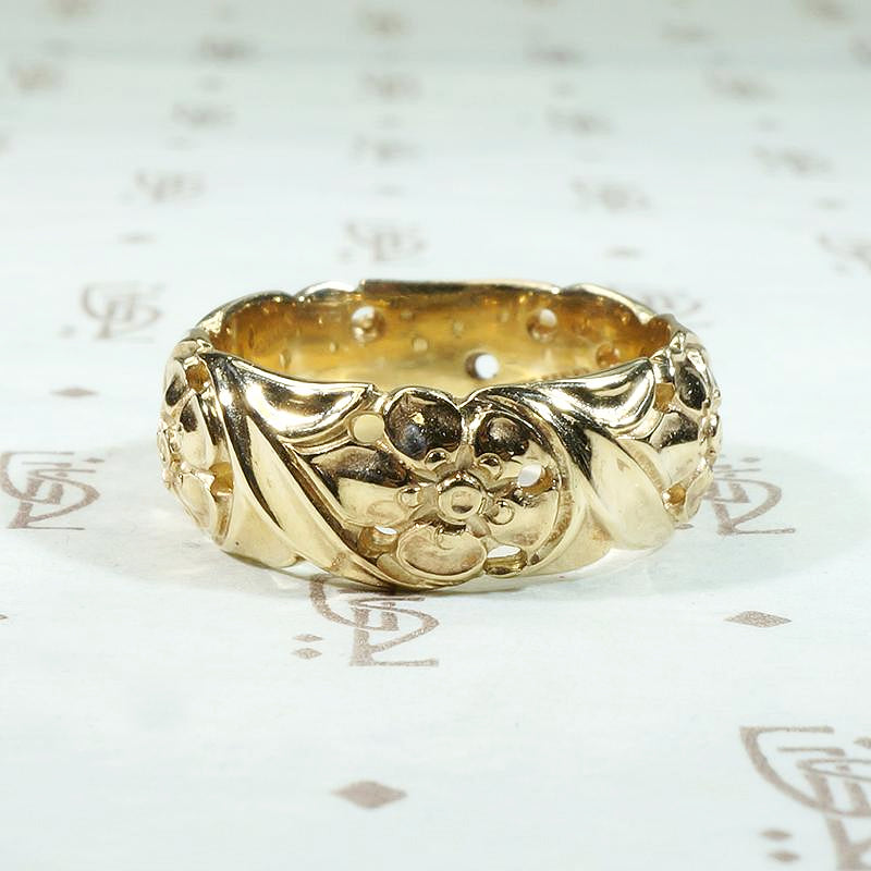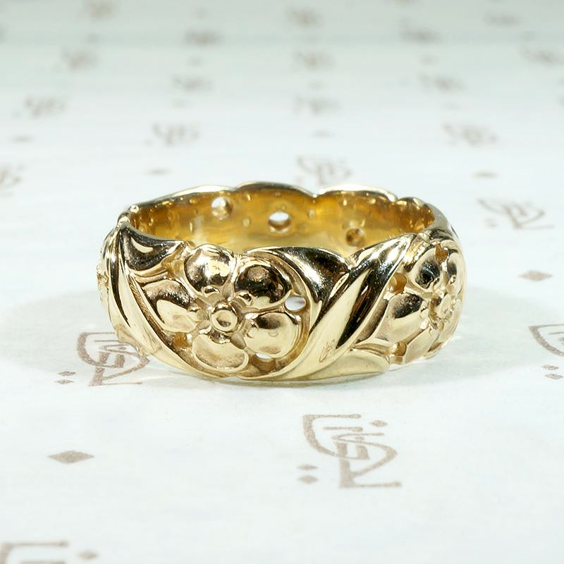 A lovely 14k gold band of forget me not flowers framed in curling leaves. The wide openwork band is sensitively modeled with depth and complexity, each tender petal is sweetly dimpled. This charming piece would make a very romantic commitment ring, the forget me not has long been a symbol of lasting love. Circa 1940.