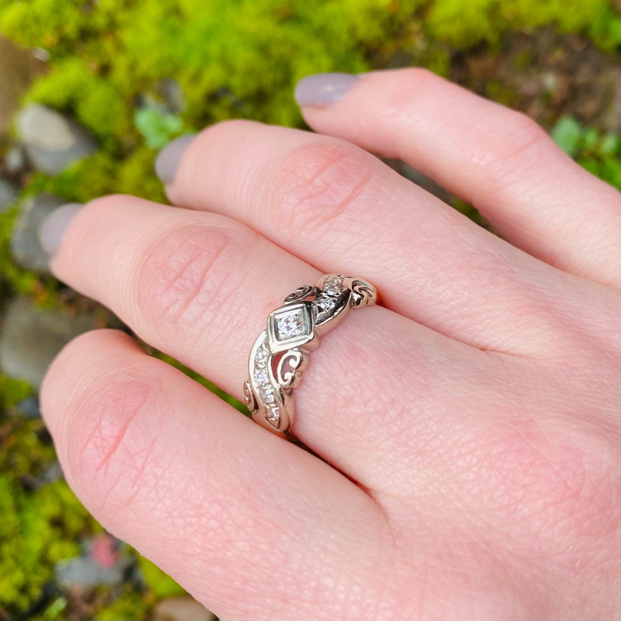 A wonderful vintage two-tone 14k gold band of swirling diamonds. Garlands of diamond-set white gold frame a central diamond in this romantic Retro ring. The nine old mine and old European cut diamonds have an approximate 0.25 total carat weight. The white gold and diamonds sit over a tapered band of yellow gold. This band will make a beautiful wedding ring or add color, sparkle and drama to your stack. Circa 1940.