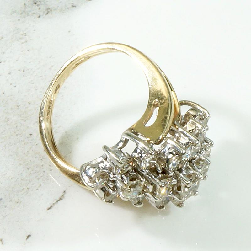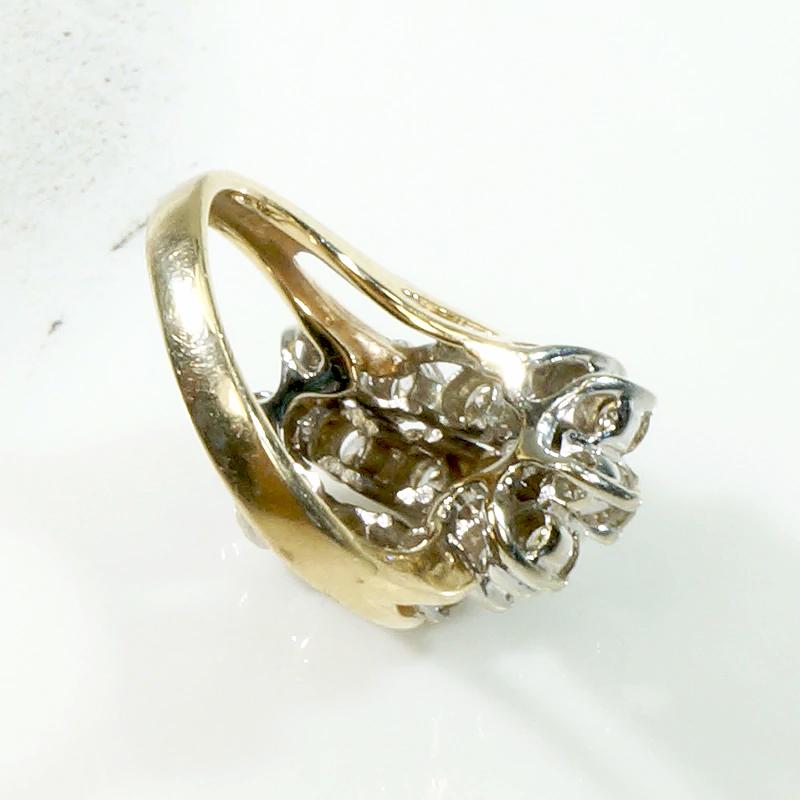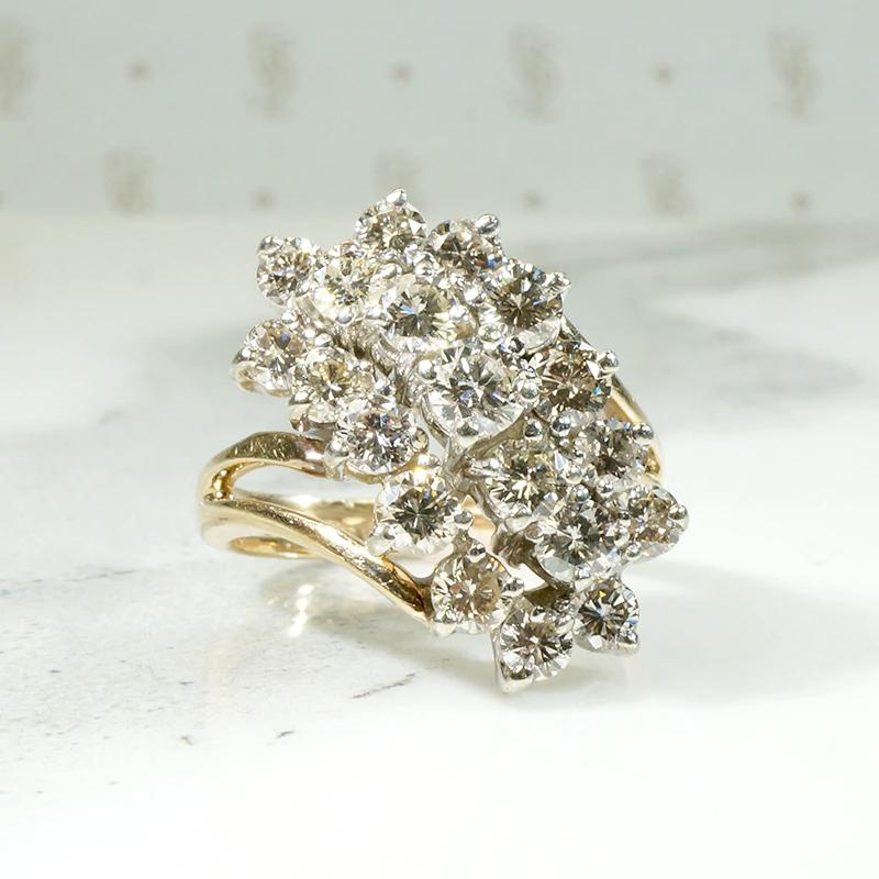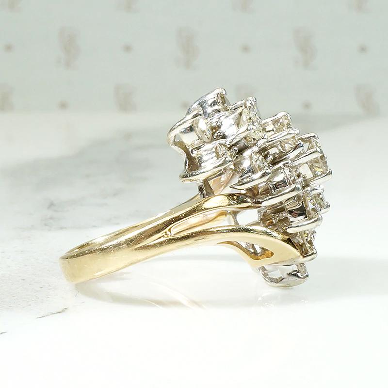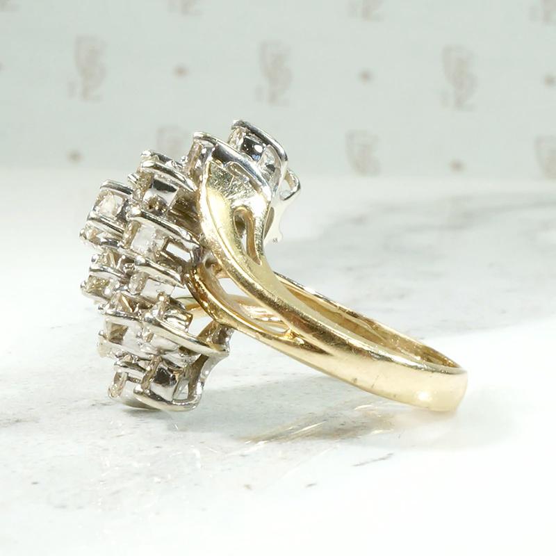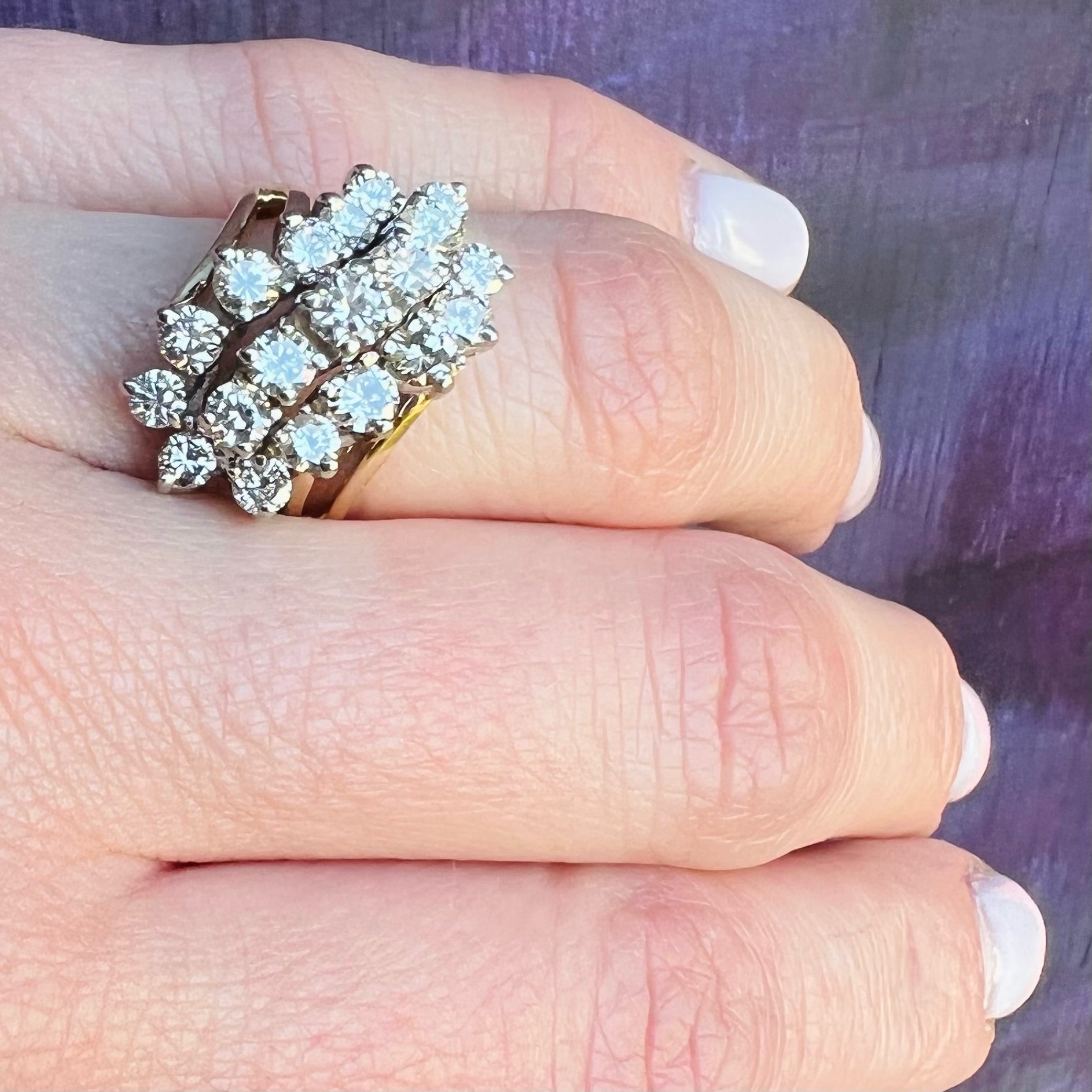 A swooping cluster of glittering diamonds flows across the top of this vibrant vintage ring. The little round diamonds have a total weight of 1.50cts and are set in 14k two-tone gold. The diamonds are set in tiers of white gold prongs above yellow gold curved, split shoulders that taper into a slim band. This scintillating piece will make a dazzling anniversary gift, right hand ring or unconventional engagement ring. Circa 1980.