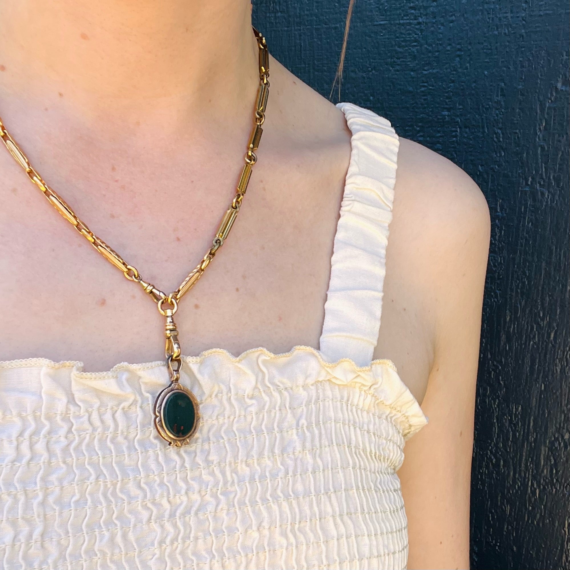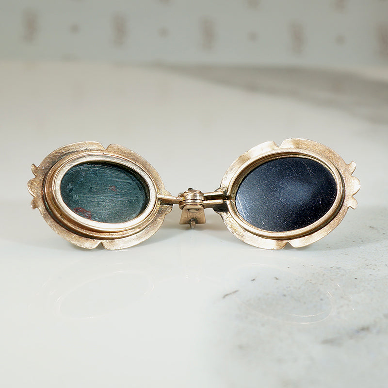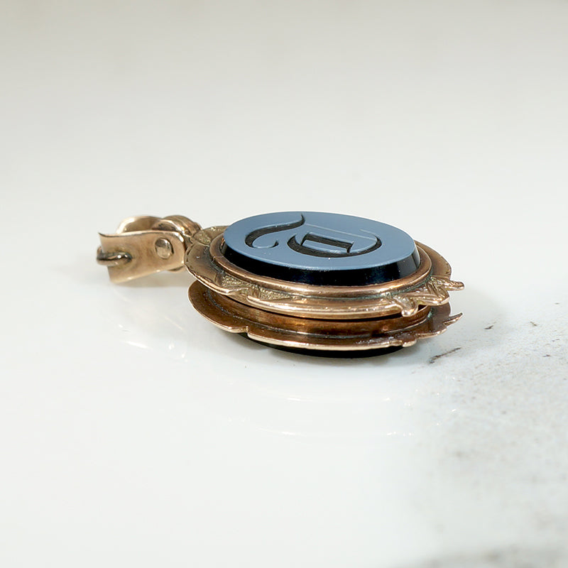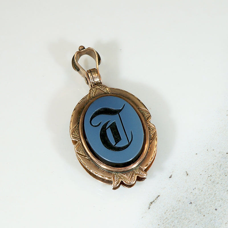 A double-sided Victorian locket with agate and bloodstone in an engraved gold frame. The front of the locket is an oval of banded agate. Its edges are beveled and the letter "T" is engraved in Old English script. The back is an oval bloodstone, also with beveled edges. The 10k gold frame is engraved with classically Victorian patterns. The heavy, ornate swiveling bale doubles as the locket's hinge, a fine detail. The interior of the locket is in very nice condition with no glass or frames. This locket will look great worn on your watch hook chain or one of our Ancient Influences married chains. Circa 1890.