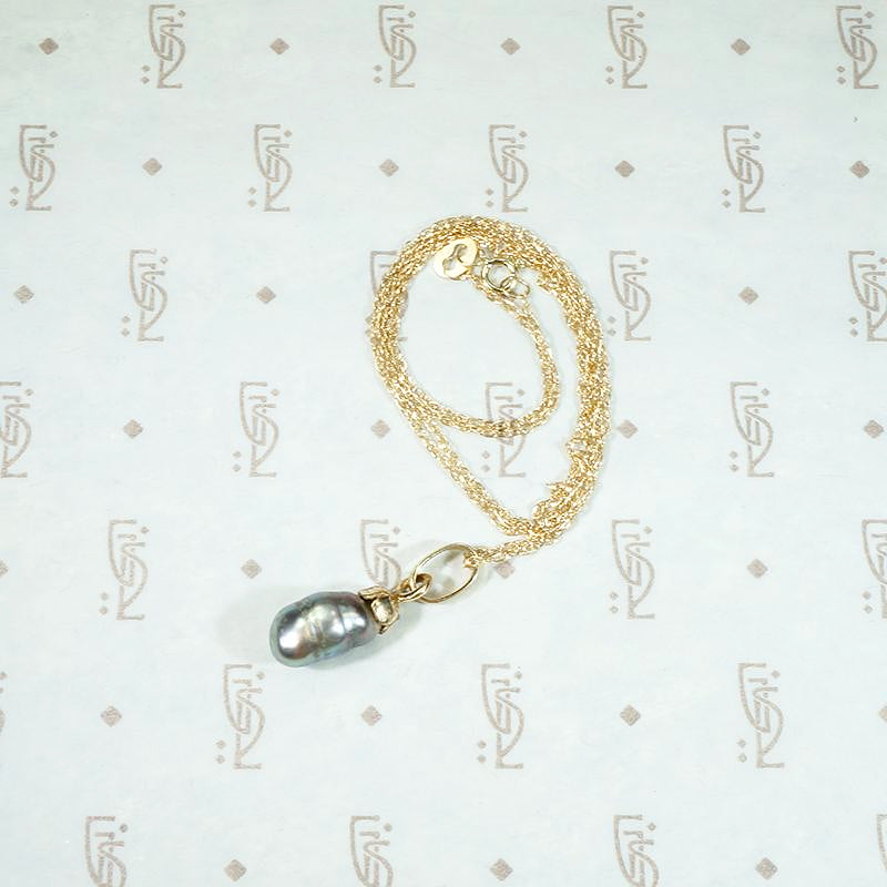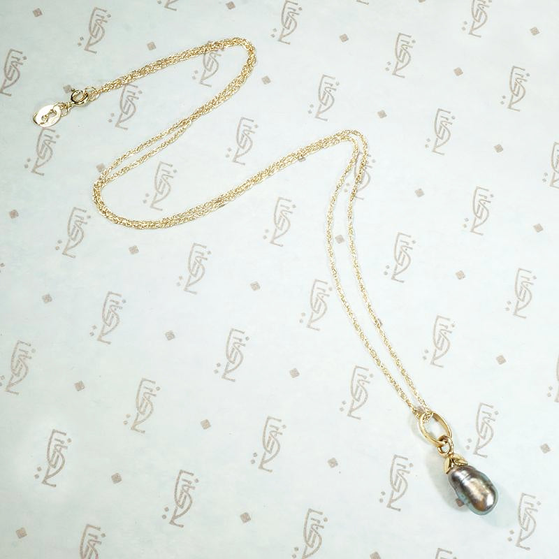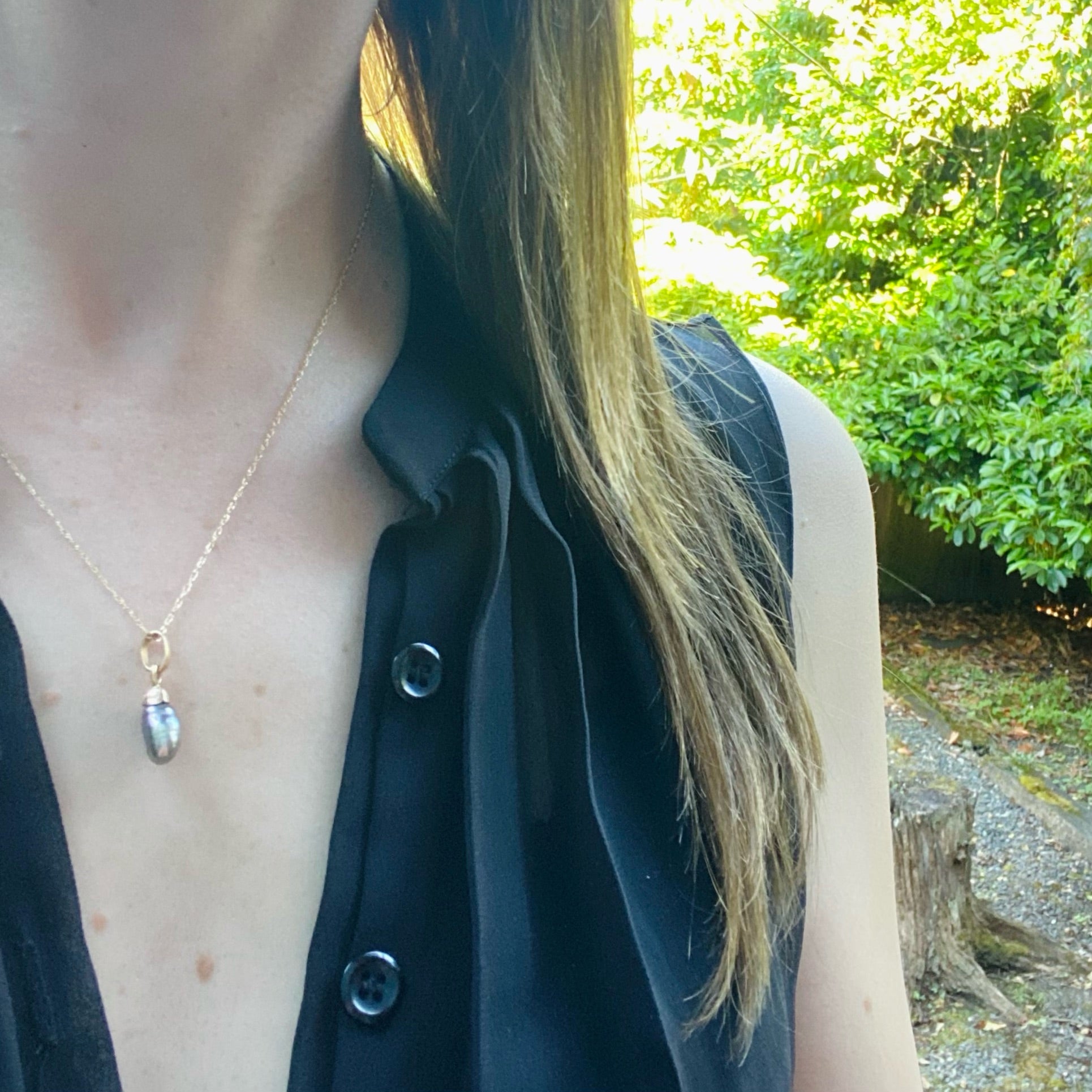 Pearls are classic wedding jewels, and this black Tahitian pearl pendant would make a brilliant twist on the traditional wedding necklace. The vintage baroque pearl is capped in 14k yellow gold, suspended on a large ring bale. Elegant, with a moody Bohemian flair. This necklace will look gorgeous worn with a formal gown, with a bikini or with anything in between.