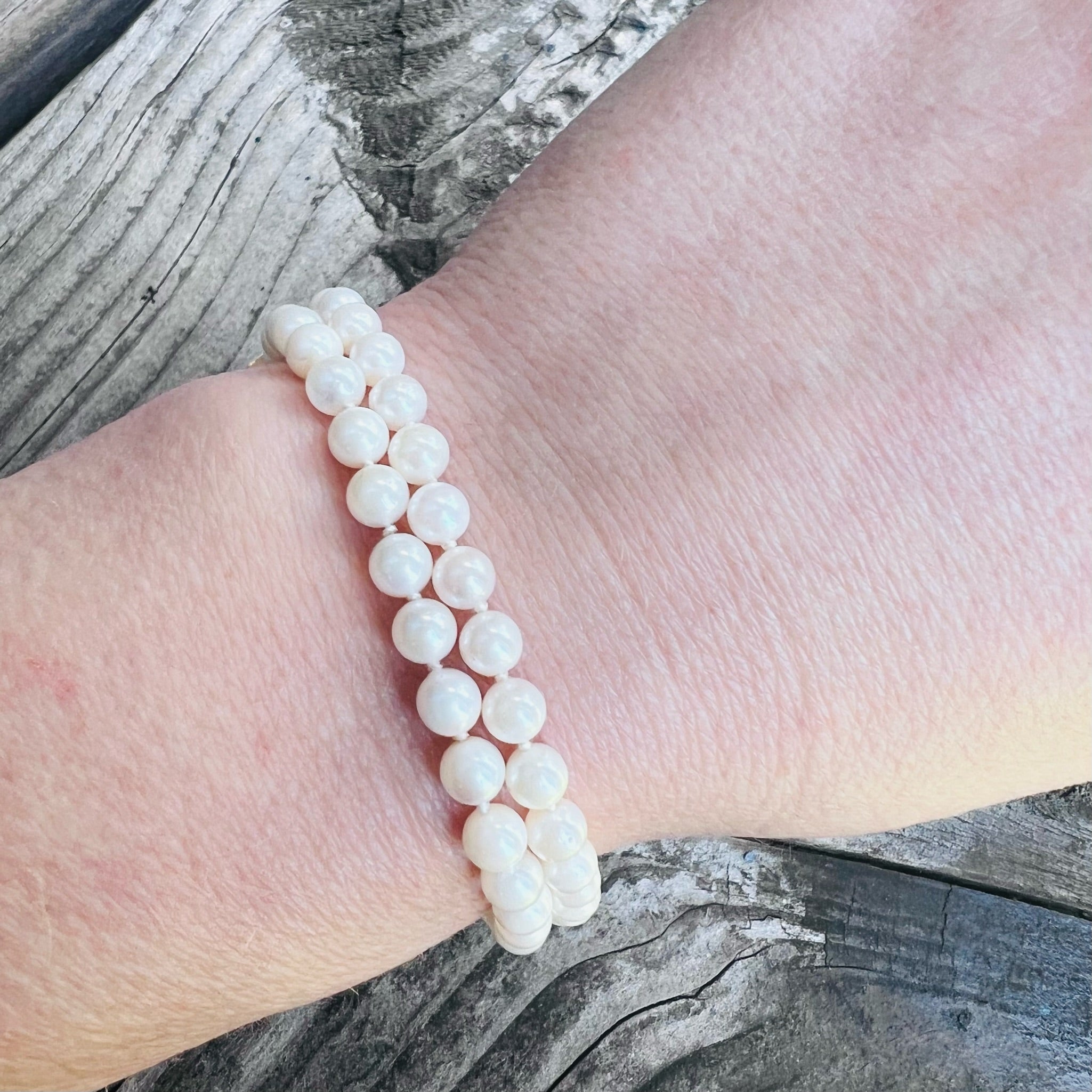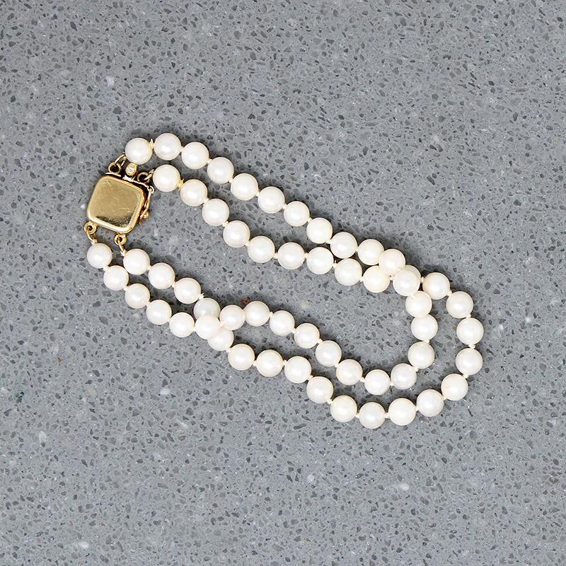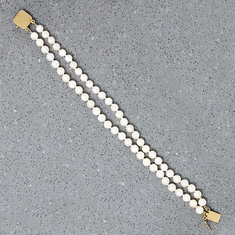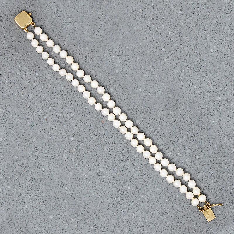A pretty double strand pearl bracelet with a crisp, classy look. The cultured pearls are very white, hand knotted on white silk. The slide clasp is a sleek cushion of 14k yellow gold with a safety latch for extra security. Timeless and versatile, this bracelet is ideal paired with a business suit or a bridal gown. Circa 1980.