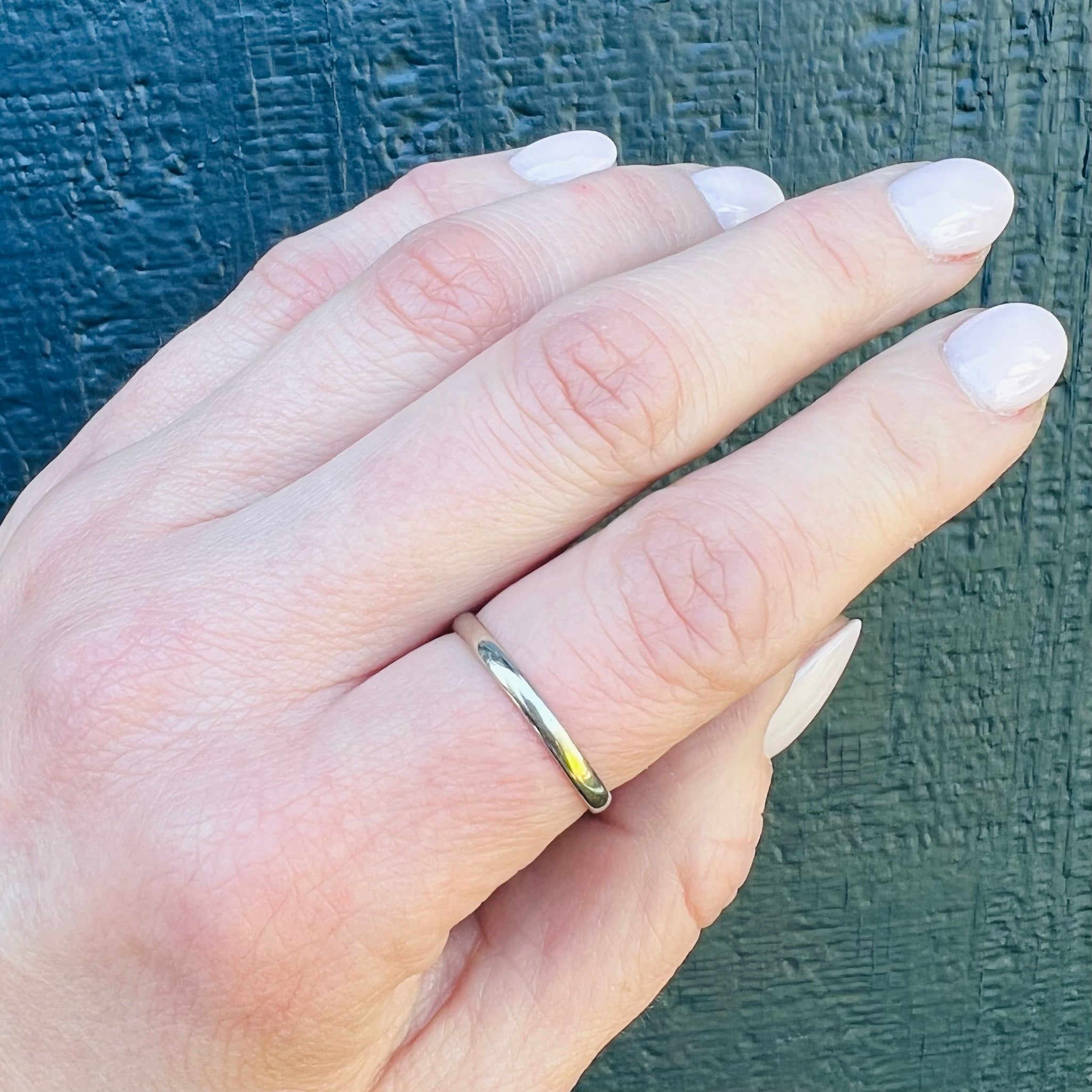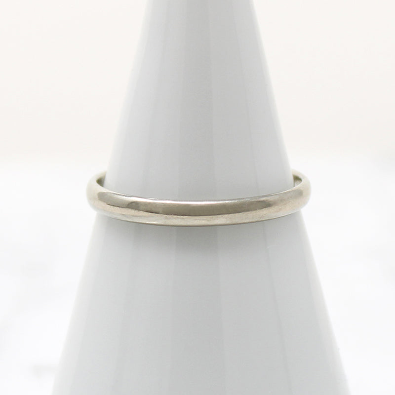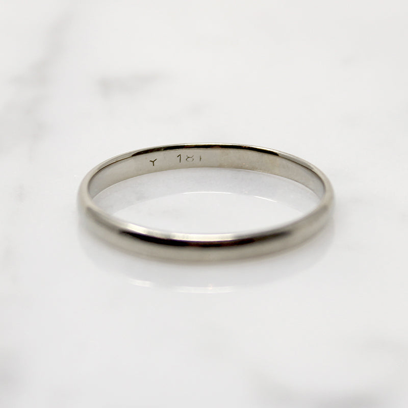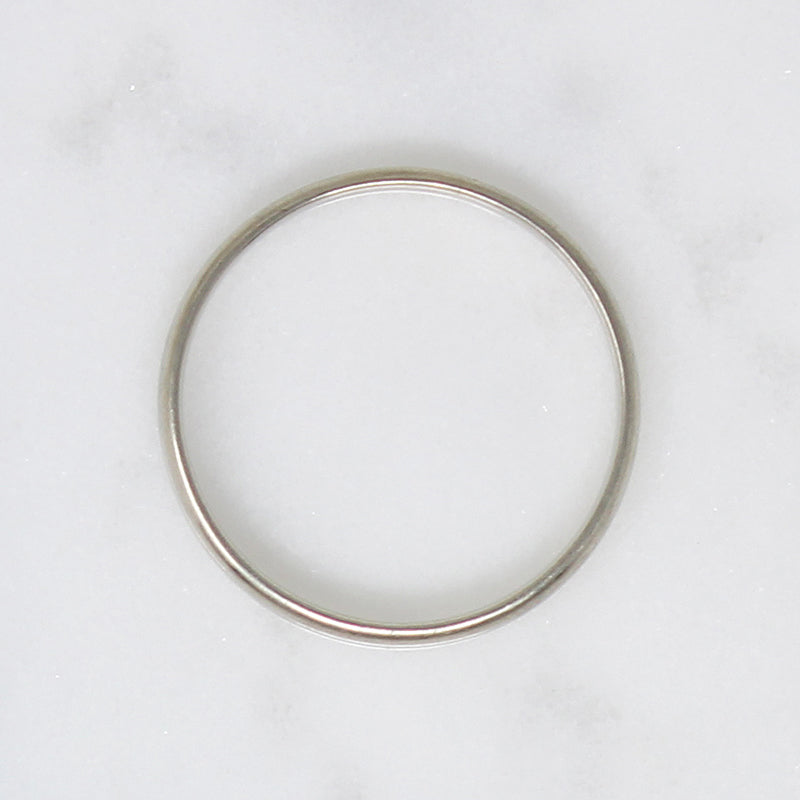 An elegant 18k white gold band. The narrow band has a flat interior and a half round exterior with a bright, high polish. Timeless and tasteful, this Deco era wedding band is a subtle beauty. Circa 1920.