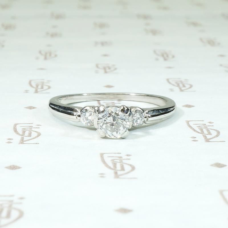 This classic 1940s three stone diamond engagement ring has the sleek and modern aesthetic we love in Retro design. The sparkling 0.38ct old European cut diamond at the center shimmers with light, and the two flanking diamonds adds beauty and balance. The center stone is set in a four-prong head over pinched and sculpted shoulder. Elegant and tasteful, this is a wonderful choice for the sophisticated vintage lover. Circa 1940.