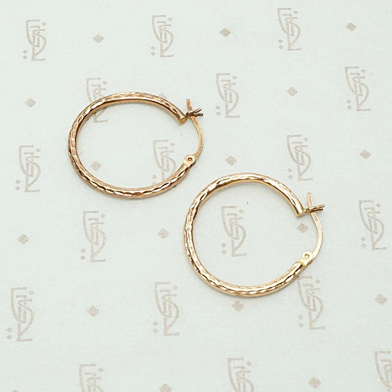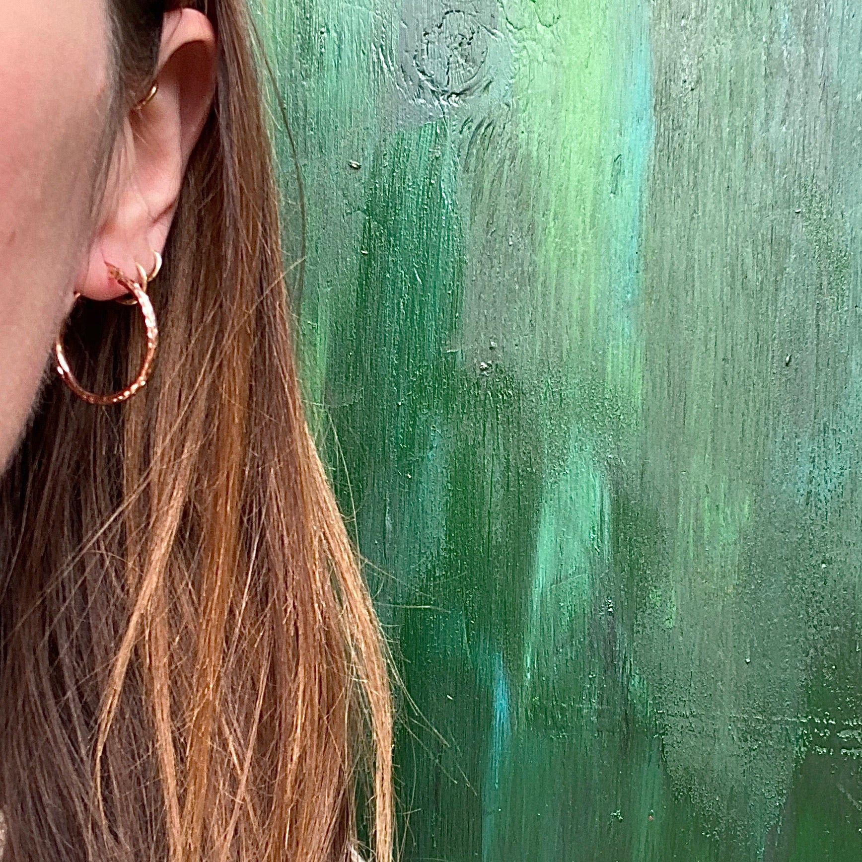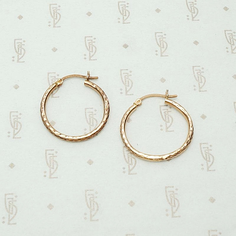 These 14k rose gold hoops have a hammered, grooved texture. The hoops are hollow so they are lightweight and comfortable to wear, with hinged bar tops. Glittery and shiny, these will look great with everythingCirca 1980.