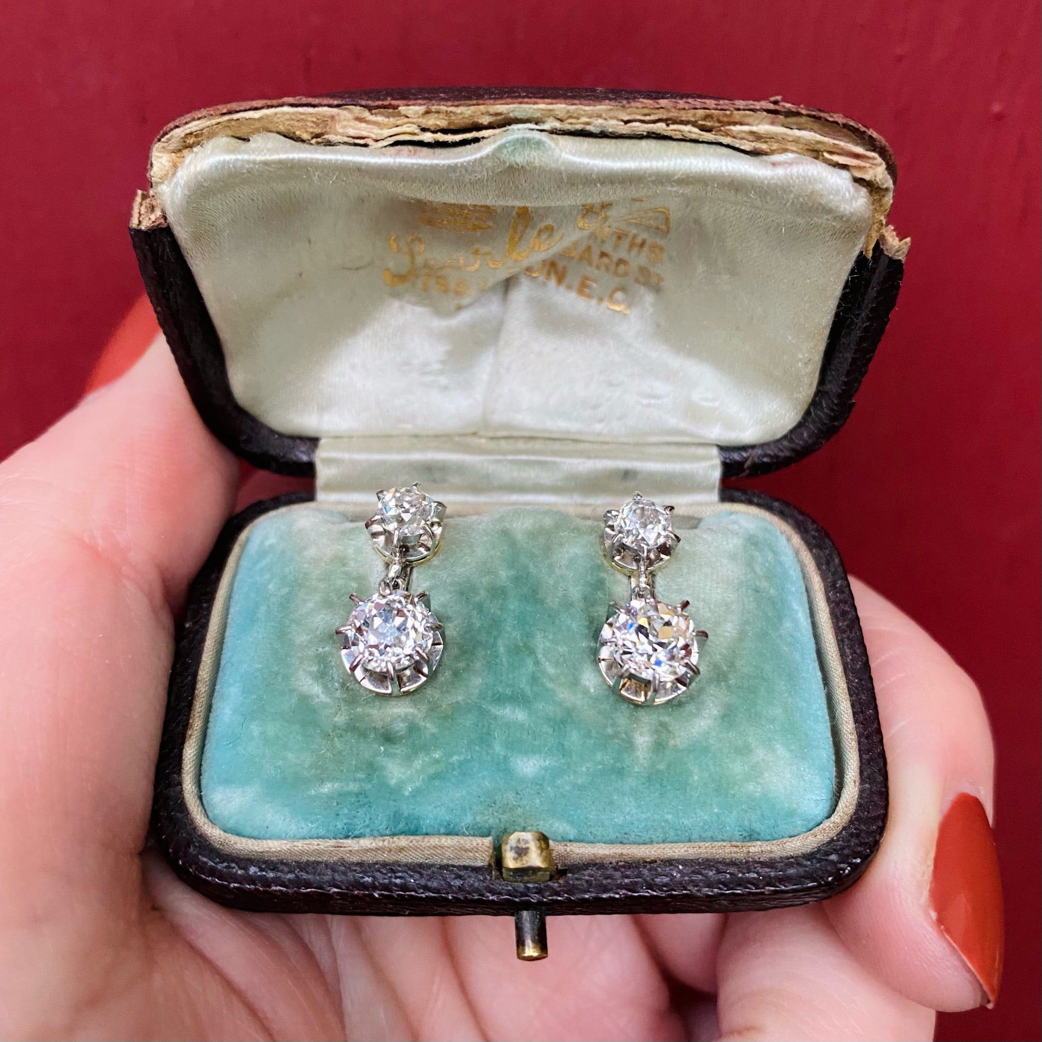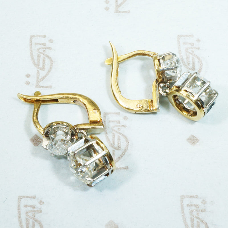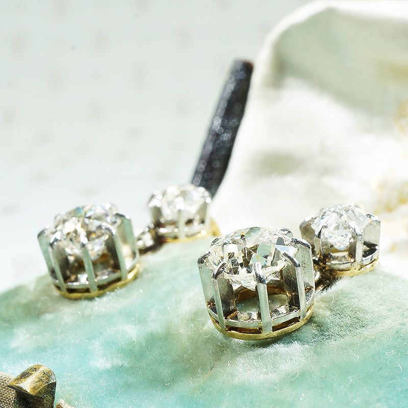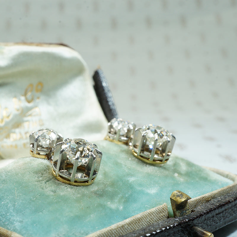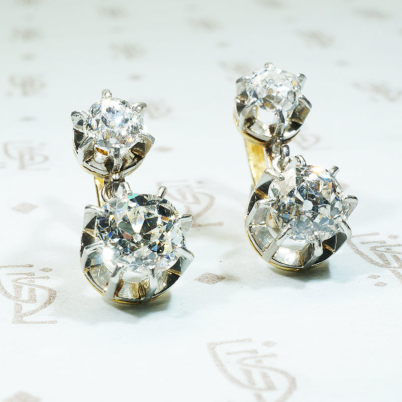 The French make such lovely jewels. A fabulous pair of antique French Diamond Drop earrings are always at the top of my wish list and this unbelievably beautiful pair does not disappoint. The settings are Platinum on 18k yellow gold and have French hallmarks on the posts. The post and hinged back are an early version of what we commonly know as lever backs, and add a desired level of security to these lovelies. The Diamonds are Old Mine Cut and SI/H-I Giving a brilliant sparkle to them no matter the light. The diamonds have a total carat weight of 1.85. The way the diamonds are set in these beautifully crafted earrings let the light stream in from all angles throwing rainbow sparkles everywhere. This pair of earrings was made in France and sold in London, they are in their original box, the box is a bit worse for the wear but still quite lovely. Circa 1900.