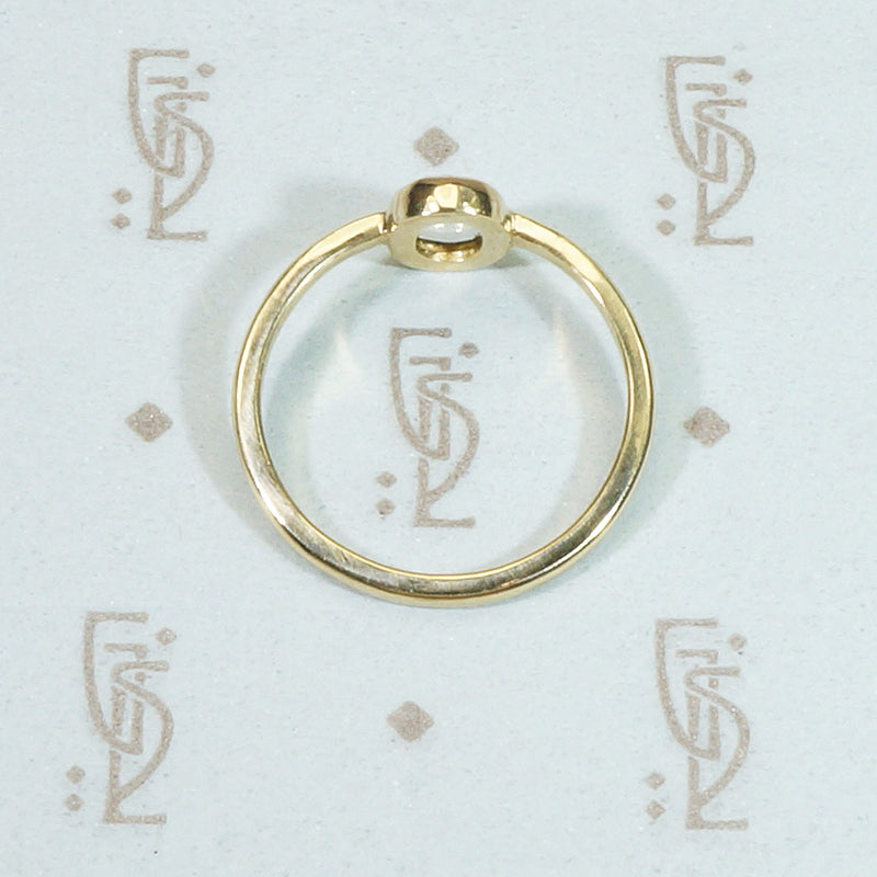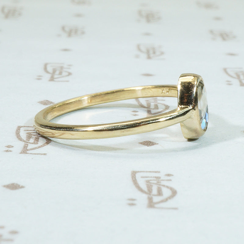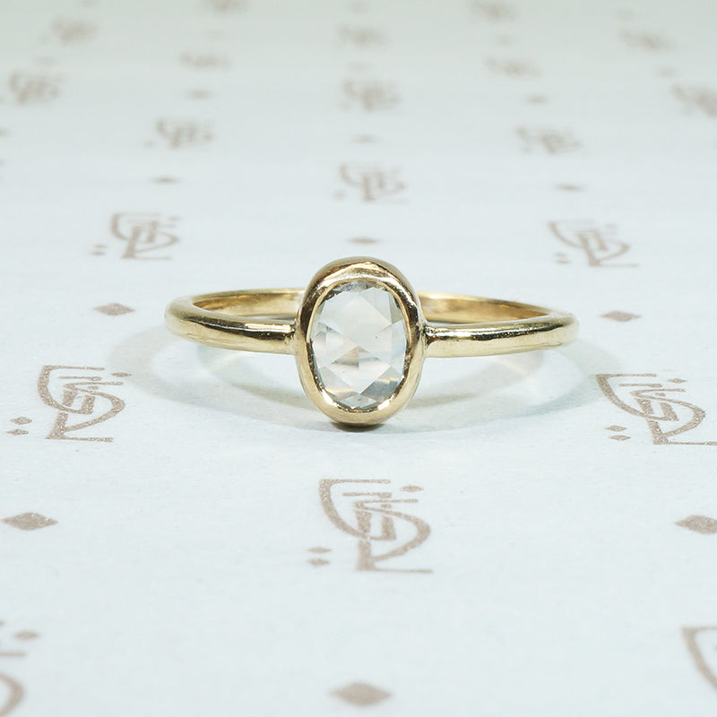 Our lovely oval antique rose cut diamond is bezel set simply in recycled 14k yellow gold with a slim band. Unique this ring was Lovingly handmade in our studio to fit its stone. The diamond is .45 points. The diamond sits very close to your finger making it quite practical and easy to wear.