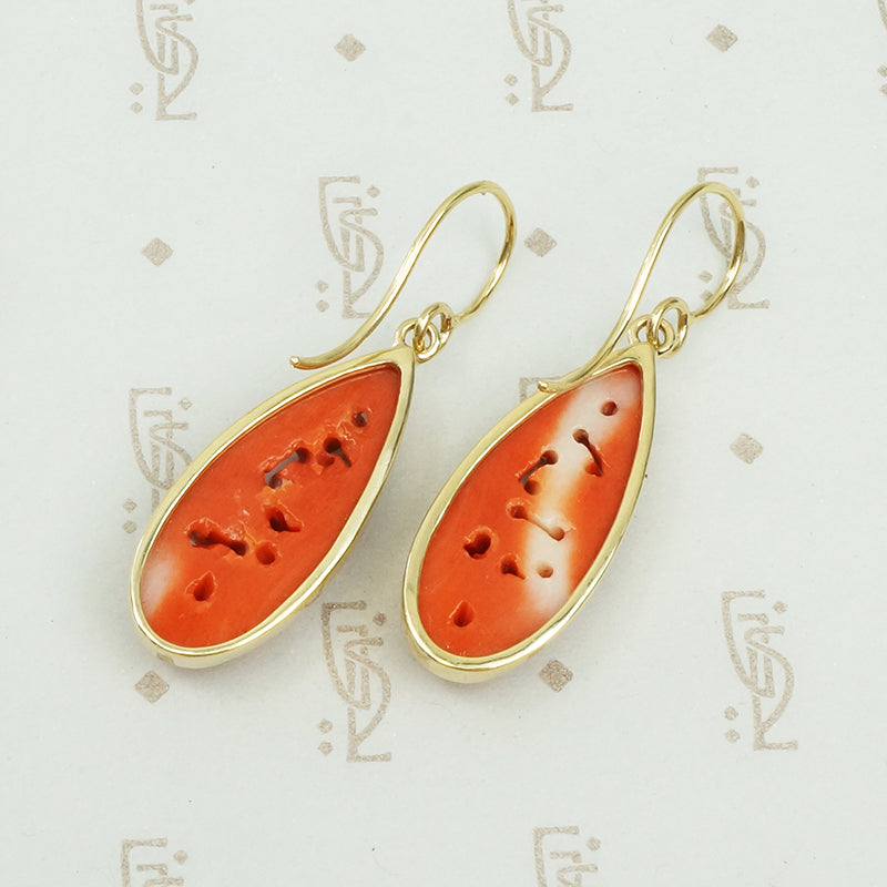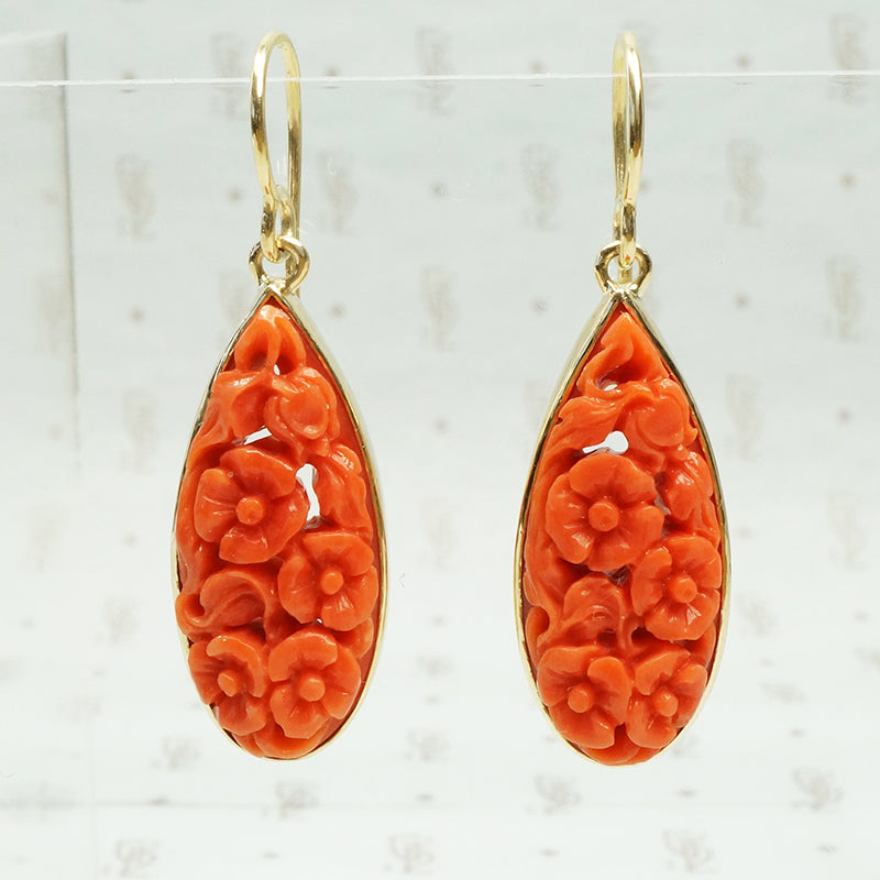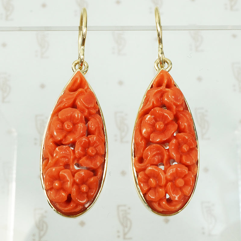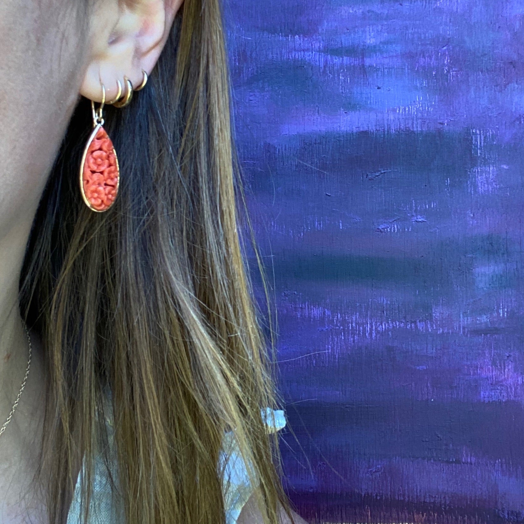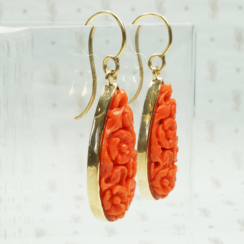 When I first spied this pair of antique carved coral teardrop shaped gems I gasped. The amazing quality of the carving, the perfect natural red shade of the coral, and in excellent condition, a rare find indeed. I knew at once I wanted to craft a simple elegant pair of earrings and suspend them from hand drawn ear wires that have all the right curves so they hang perfectly from your lobes. These chubby arched ear wires are hand made to be identical to a pair on my favourite antique earrings, they hang just right and stay put. The yellow gold is 14k recycled and it is just perfect with the coral. The lovely carved coral pieces date from circa 1900 and feature a cascade of floral blooms.