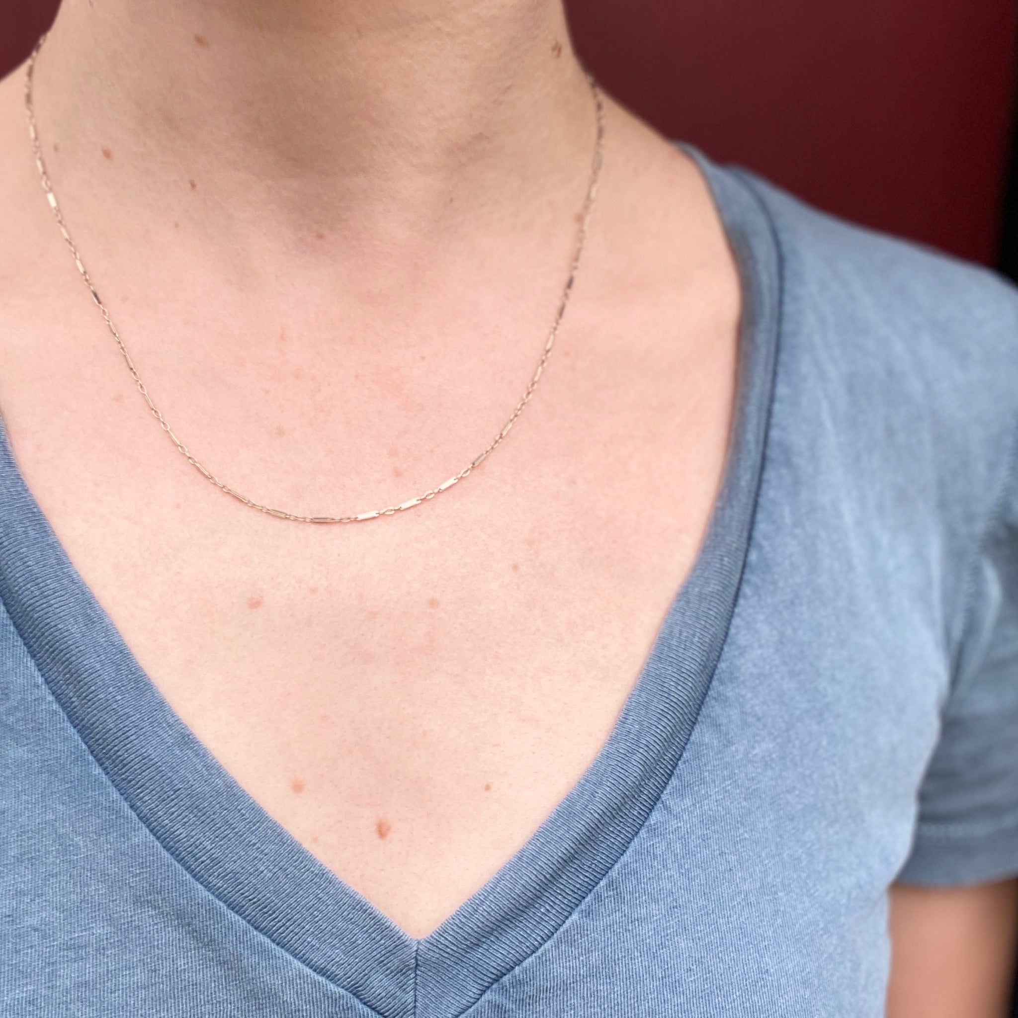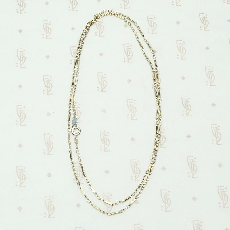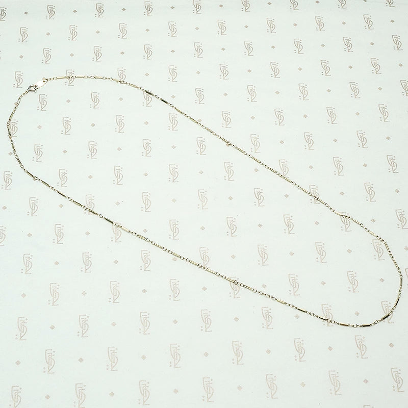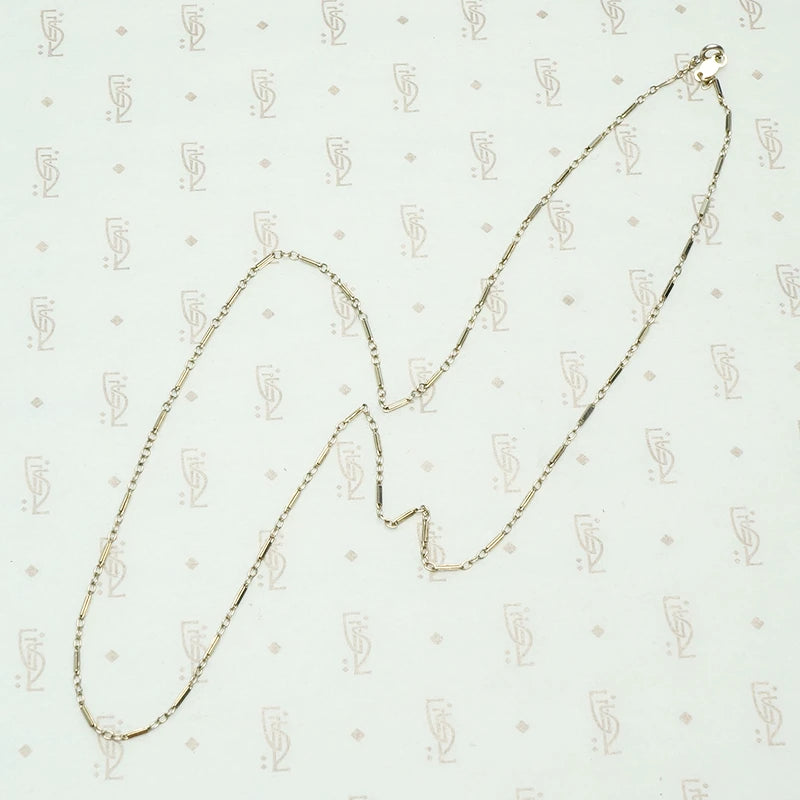 Delicate beauty for your necklace stack. This lovely 14k greenish yellow gold chain has alternating faceted bars and round links. Pretty with just the right amount of detail circa 1930.