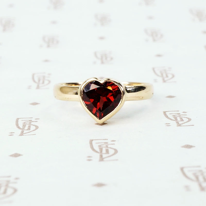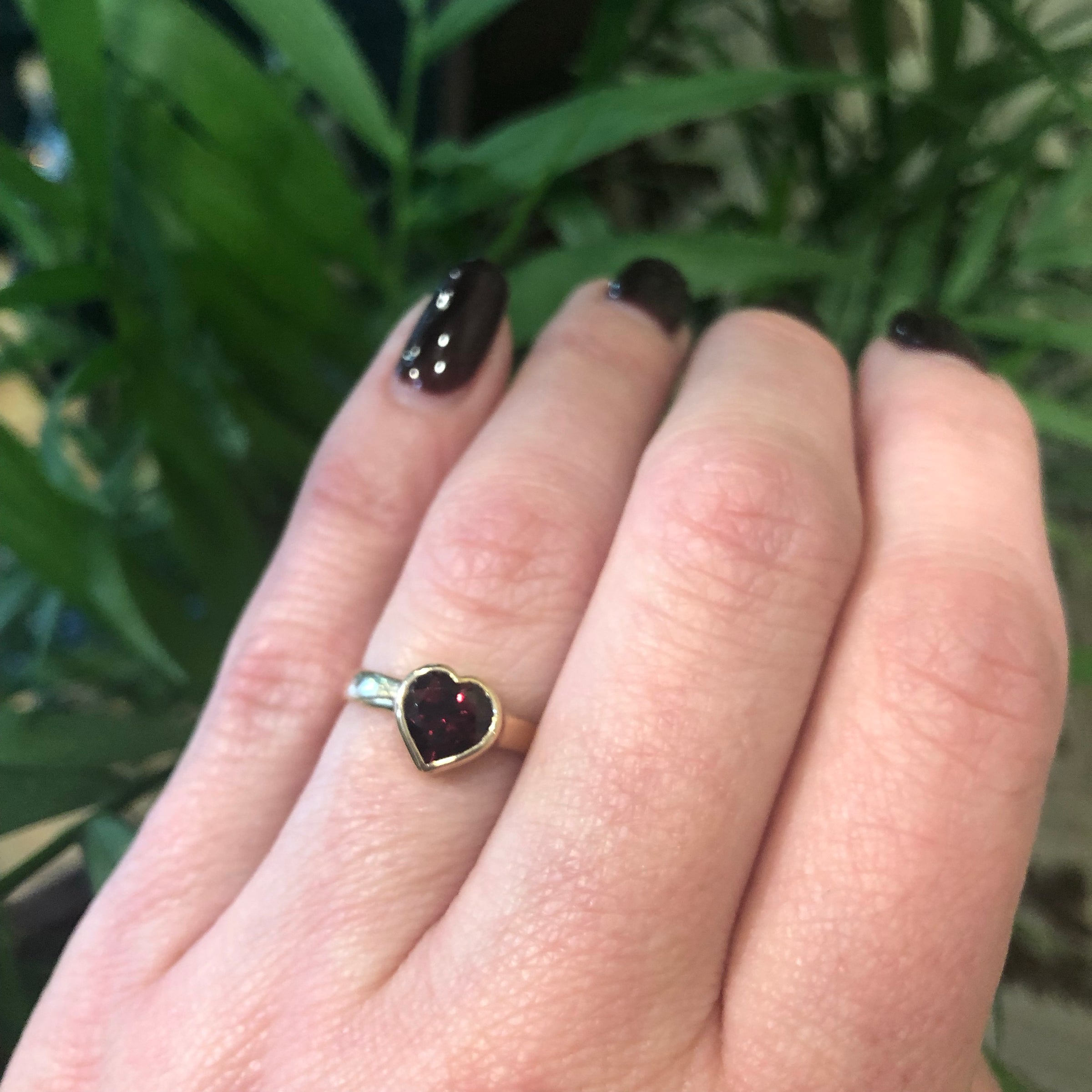 Details.....Currently a Size 6. The ring may be sized up or down two sizes free of charge. Please contact us if you need this ring sized more than two sizes, it may be possible and will have a small fee. The ring measures 7.7mm x 7.8 at the garnet heart and the band is 2.6mm wide.