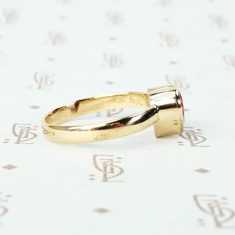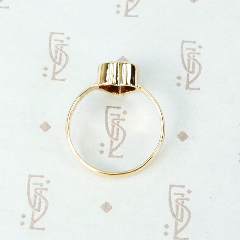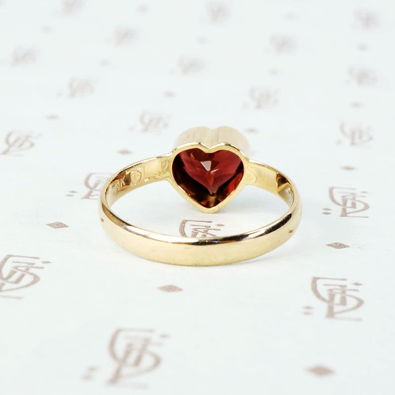 Simple and true as a heart should be. This ring was crafted by hand with love, a simple gold bezel holds the natural garnet heart shaped gem in its embrace. The garnet is 1.53 carats. What a perfect token of affection, for centuries garnets have represented passion. Wear your heart on your hand. Love the Planet.