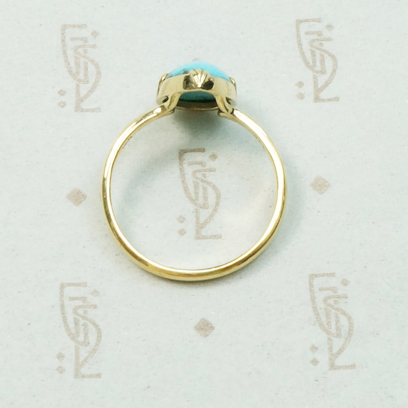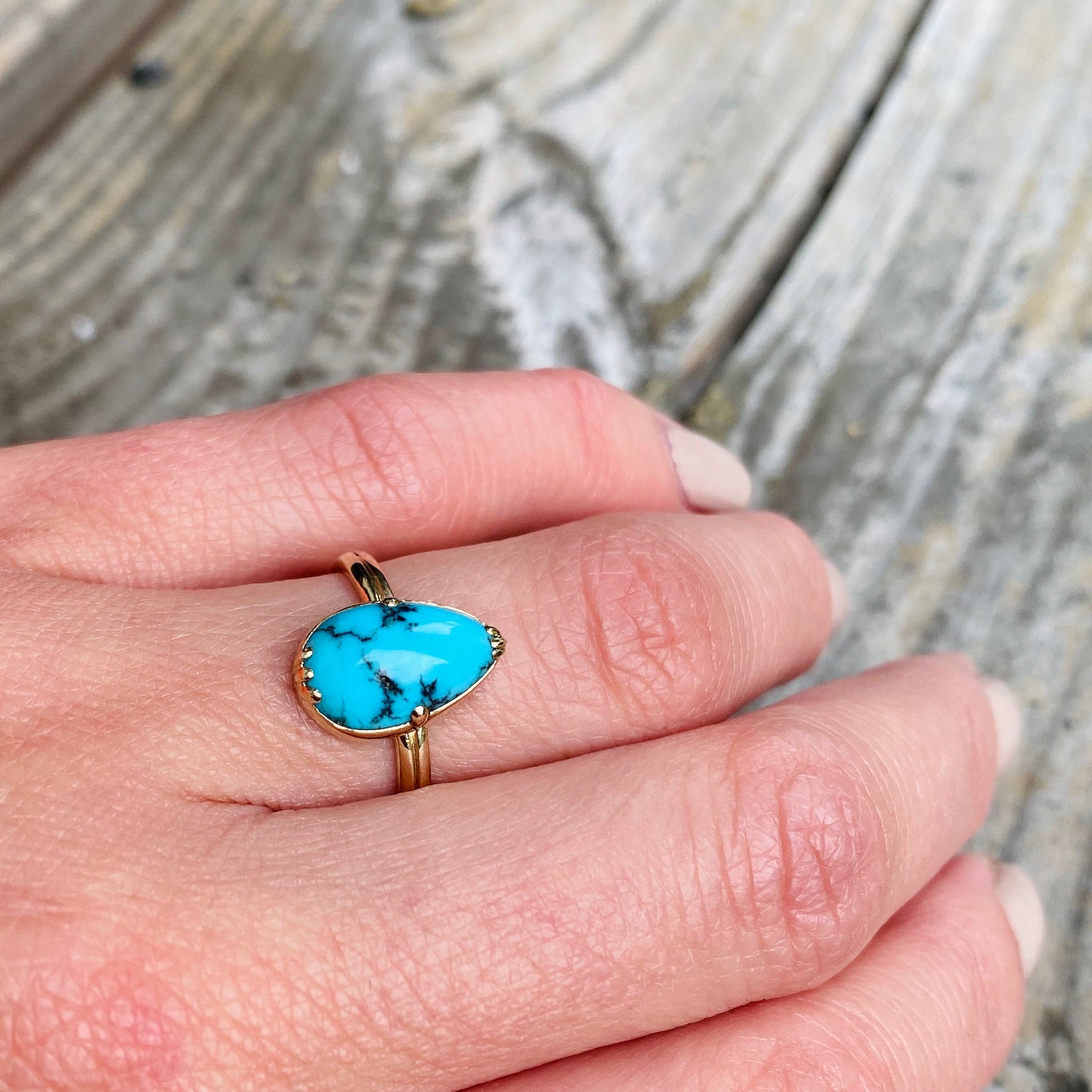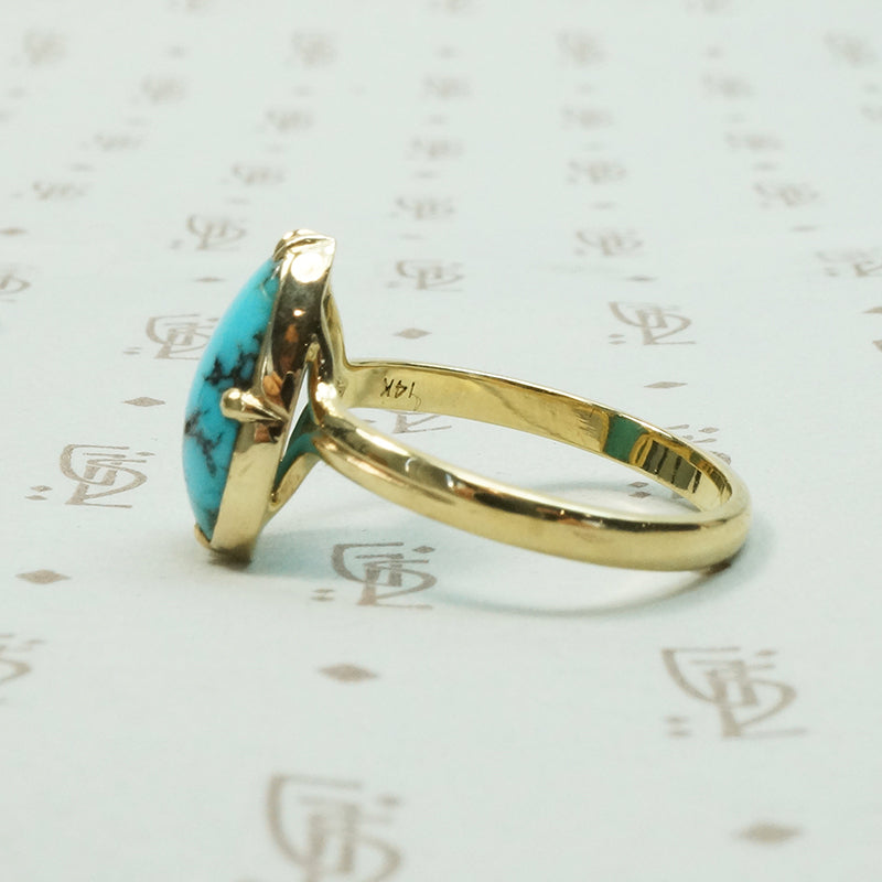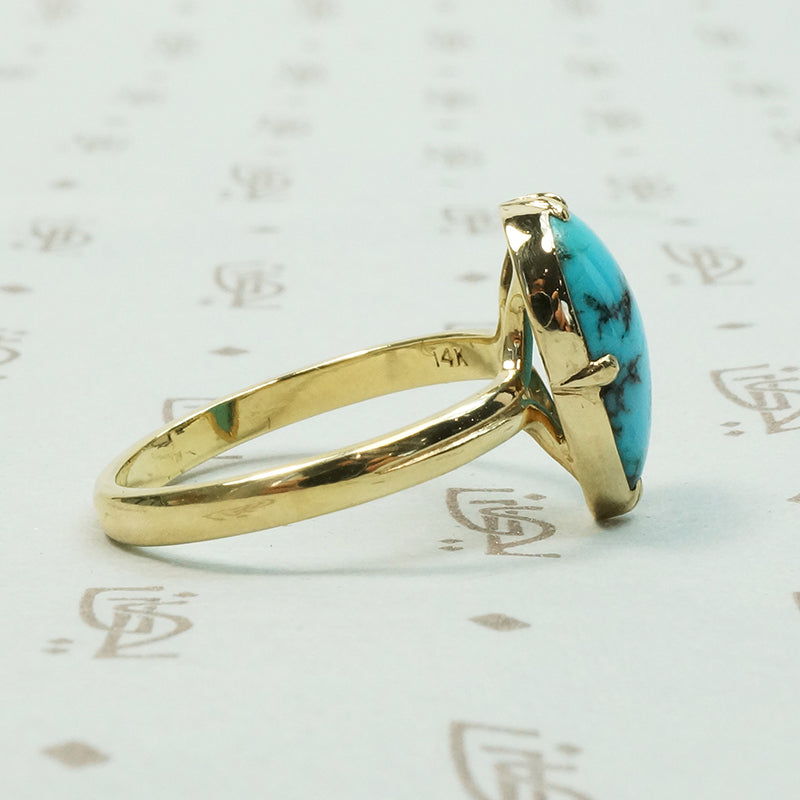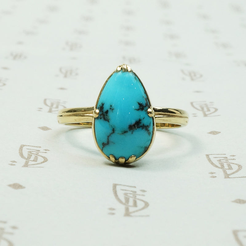 Kingman turquoise is dramatically beautiful, the black veins showing the brilliant blue off so wonderfully. One of my personal favourite settings that we make in our workshop is the Georgian style 3-1-3 and it was just the perfect choice for this pear shaped natural turquoise. The elegant setting is crafted of recycled 14k yellow gold. Made by hand in our in house studio this line is designed for beauty and comfort. We only use recycled gold and vintage gems.