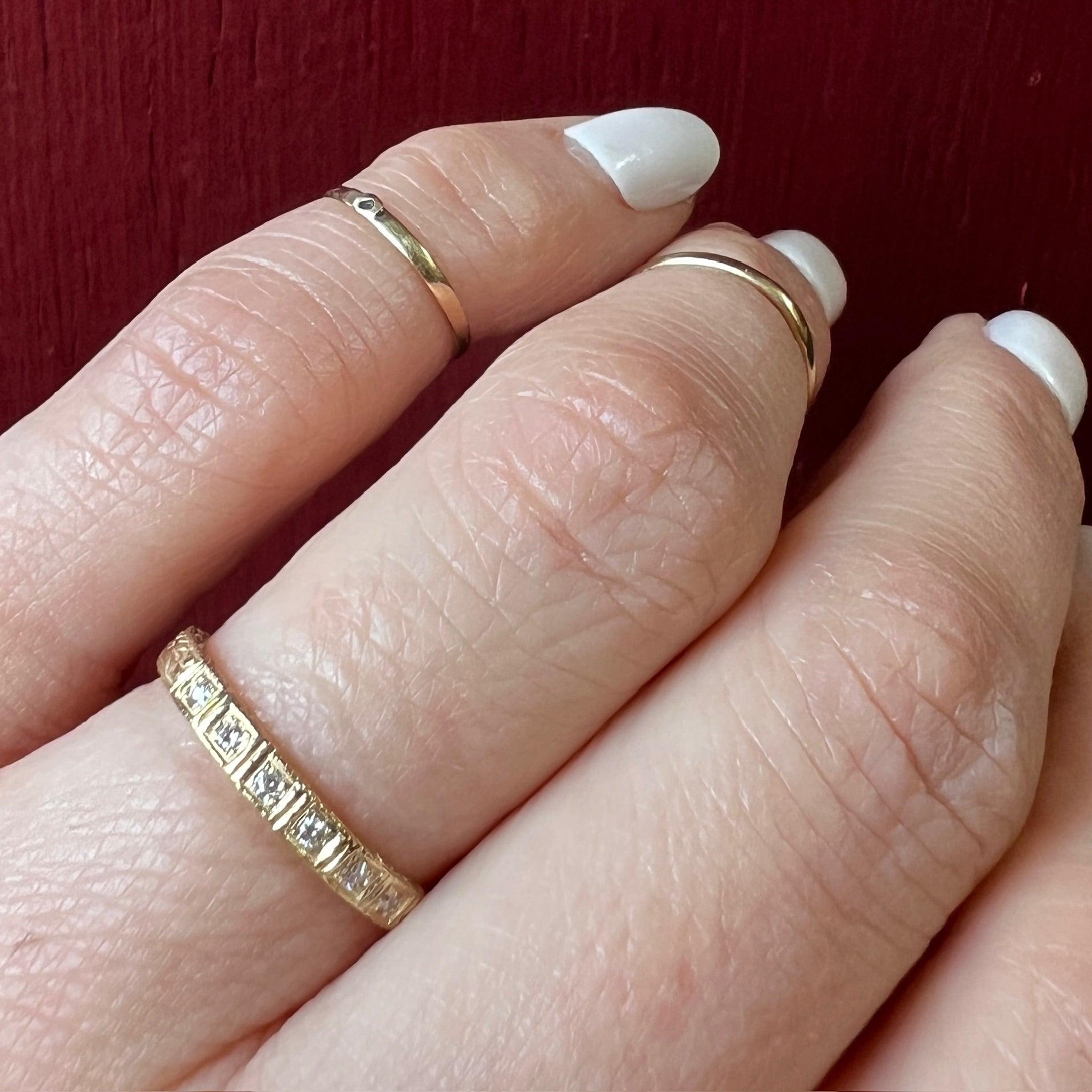 Hand cast from an original vintage 1932 wedding band, this ring is made by us using recycled gold. It measures 2.4mm wide. Size 5.5, sizing may be possible please email us to check.