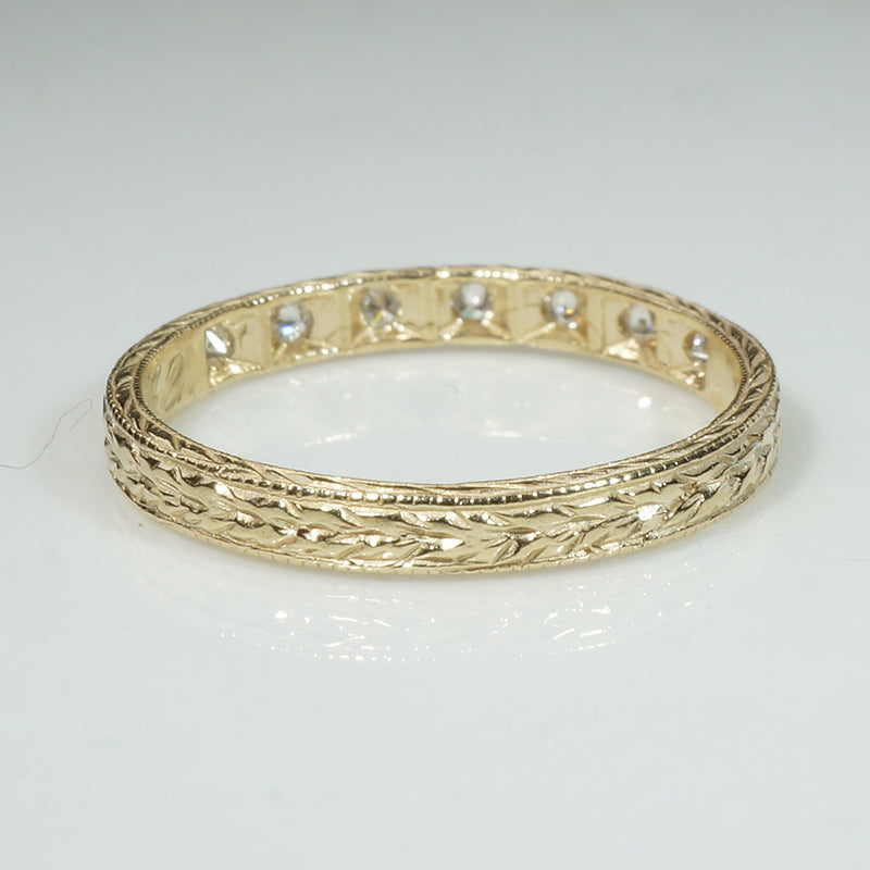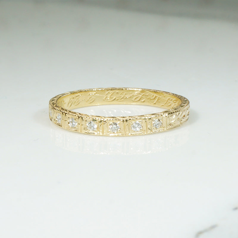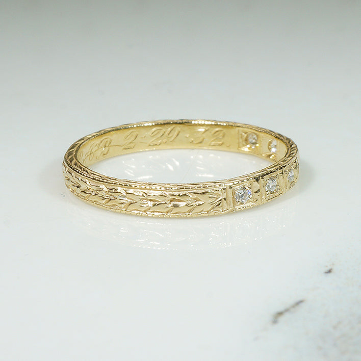 Tiny squares hold Seven recycled diamonds across the top of this very special band. Vines run round the ring as well as on both of the edges, and we made sure this recycled beauty holds the original engraving inside. In beautiful fancy script, it reads: from PLT to LAB 2-29-32. Perfect to mark a Leap Year Wedding or just a fabulously unusual love token. This one is 14k Yellow gold, recycled, of course!