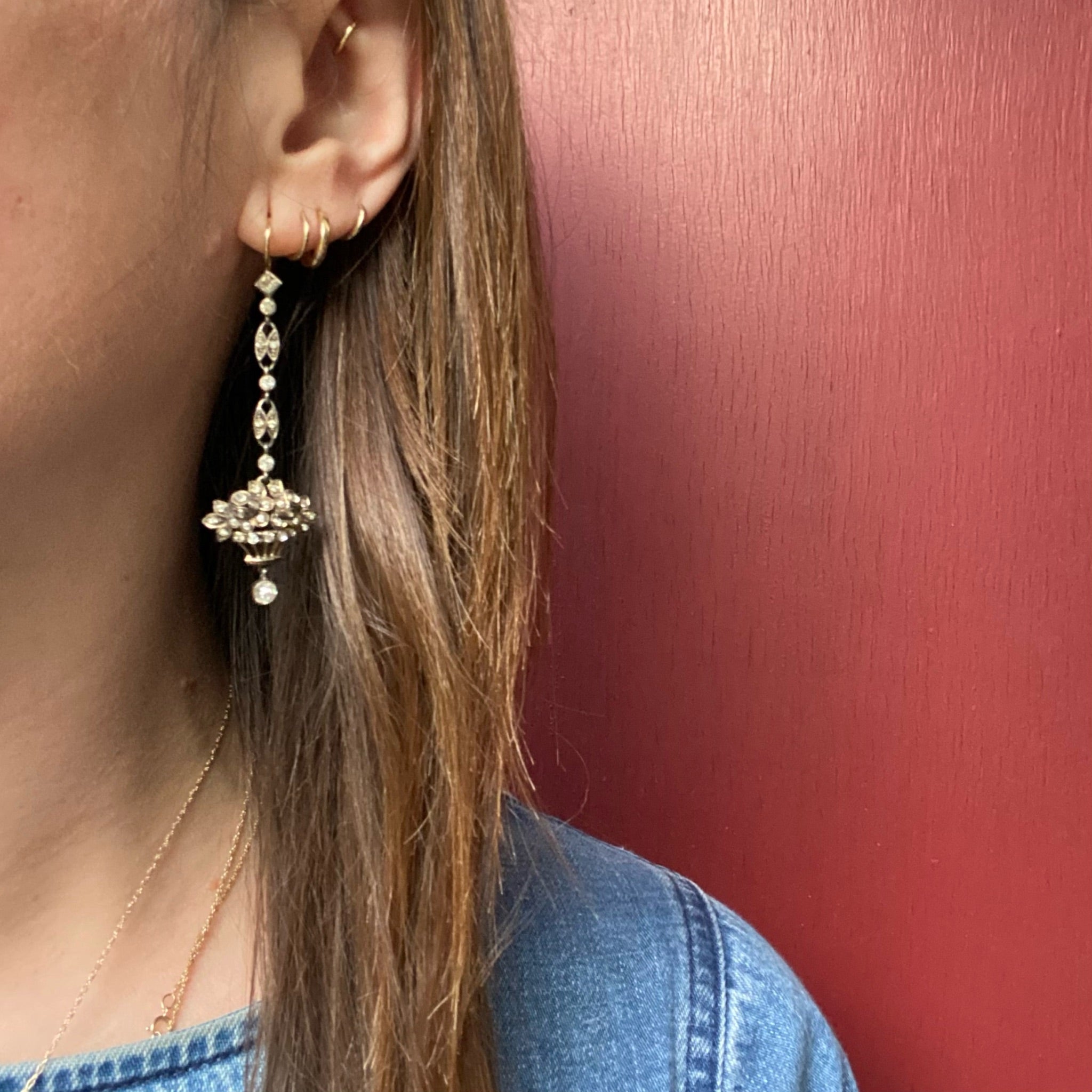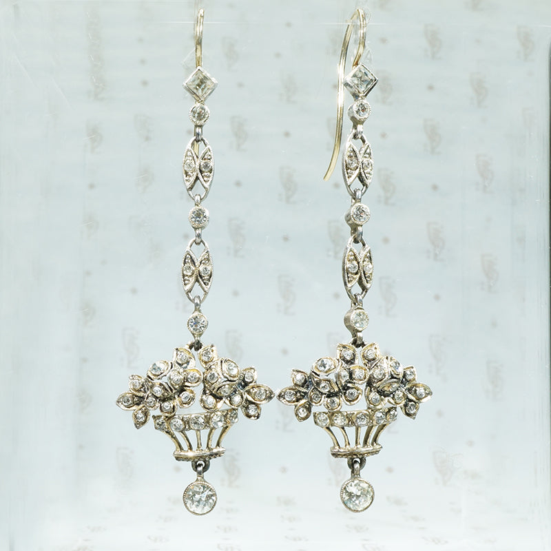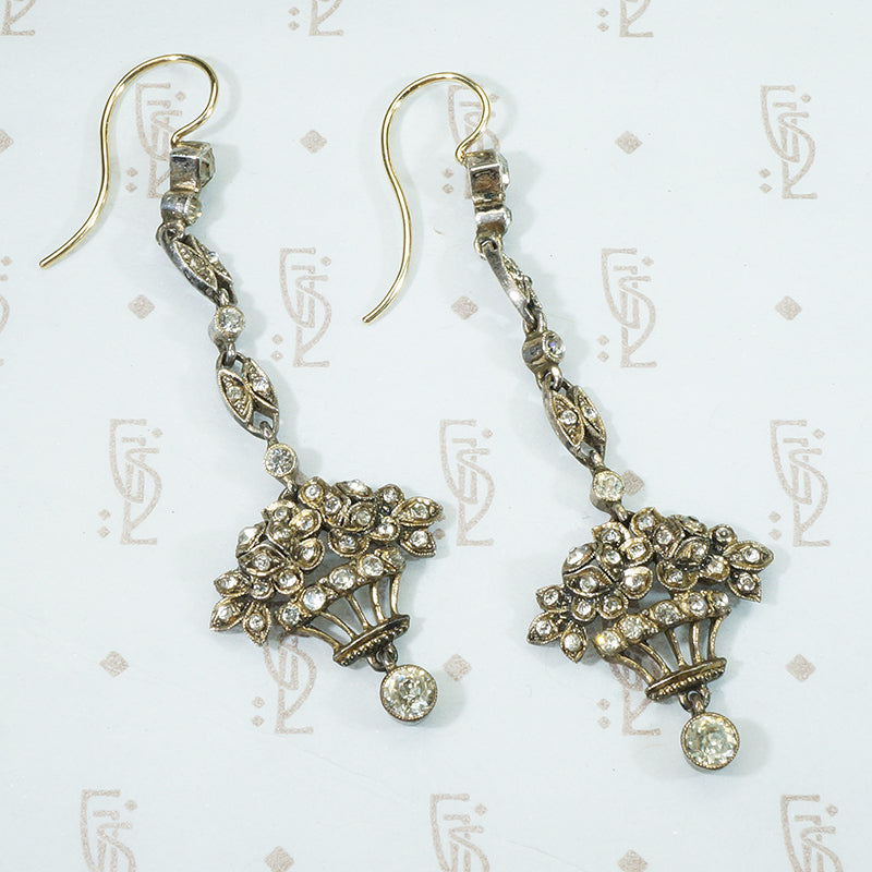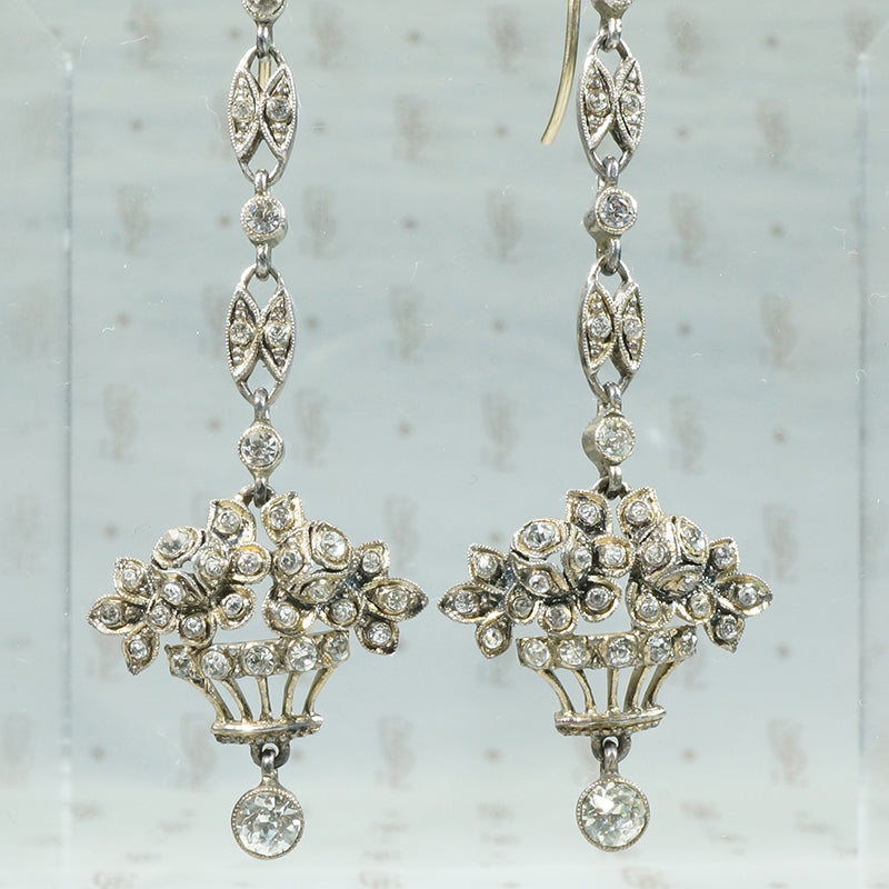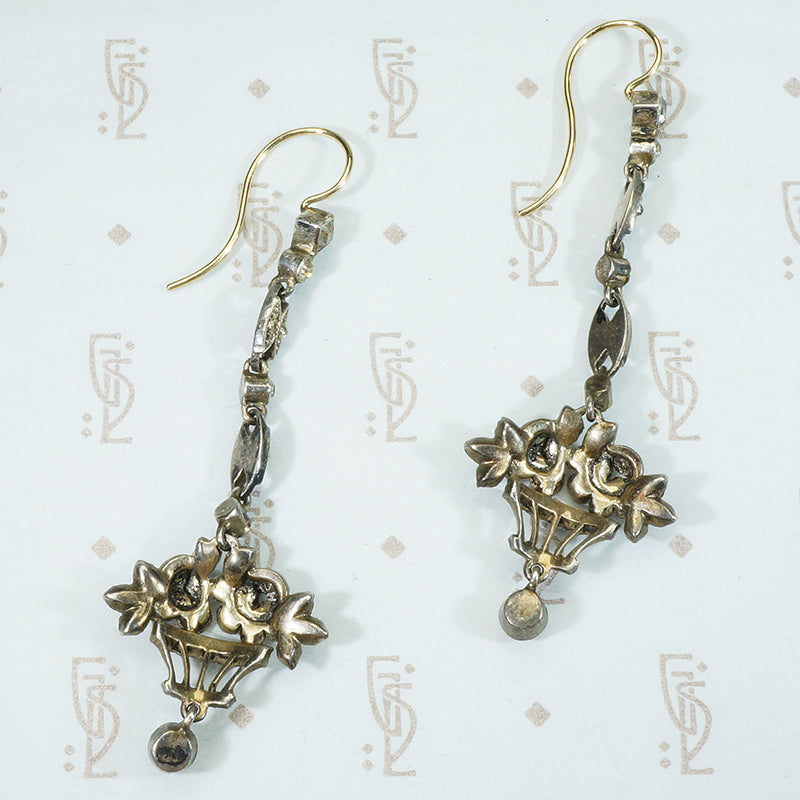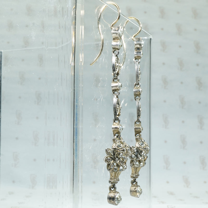 These lovely pendulous earrings are made of 935 silver, slightly higher than sterling standard, 935 was a popular fineness in Europe. Long and lovely these earrings are set with clear paste stones, rock crystal backed with foil. The wires are 14k yellow gold replacements, well done and in keeping with the originals. Ear wires are often replaced as they take the most wear in earrings. Circa 1900.