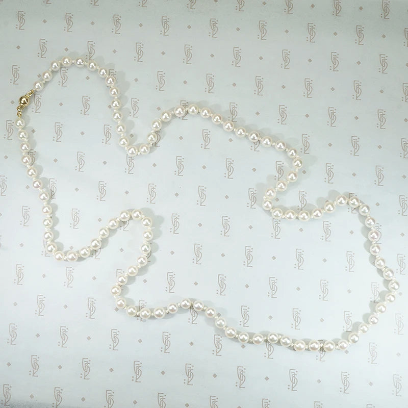This nicely matched long strand of beautifully lustrous pearls is hand knotted on white silk. Finished perfectly with a 14k yellow gold ball clasp the same size as the pearls. This is that perfect strand of pearls to add to your jewelry wardrobe. Circa 1960.