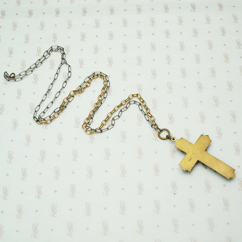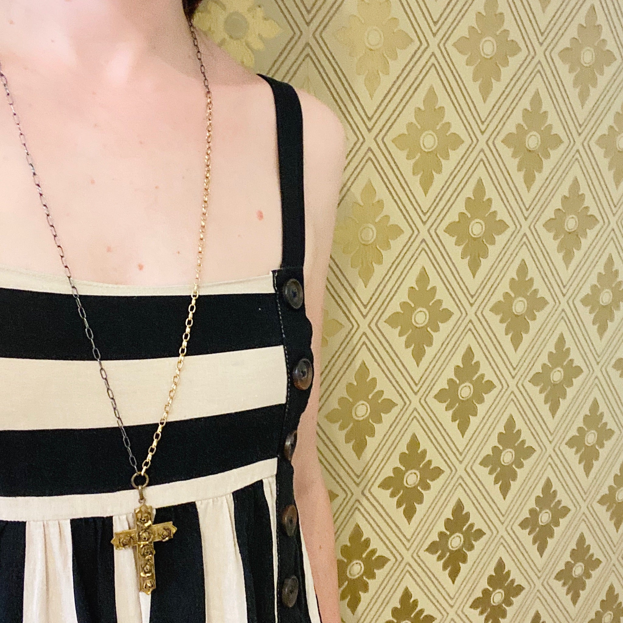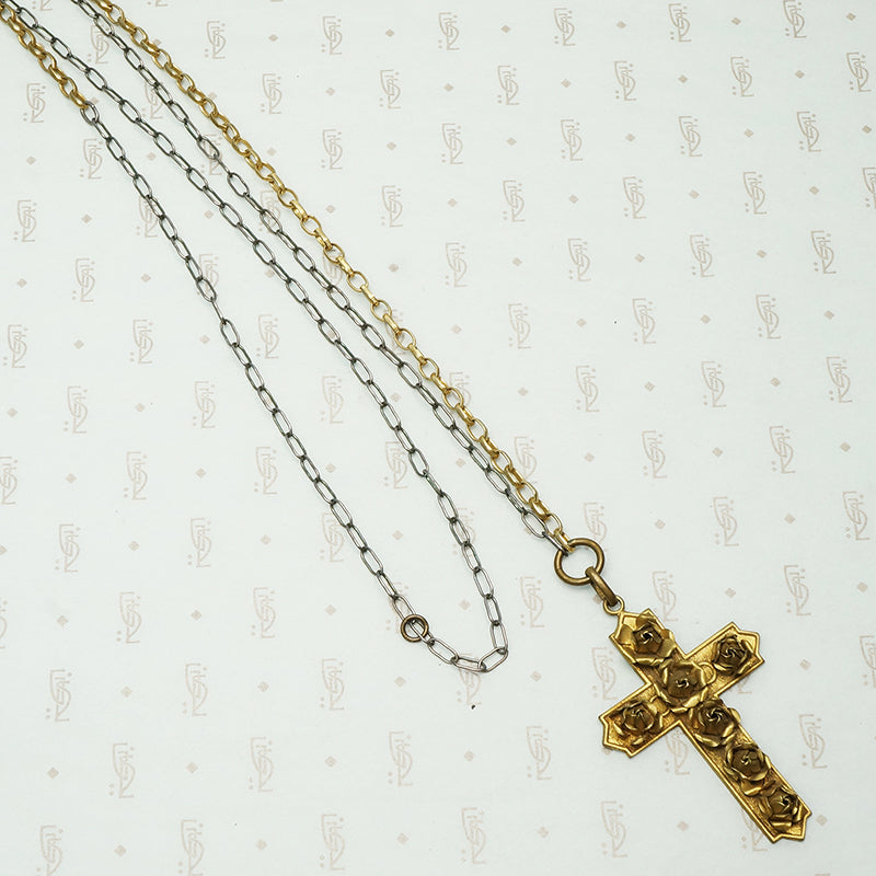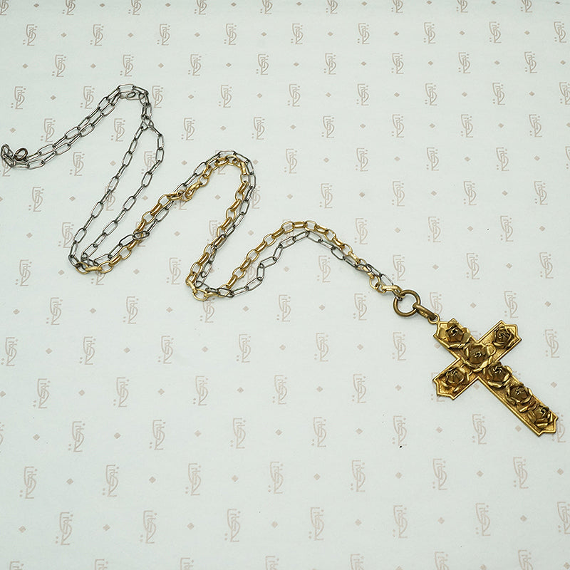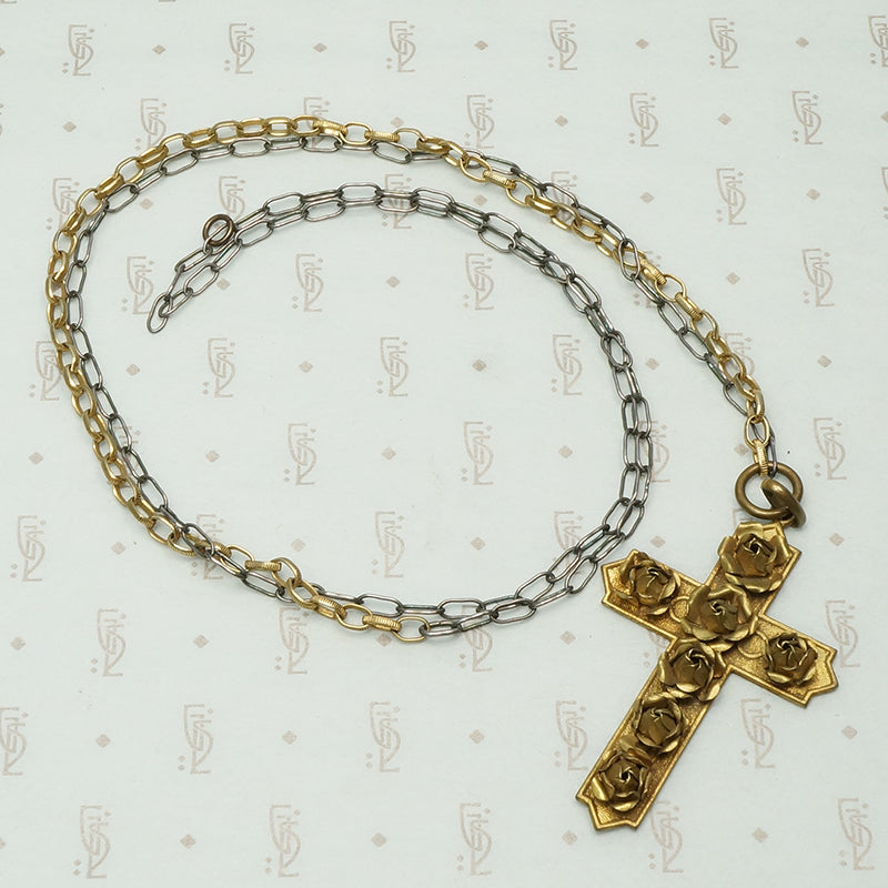 The mix of Jewelers brass and sterling silver give this necklace the ability to go with everything. The deep brassy gold cross is generously sized and covered in rows of roses, suspended from a chain of chunky links of vintage sterling and brass. The ingredients of this piece date from the 1920s.