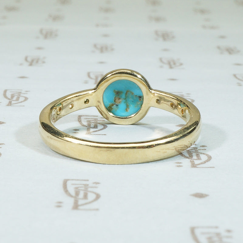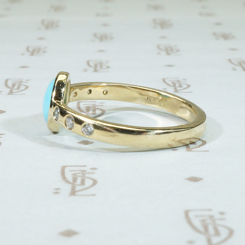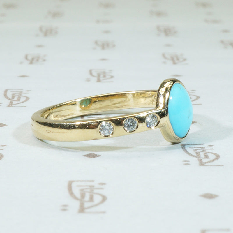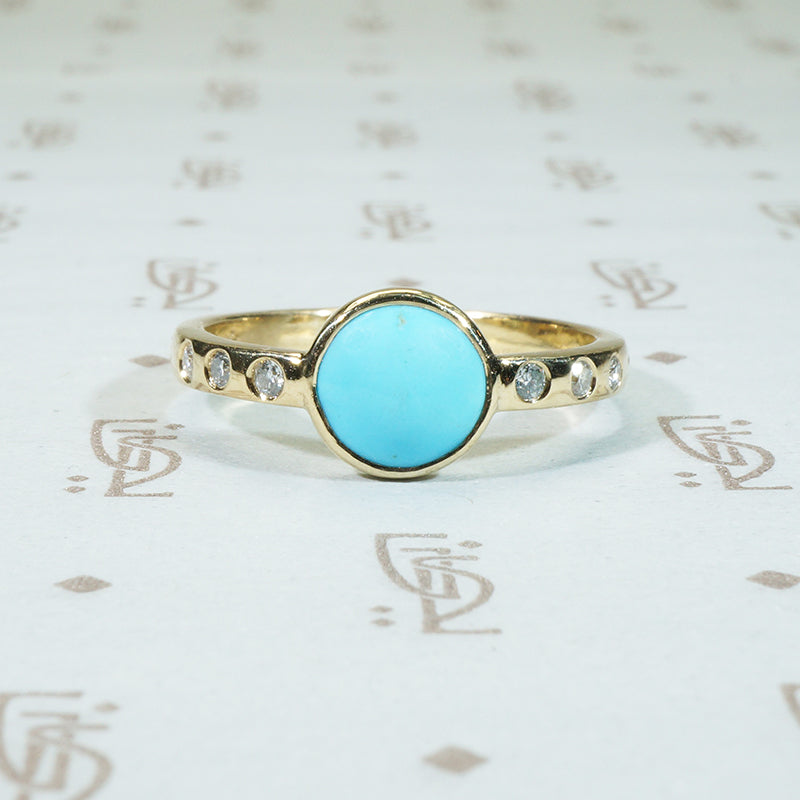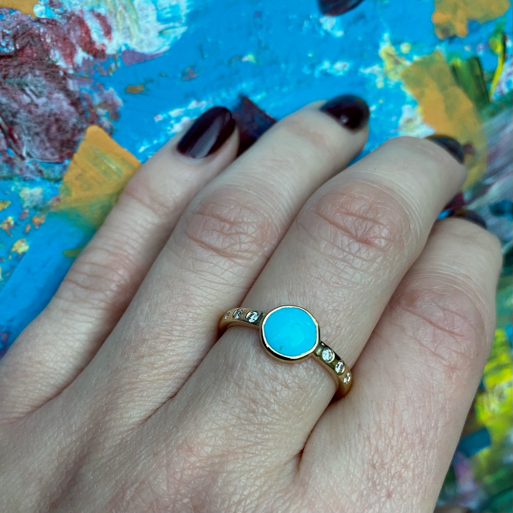 A round of natural Sleeping Beauty Turquoise the color of a Summer Sky is the focal point of this One of a kind Ring. Diamonds are flush set in the band to either side of the Turquoise Gem. This ring was lovingly handmade in our studio to fit its stone. The recycled diamonds are .12tcw.