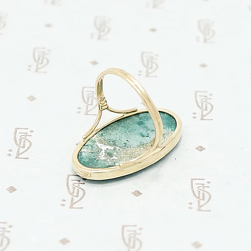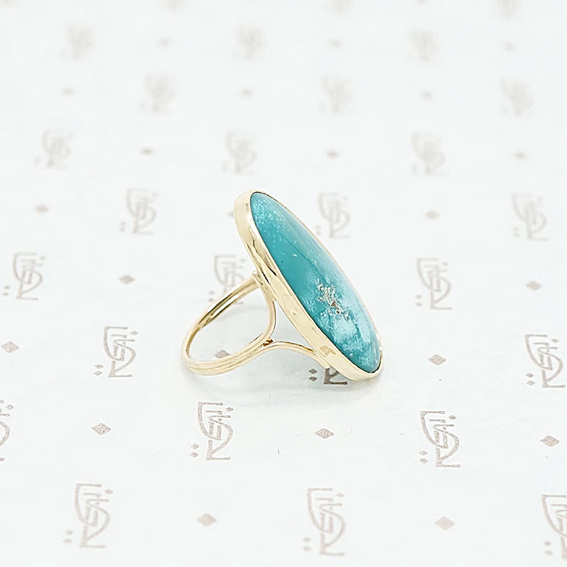 I imagine this is what Earth would look like from space, shades of blue and islands of matrix. This lovely oval of natural vintage 1960's Turquoise is simply set in a bezel to let the gem be the star that it is. Made by hand in our in house studio this line is designed for streamlined beauty and comfort. We only use recycled gold and vintage gems.