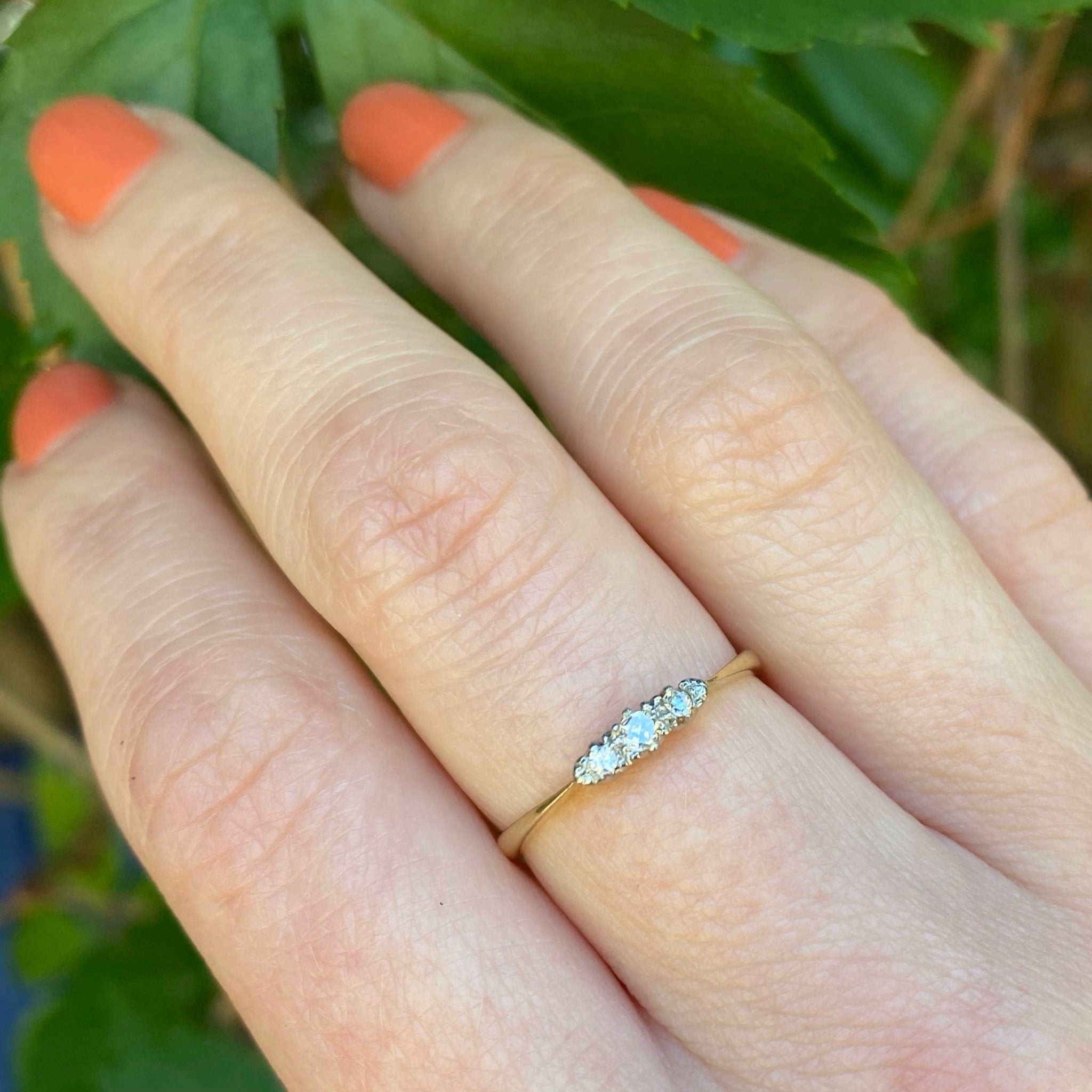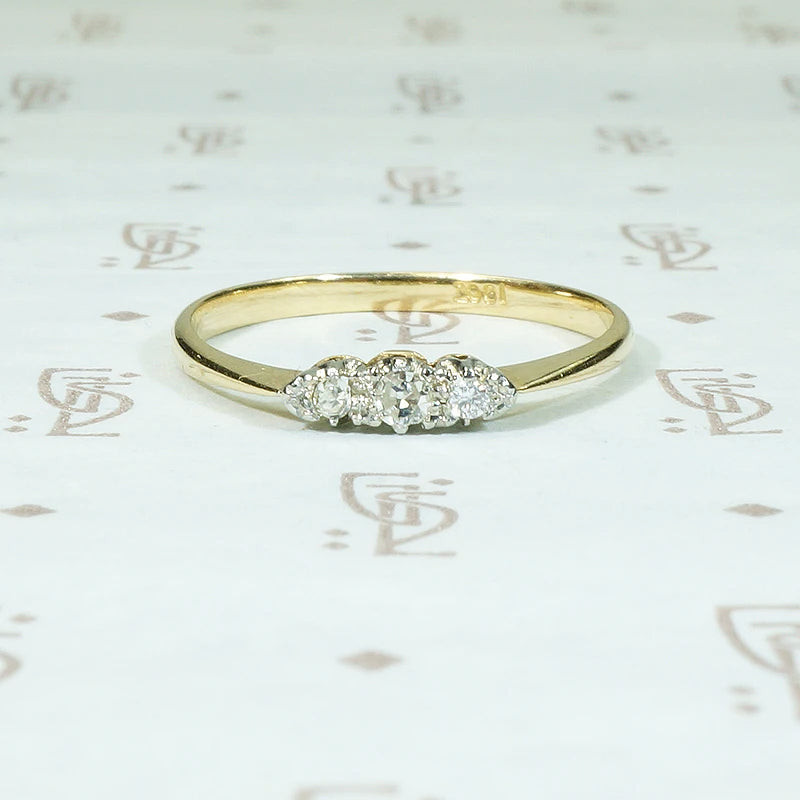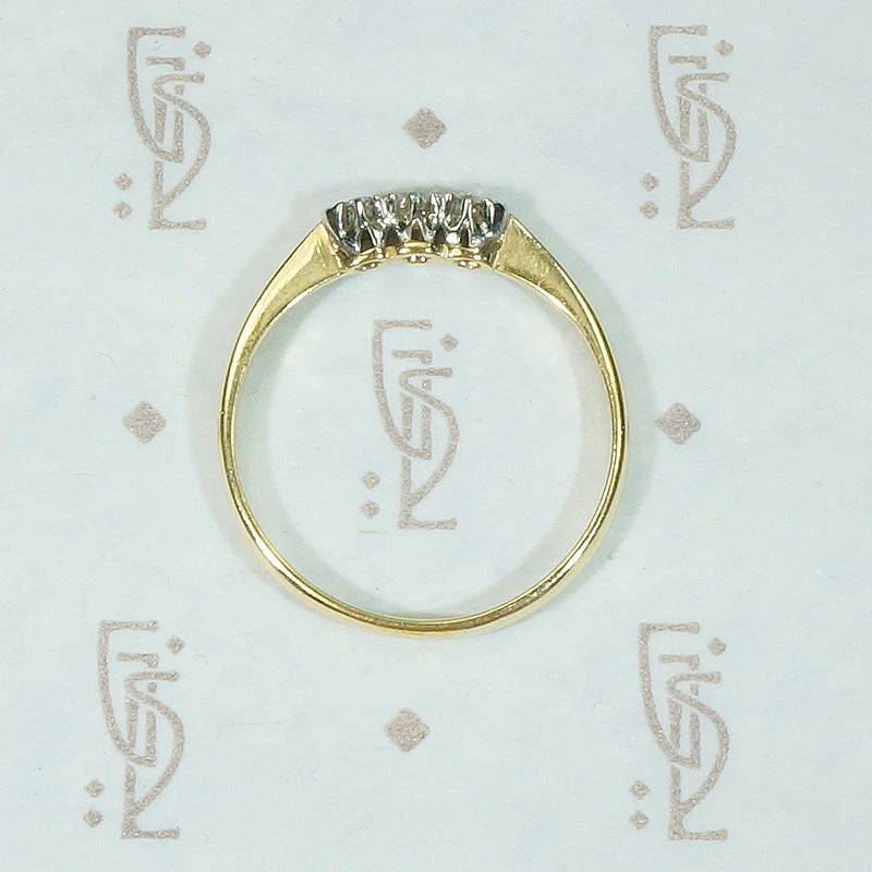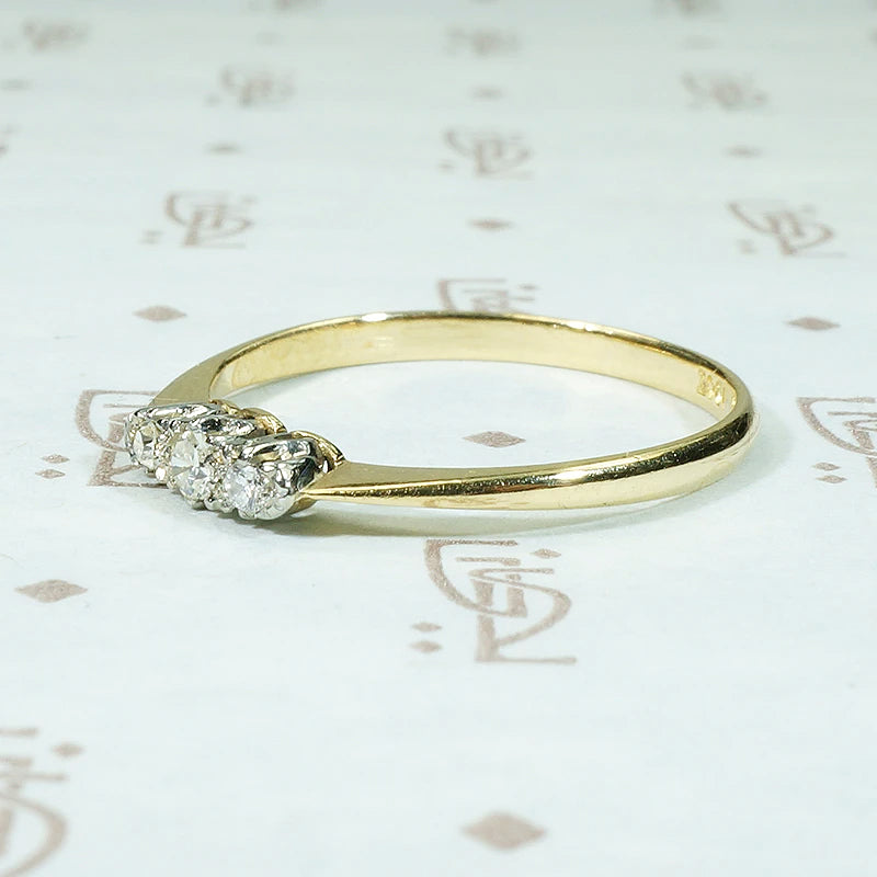 Three glittering little diamonds shine in a scalloped white gold setting. The white gold heads are set in an 18ct yellow gold band. Delicate pinched shoulders widen into a slim band. This refined diamond band will pair nicely with your vintage engagement ring; it will add sparkle to your stack and it looks lovely worn alone. Circa 1930.