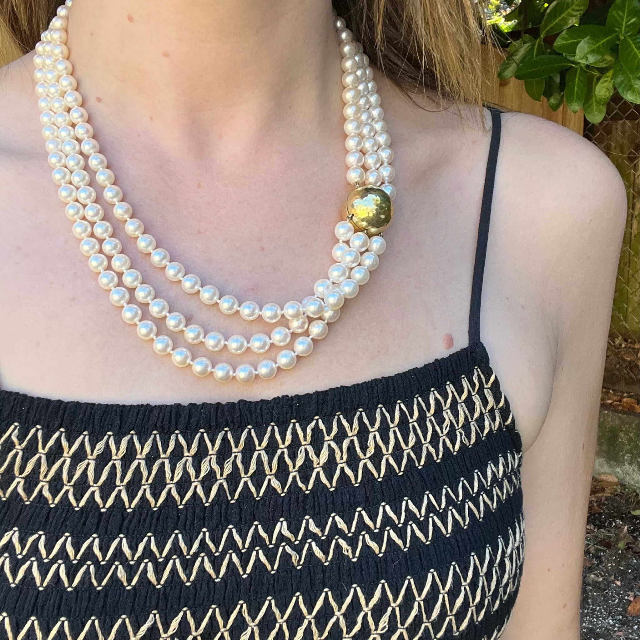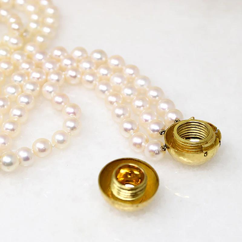 Three Princes-length strands of frothy Akoya pearls fasten with a glamorous 18k gold clasp that holds a little secret. The very well-matched cultured pearls are rich and creamy, hand knotted on white silk. The clasp is a substantial sphere of 18k yellow gold, hammered with a texture that gives the classic necklace a sophisticated modern vibe. Surprise surprise, when you unscrew the clasp a secret compartment is revealed, just the right size to stash all sorts of little things. Circa 1980.