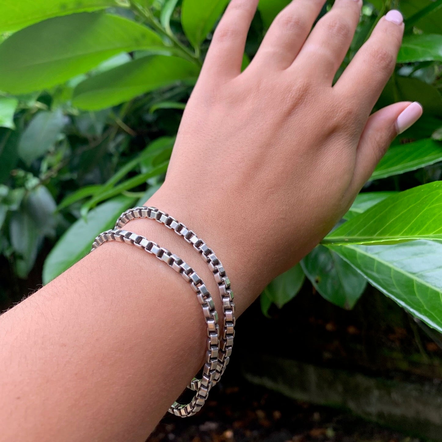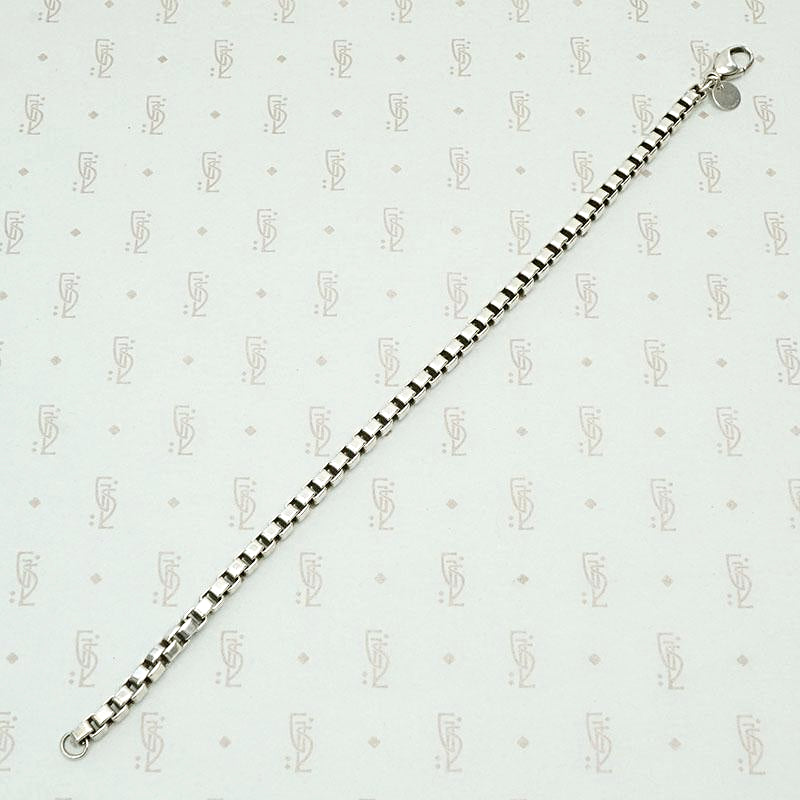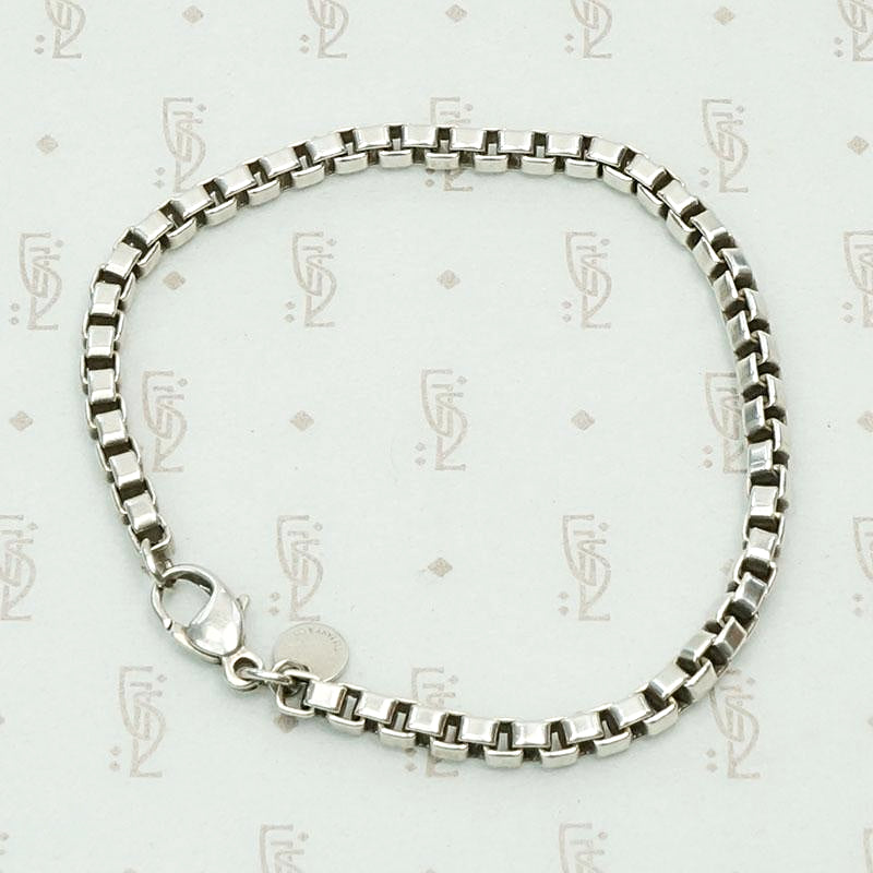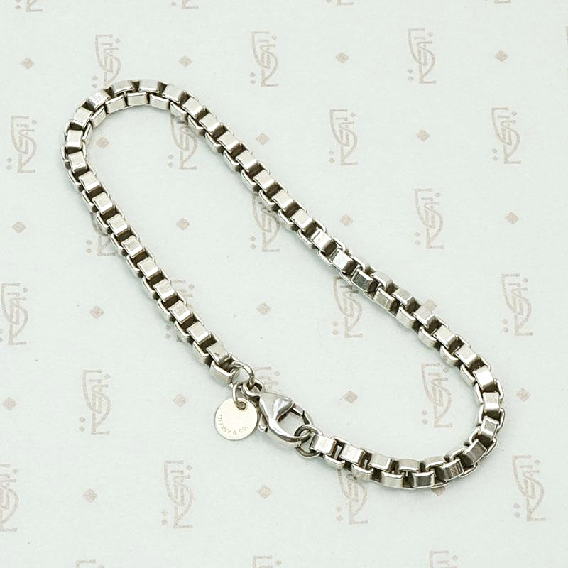This sterling silver Venetian link bracelet was made by Tiffany & Co. The Venetian link resembles a heavier, more refined box chain. The Tiffany & Co. mark is stamped on a sterling tag that dangles from the sleek, heavy lobster clasp. Classic and elegant, this piece will look great on its own or layered with other bracelets.