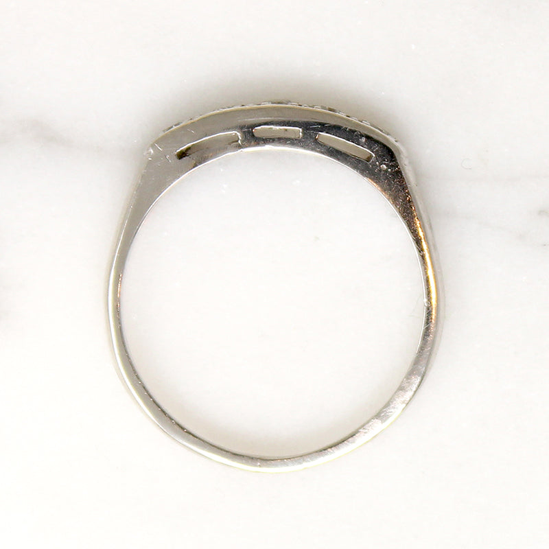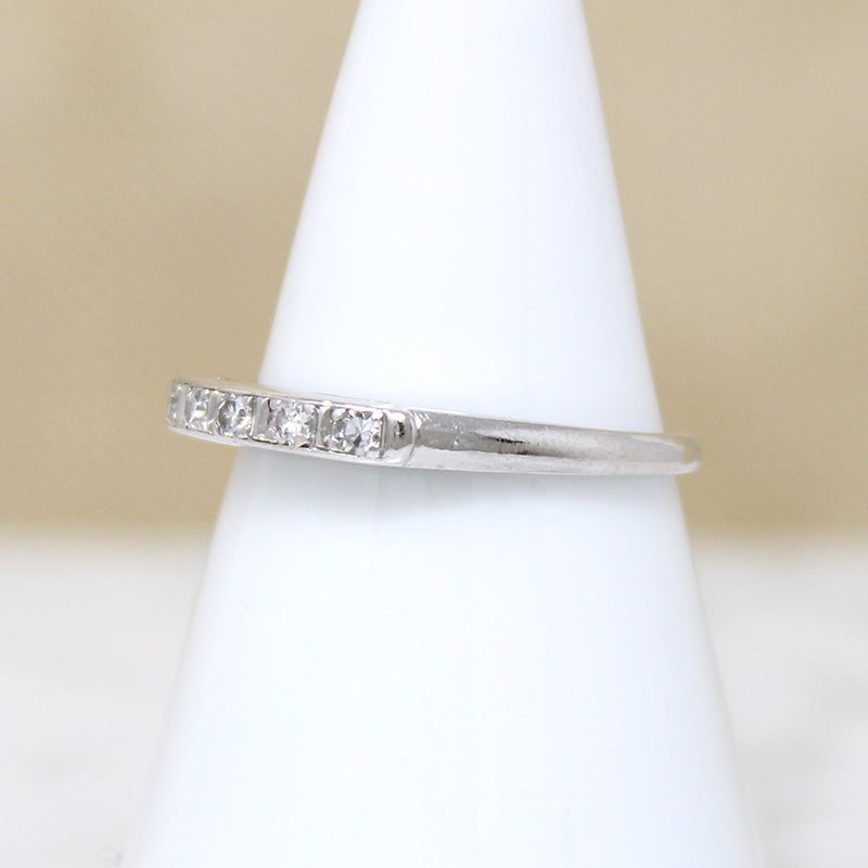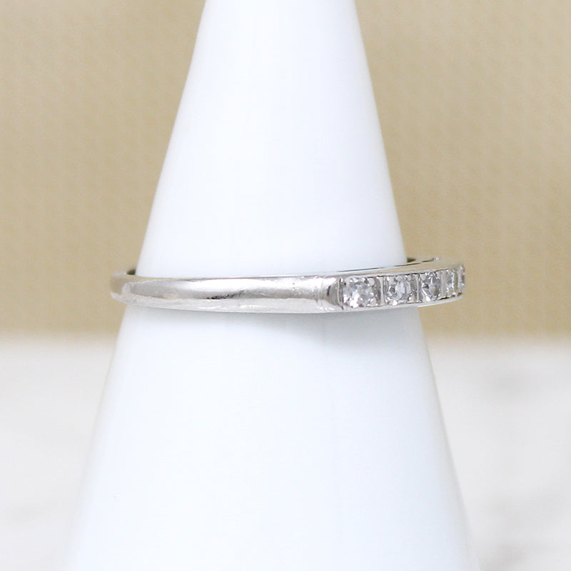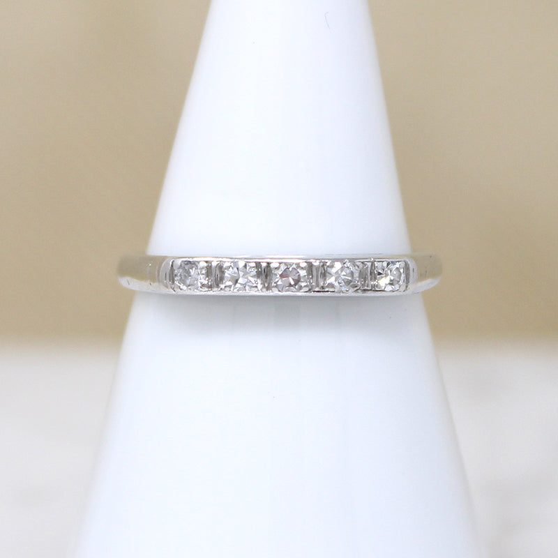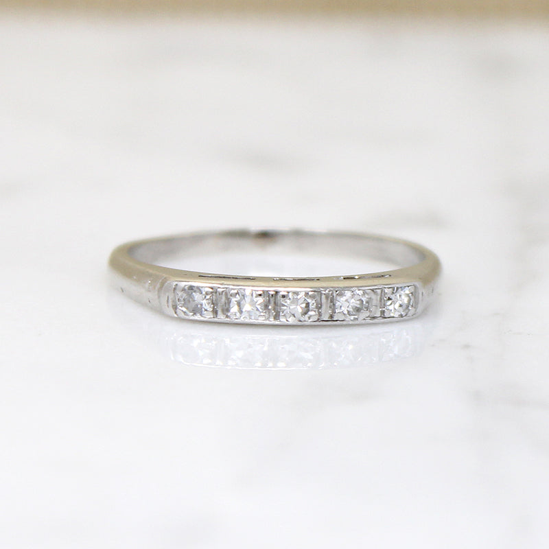 A graceful platinum wedding band with sparkling diamonds. Five pretty diamonds are set across the top of the band, each in its own tiny engraved box. Rounded shoulders taper into a slim band. Elegant and timeless, this band will pair well with many vintage engagement ring styles. Circa 1940.