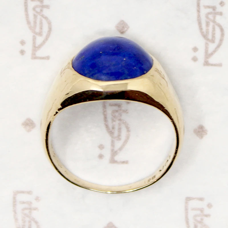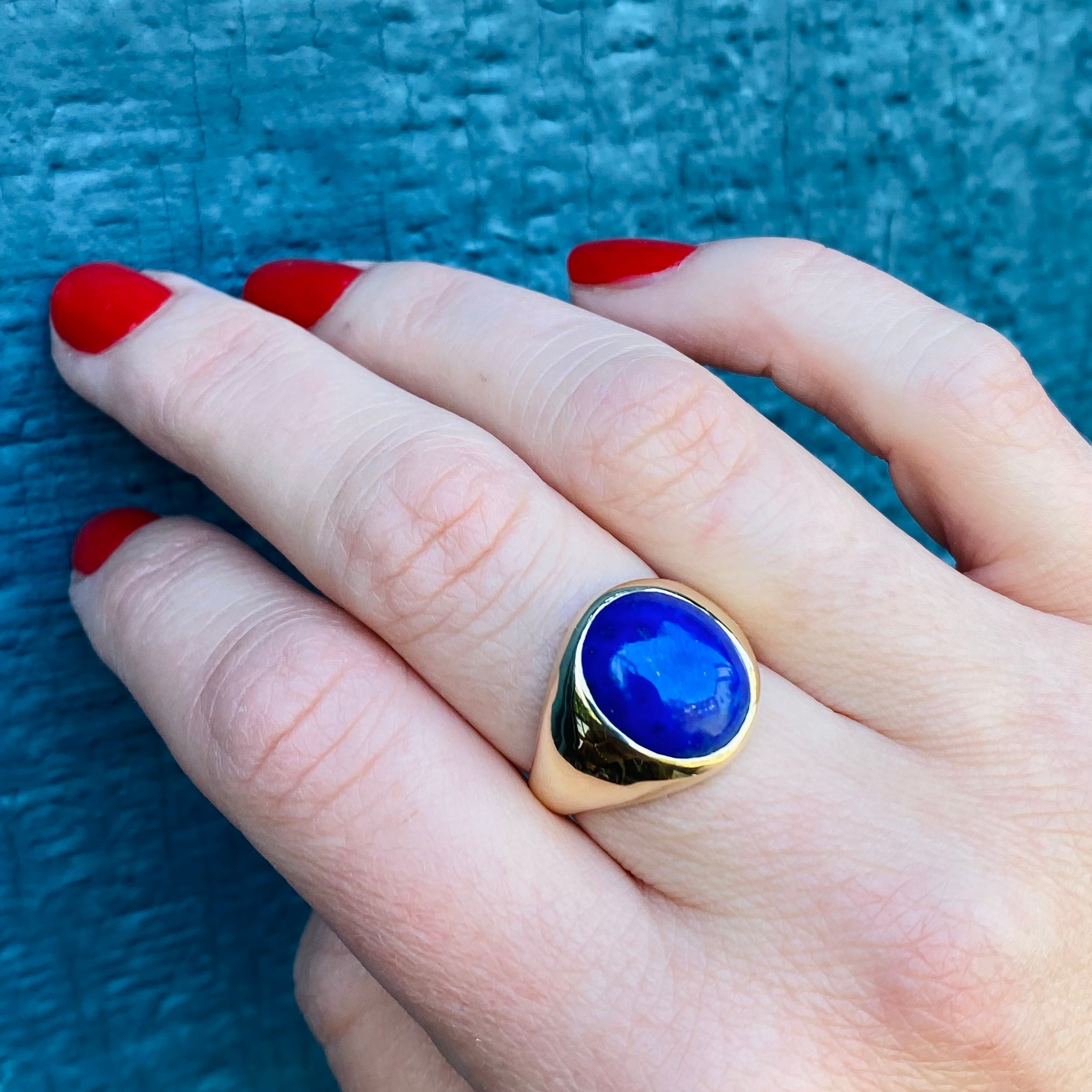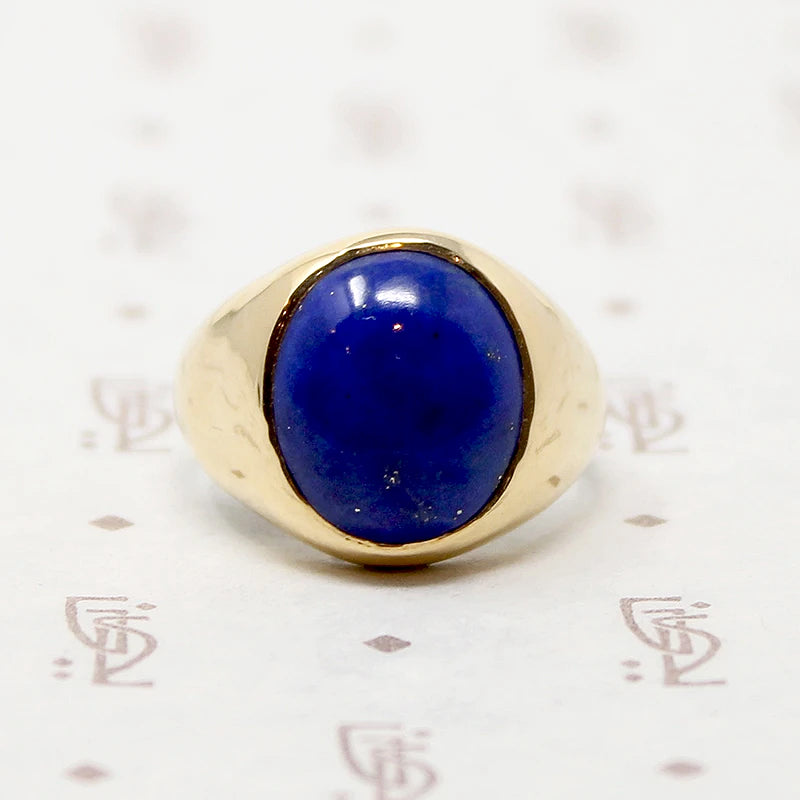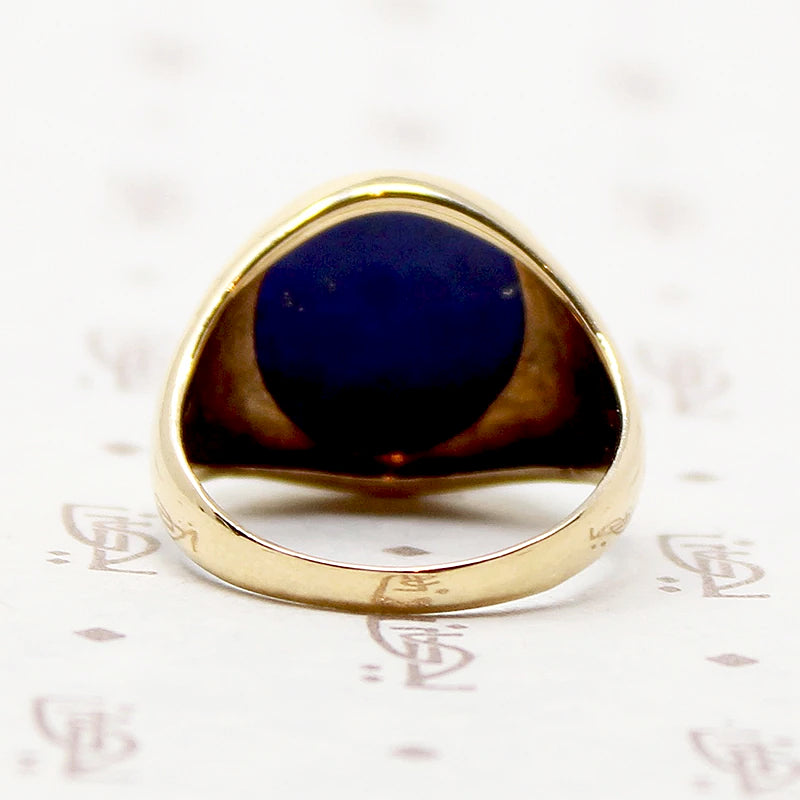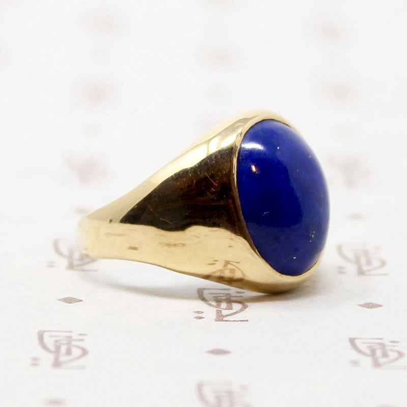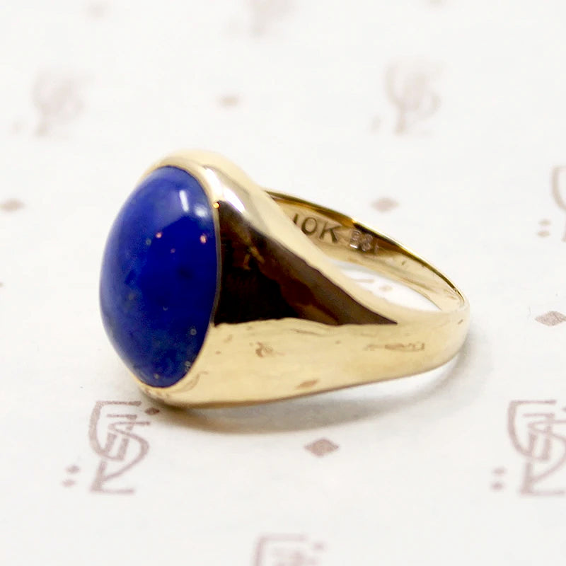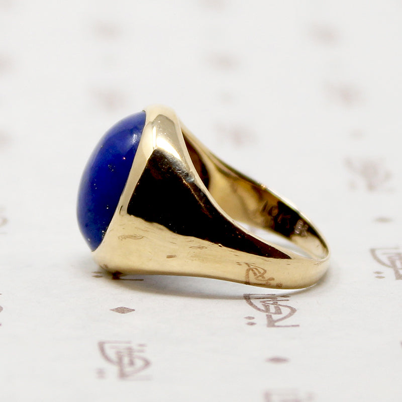 Gold and lapis lazuli are always a winning combination. This 10k yellow gold ring is a sleek gypsy-style signet, set with a cabochon of midnight blue lapis. A timeless piece, with clean, elegant lines. The interior of the band is engraved with the year "1942."
