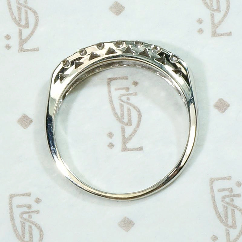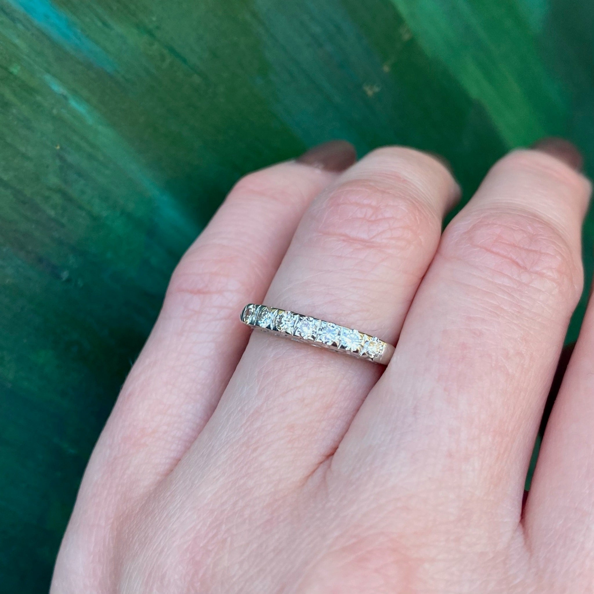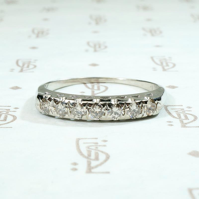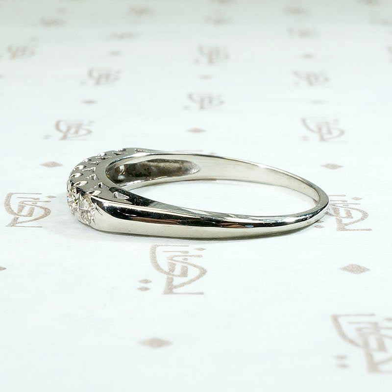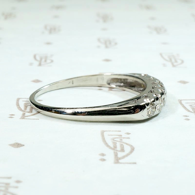 This timeless white gold wedding band is set across the top with seven diamonds. The pretty, sparkling diamonds weigh 0.20ct. Sleek shoulders taper back to a slim band. It will look great worn with your vintage engagement ring, on its own or stacked with other bands. Circa 1940.