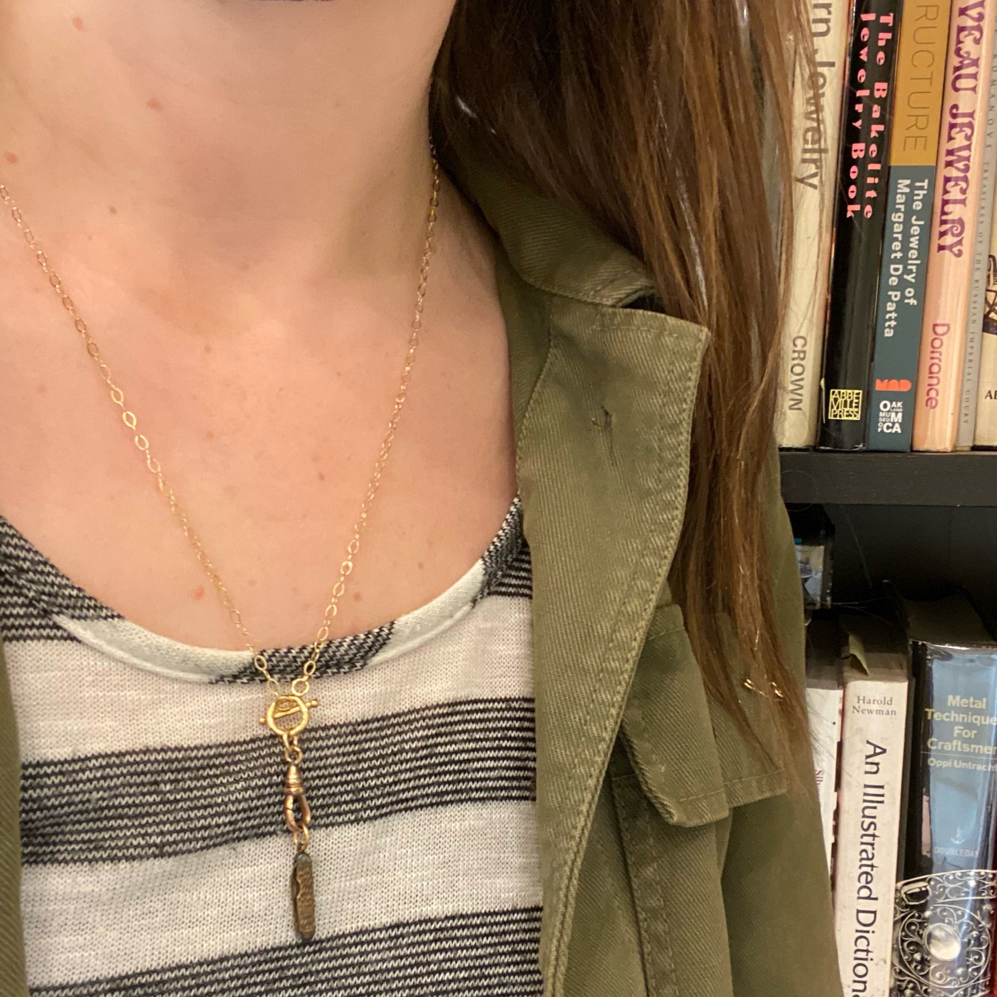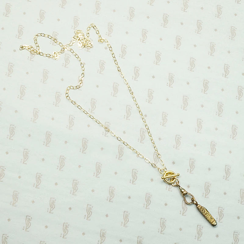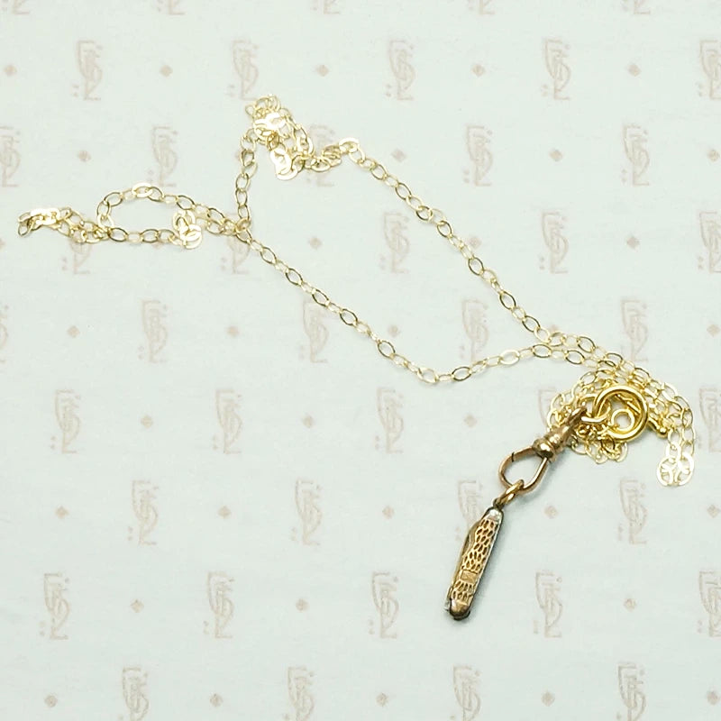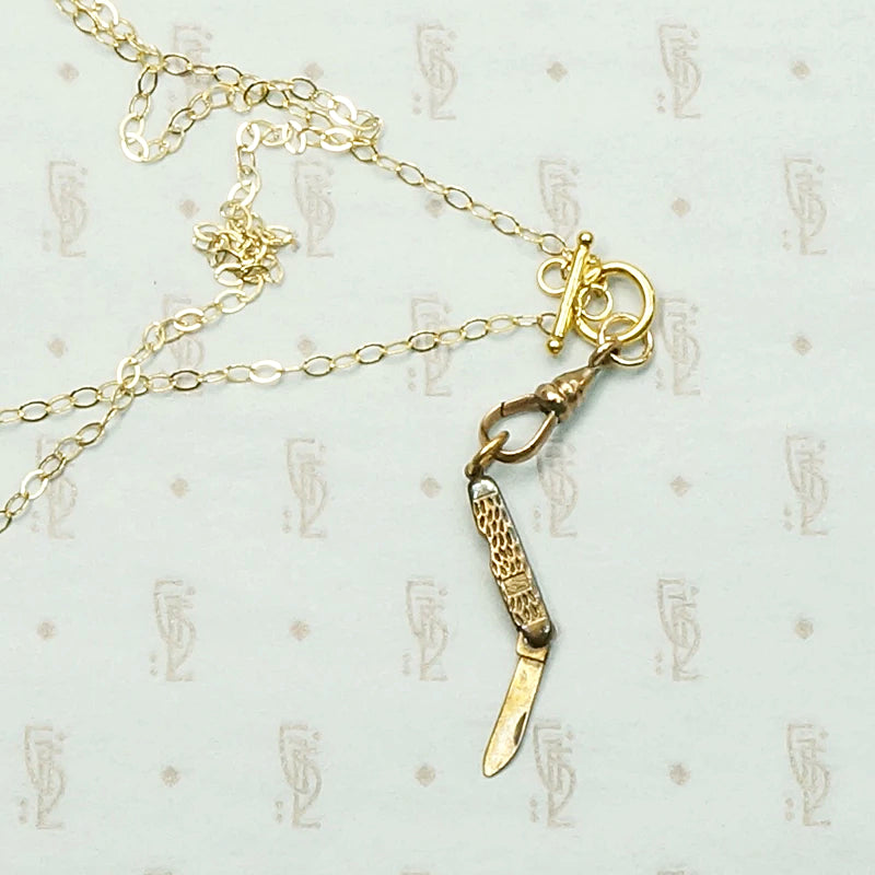 This fun necklace features a tiny vintage folding knife pendant. The knife's heavily textured brass case is stamped "intercast" and holds a single blade. The wee knife hangs from a recycled gold filled chain by a watch hook on a toggle clasp. You never know when you will need a useful little blade, and this one is both useful and little. Circa 1950.