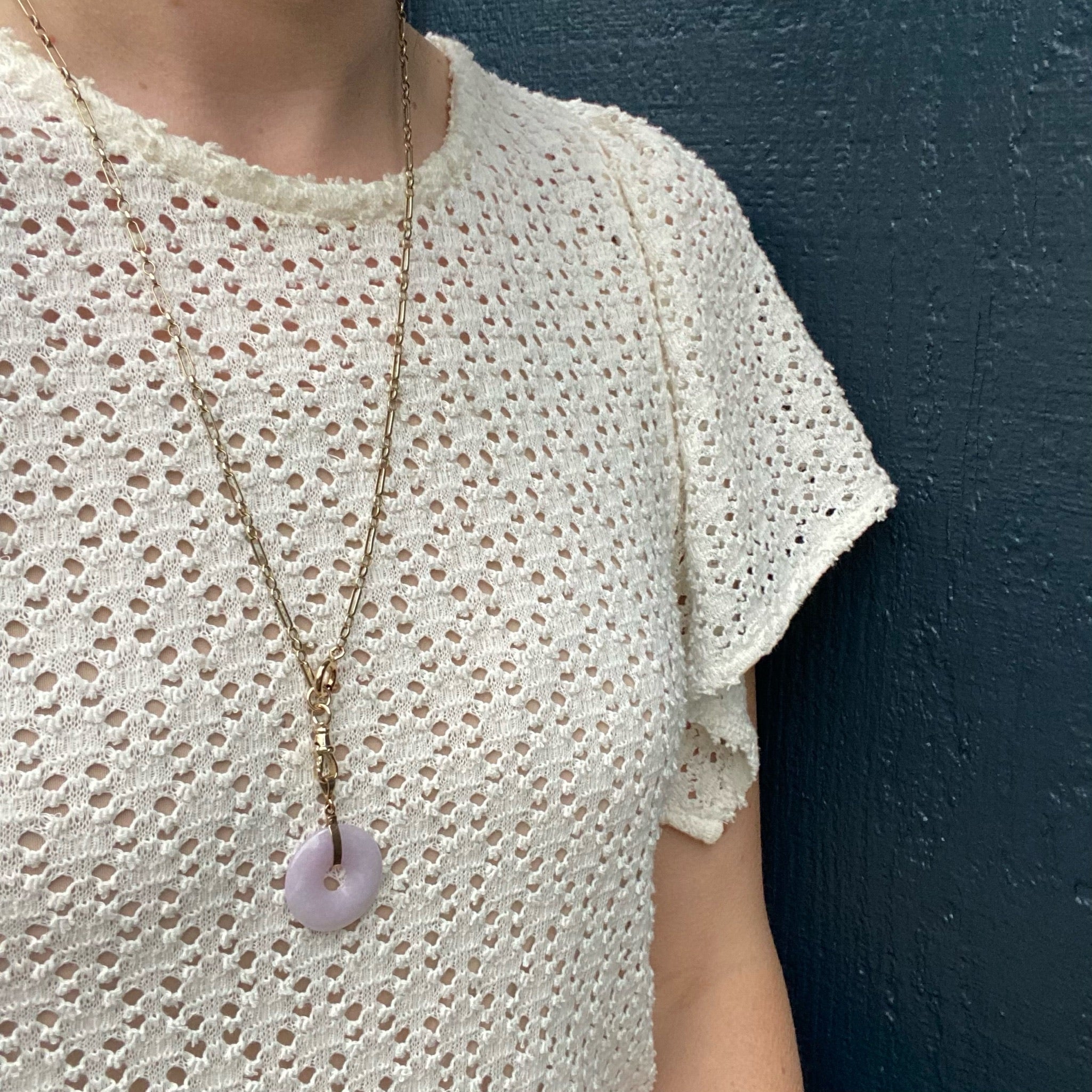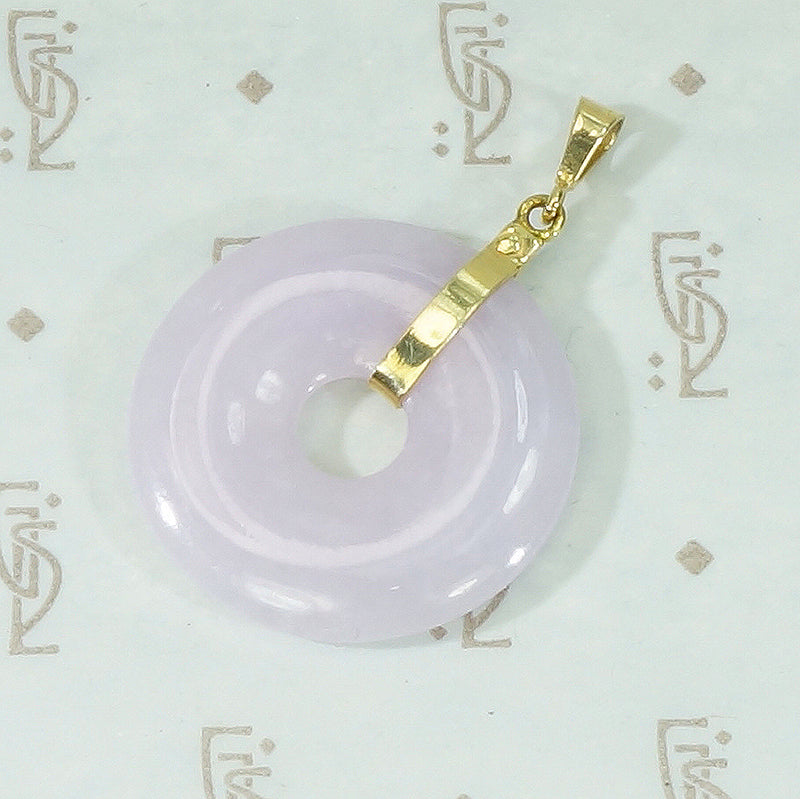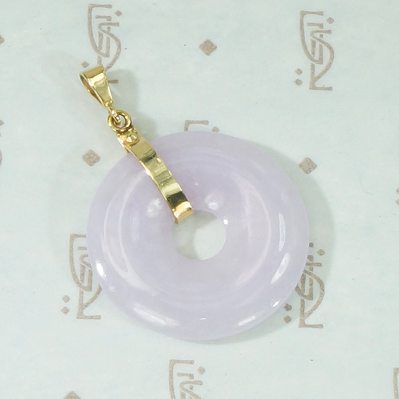 This Vintage Jade concentric circle is a gorgeous shade of translucent Lavender. The bail and ring are 14k yellow gold. The jade pendant is 20th century. Jade... a gem of longevity, protection, and grace.