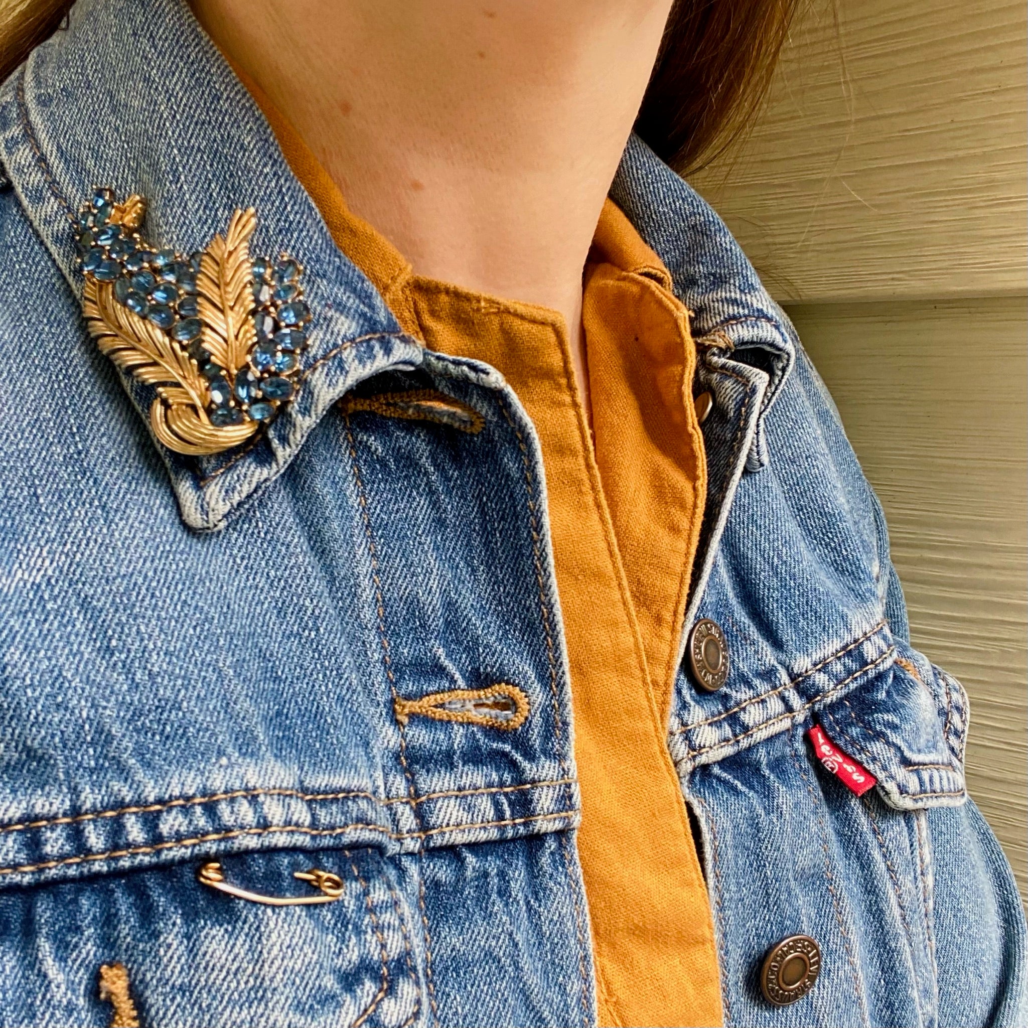 A bold and beautiful brooch of curling golden leaves and cascading blue rhinestone berries by Trifari. The colors of the rich gold tone costume metal and the oval indigo blue rhinestones are so complimentary. Graceful organic lines and luxe textures make this signed vintage brooch special. Circa 1950.