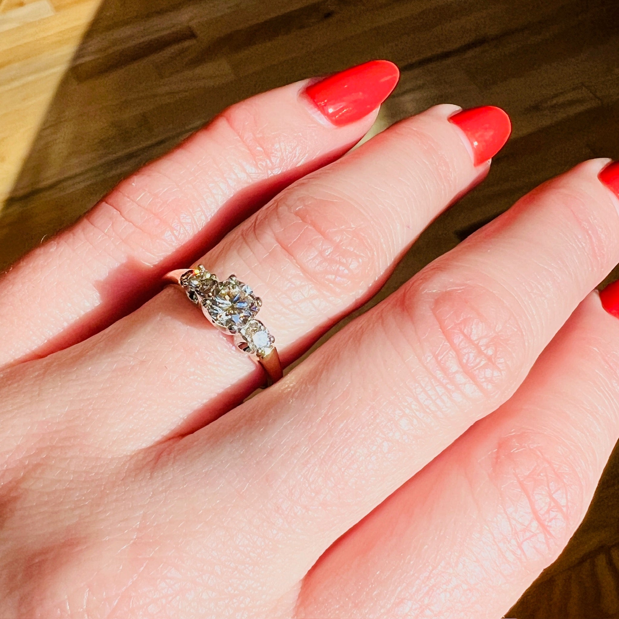Diamond Details...The center diamond is a .67ct round brilliant cut with VS2 clarity and C-2 to C-3 cognac color. Two round brilliant cut accent diamonds have a .19tcw, with a VS 1-2 clarity and F-G color.