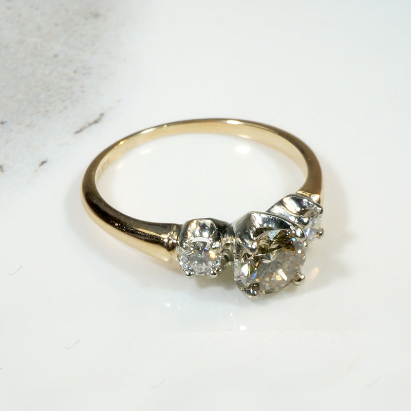 This two-tone trilogy engagement ring centers on a breathtaking brilliant cut cognac-colored diamond. Two flanking diamonds with a dazzling white color enhance the center stone's rich hue. The .67ct cognac diamond is displayed in a raised four-prong 18k white gold head. The .19tcw accent diamonds are also prong set in white gold. The body of the ring is 14k yellow gold, with curvaceous shoulders and a slim, tapered band. The ring's interior is signed with the Traub maker's mark and the name "Orange Blossom." A trilogy ring is so romantic, with three sparkling diamonds representing a bright past, present, and future. Circa 1930.