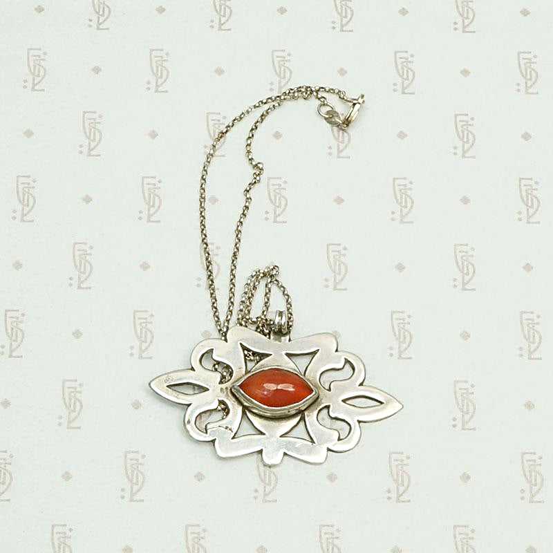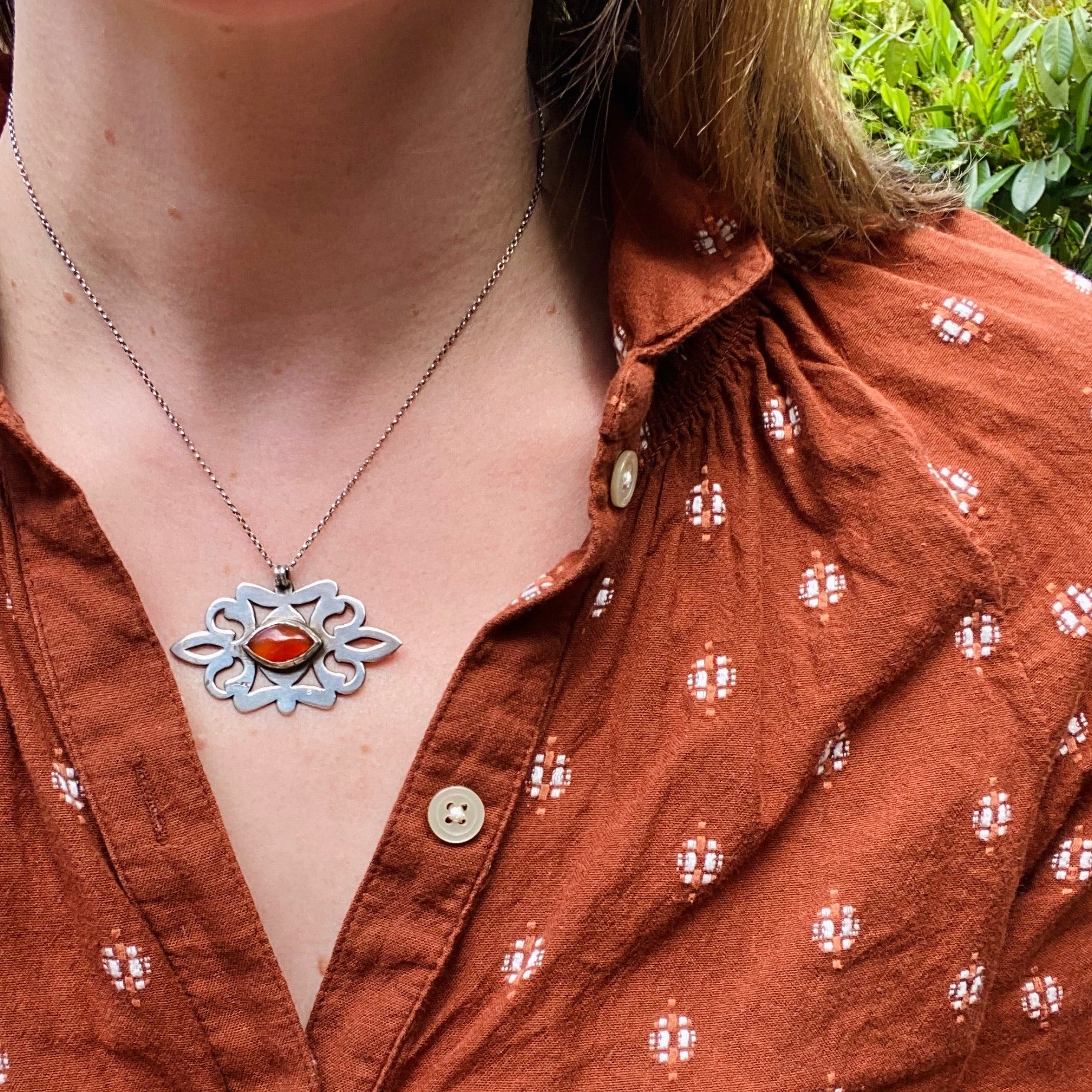 A gorgeous vintage Turkman pendant in coin silver. The Turkman tribes of Western and Central Asia are well known for their distinctive jewelry. This bohemian beauty is set with a carnelian gem, like a fiery eye. Circa 1960.