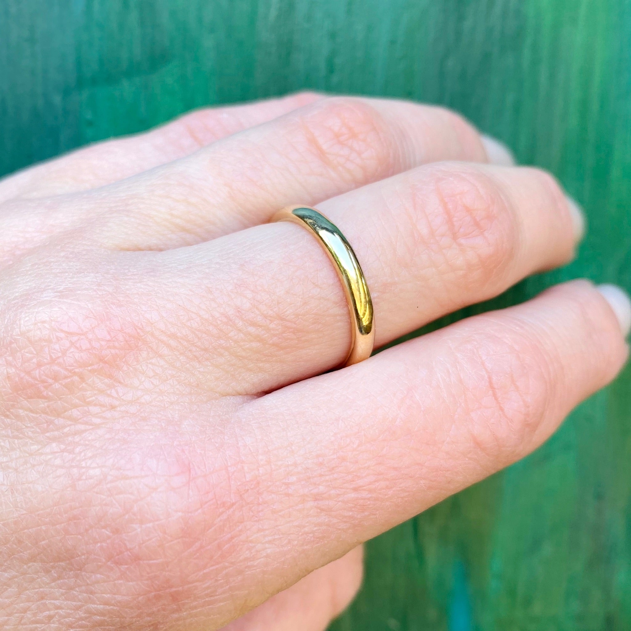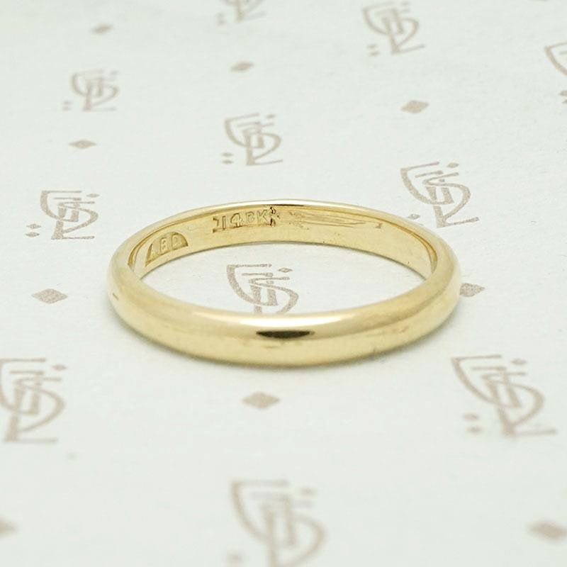 This classic gold wedding band is lovely. The thick, comfort fit, half round band is cast in glowing 14k yellow gold. A wonderful ring, it will look great worn alone or paired with your engagement ring. Circa 1900.