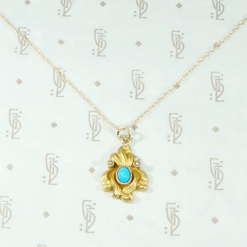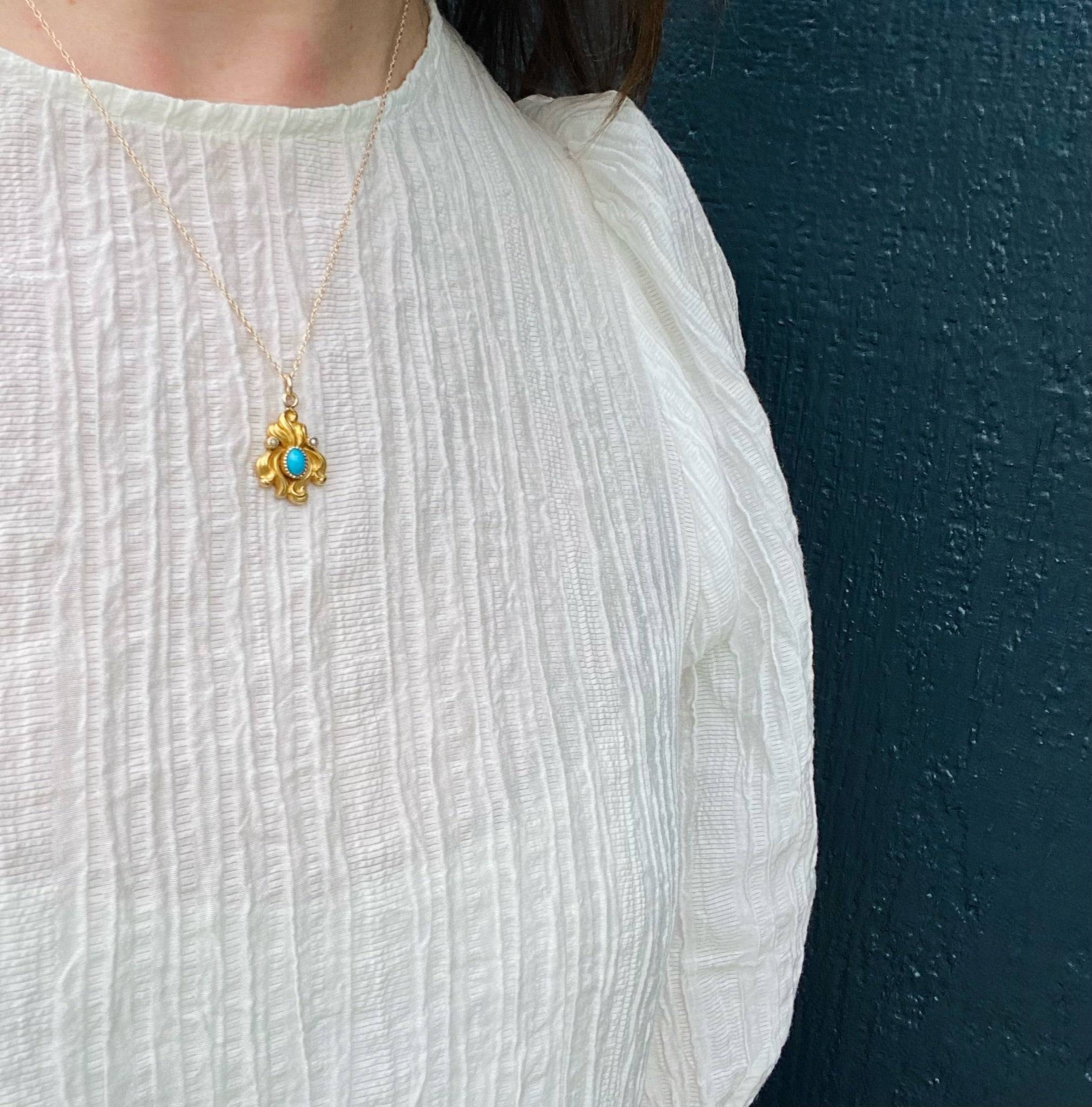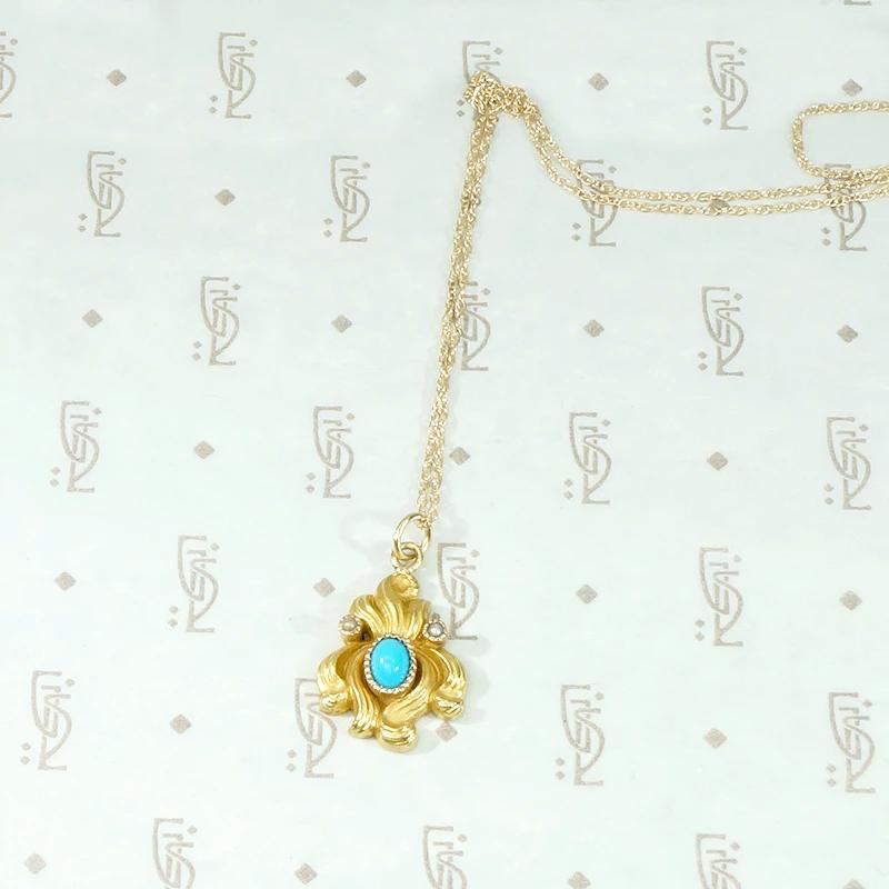 This Art Nouveau pendant is an exquisite stylized iris flower, cast in 14k yellow gold and set with turquoise and pearl. The bezel-set turquoise is a cabochon of the dreamiest robin's egg blue. Two tiny natural pearls flank the turquoise. This piece has a very pleasing, substantial weight. This pendant is a conversion jewel, re-purposed from a stick pin into a pendant with a jump ring added for versatility. So beautiful, a romantic addition to any jewelry wardrobe. Circa 1890.