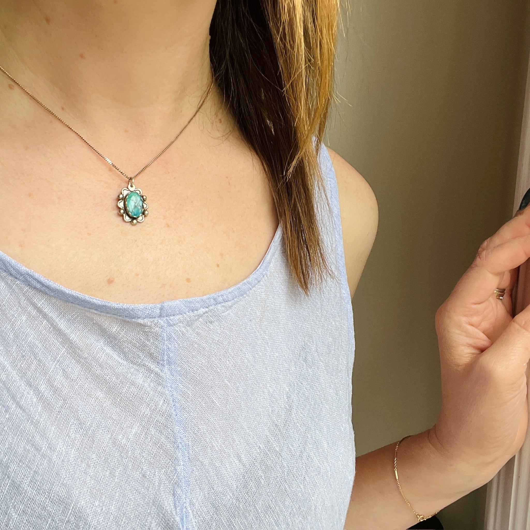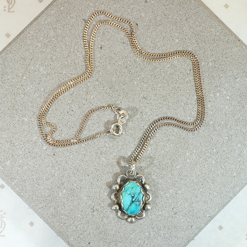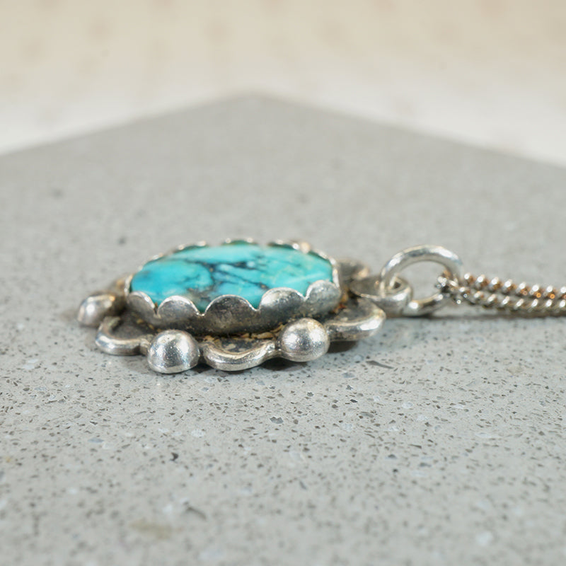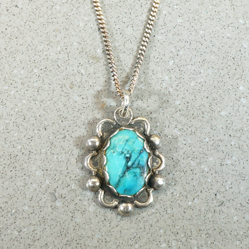 This Southwestern necklace features a piece of natural turquoise set in an ornate sterling silver pendant. The turquoise nugget is a pure shade of blue with hints of bold black matrix. The stone sits in a scalloped bezel with a silver overlay frame and beaded accents. It hangs on a sterling silver cable chain. The back of the pendant is marked "Sterling." This piece will look great worn alone or layered with other necklaces. Circa 1960.