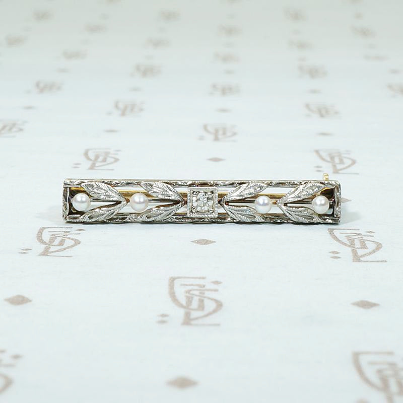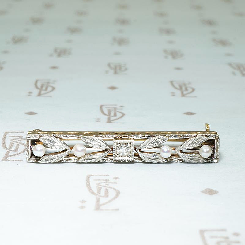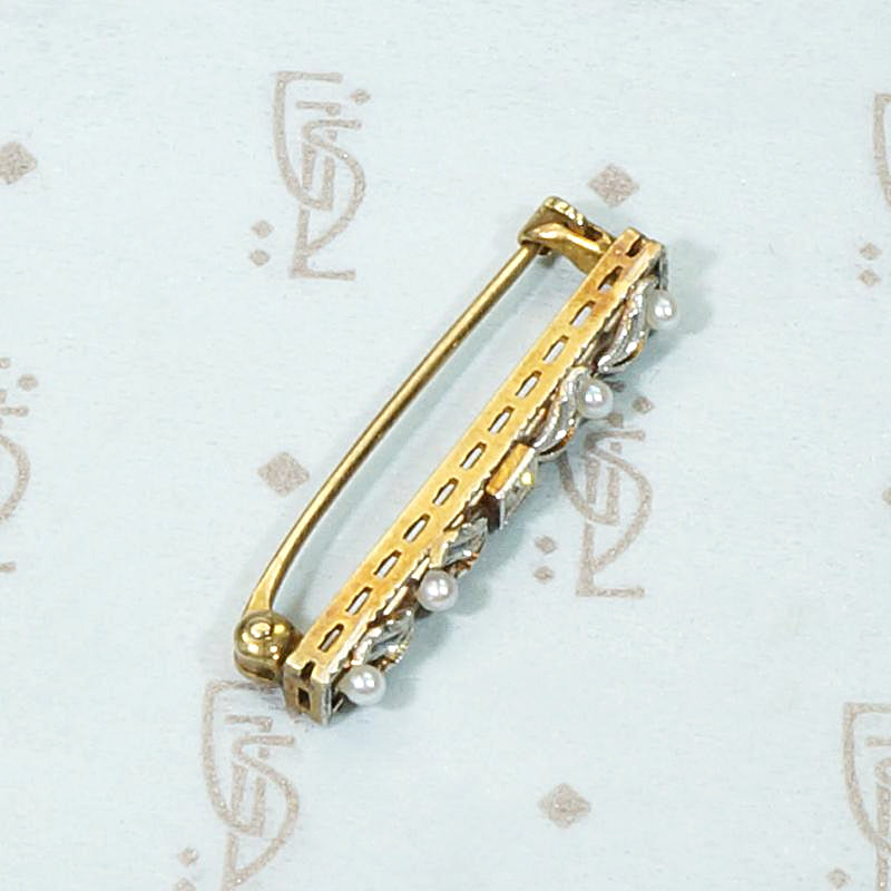 This delicate vintage bar pin was made by Krementz & Co. A petite bar of exquisitely engraved white gold leaves is set with pretty white pearls. A tiny twinkling diamond sits at the center. The white gold is laid over a yellow gold frame and clasp. The two-tone 14k gold gives this lovely piece depth and versatility. The clasp is stamped 14k and with Krementz & Co.'s makers mark. This wee brooch is light weight enough to be worn as a lingerie or lace pin.