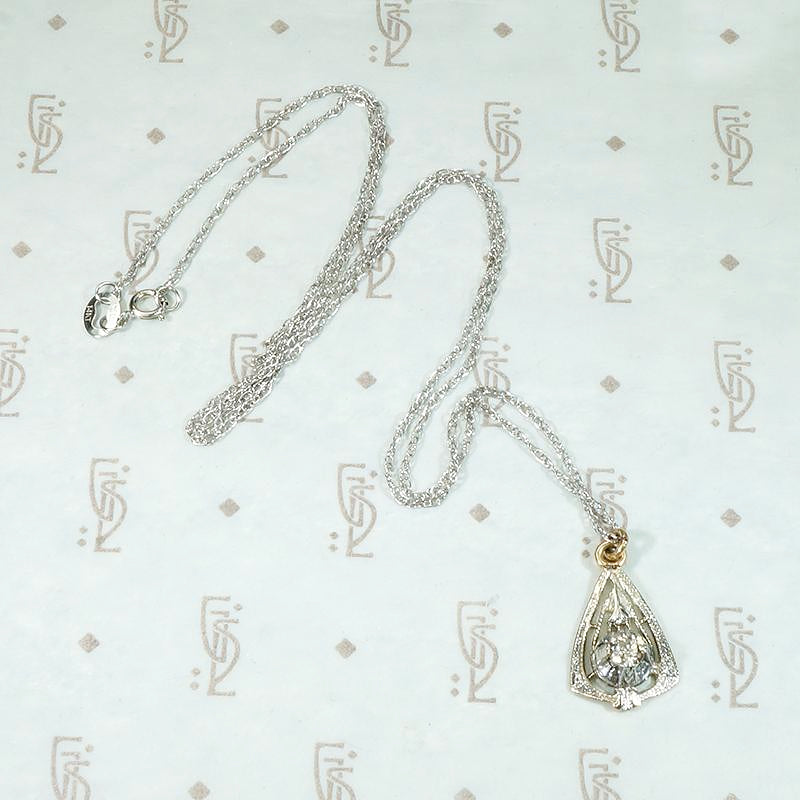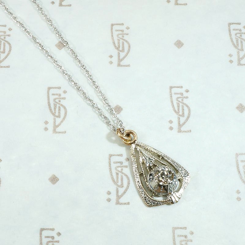 A beautiful little two tone 14k gold pendant set with a lovely old diamond. The teardrop-shaped open work pendant is crafted of engraved white gold over yellow gold. A chunky 0.20ct old mine diamond with a rich champagne tone is prong set at the center. The details are wonderful, even the prongs are delicately engraved. This pendant is a conversion jewel, re-purposed from an antique stick pin into a pendant. The stick pin is circa 1910. The modern rope chain is recycled 14k white gold