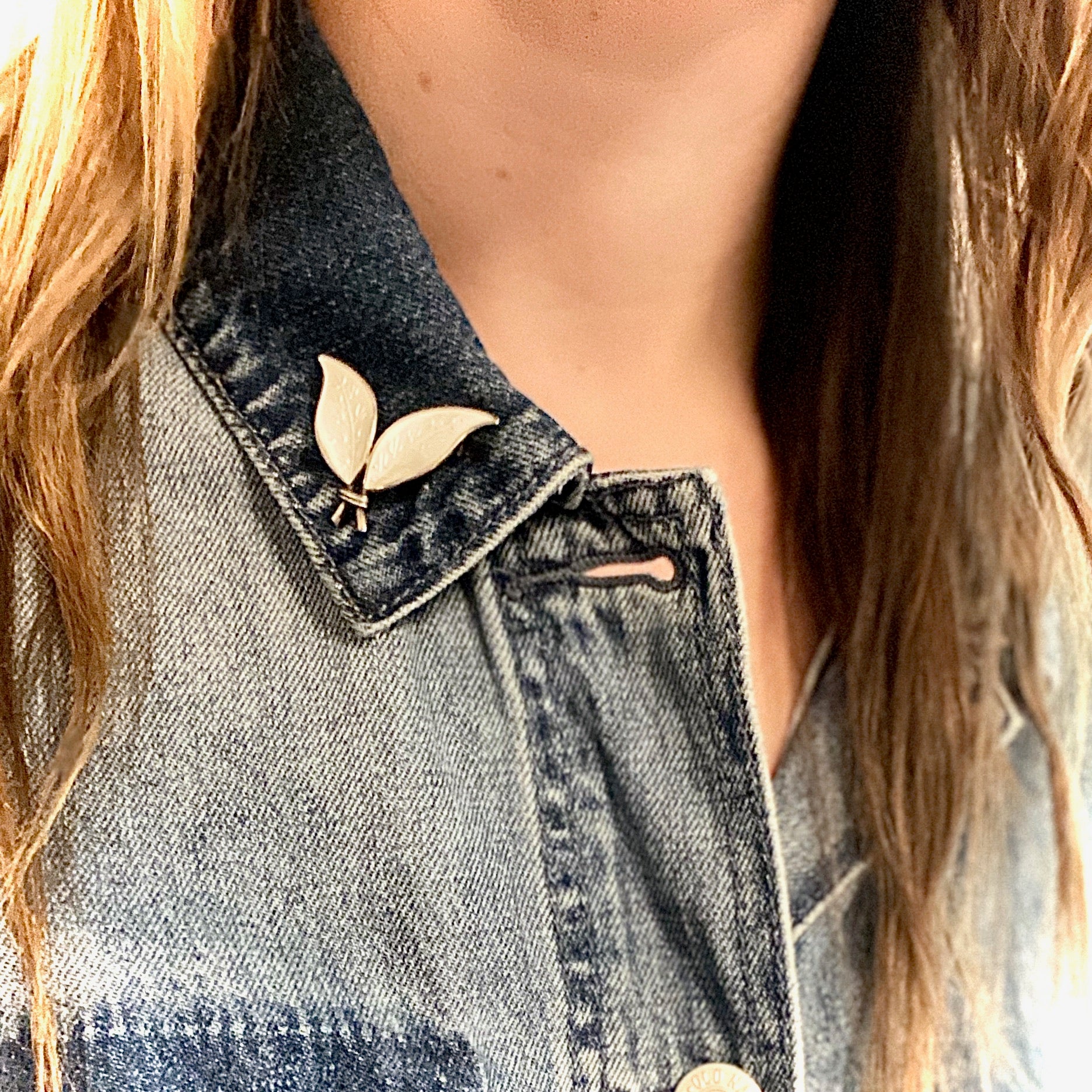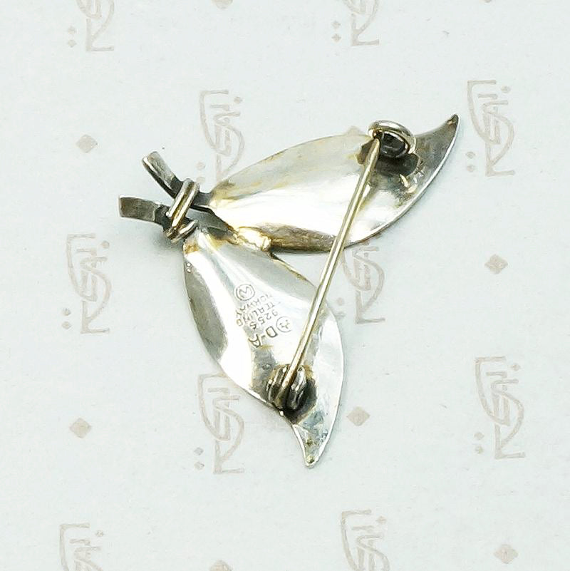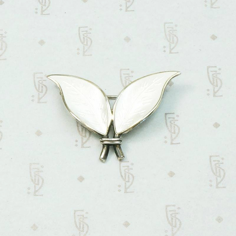 This beautiful Mid Century brooch was made in Norway. Two delicate sterling silver leaves are embellished with white guilloché enamel. Simple and serene. This brooch is signed "Norway," "925 Sterling" and "DA," the mark of the renown Norwegian jeweler David Andersen. Circa 1940-50.