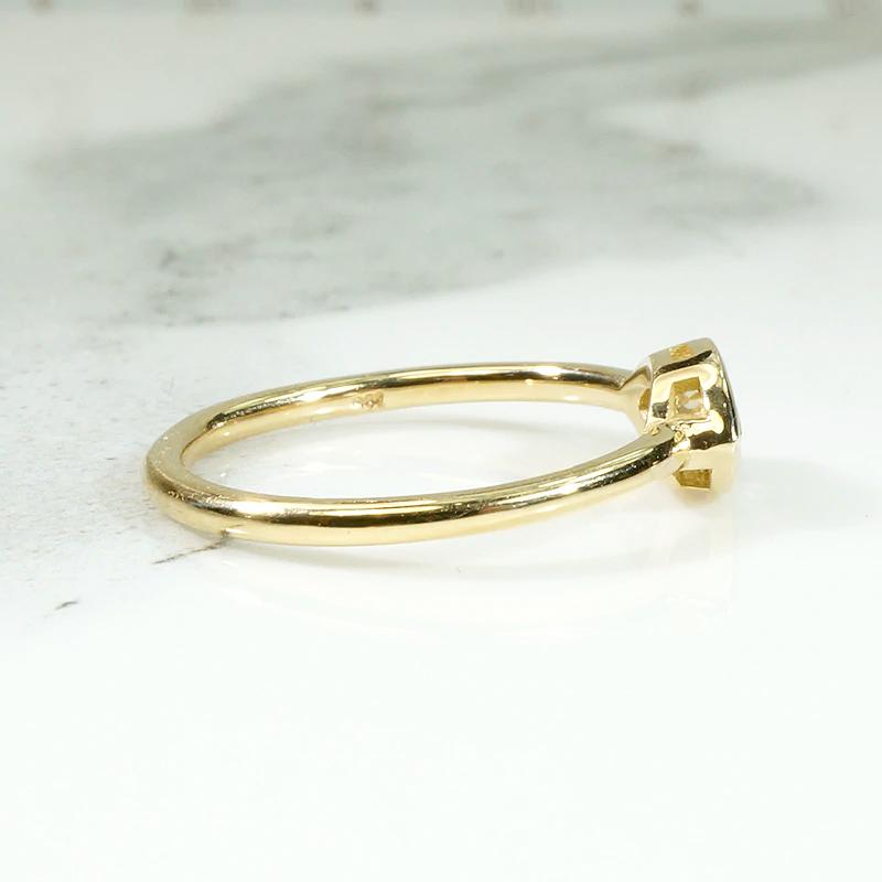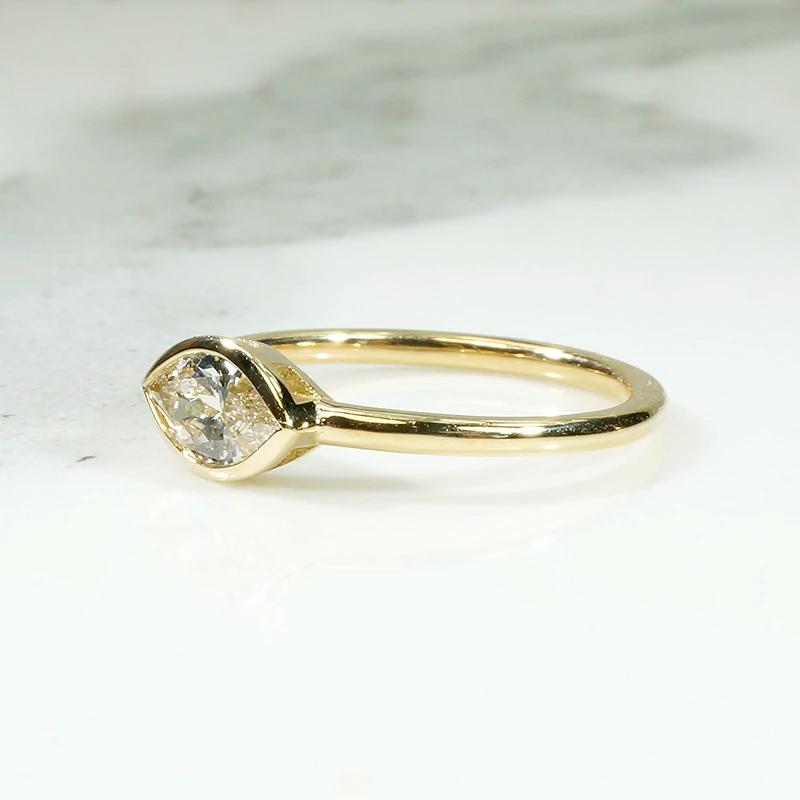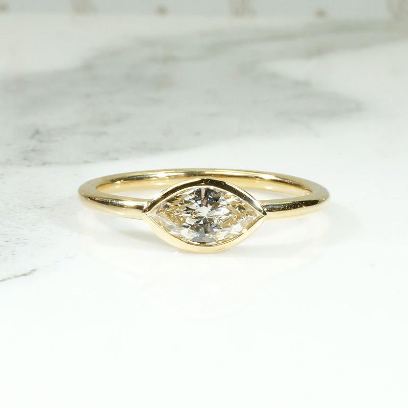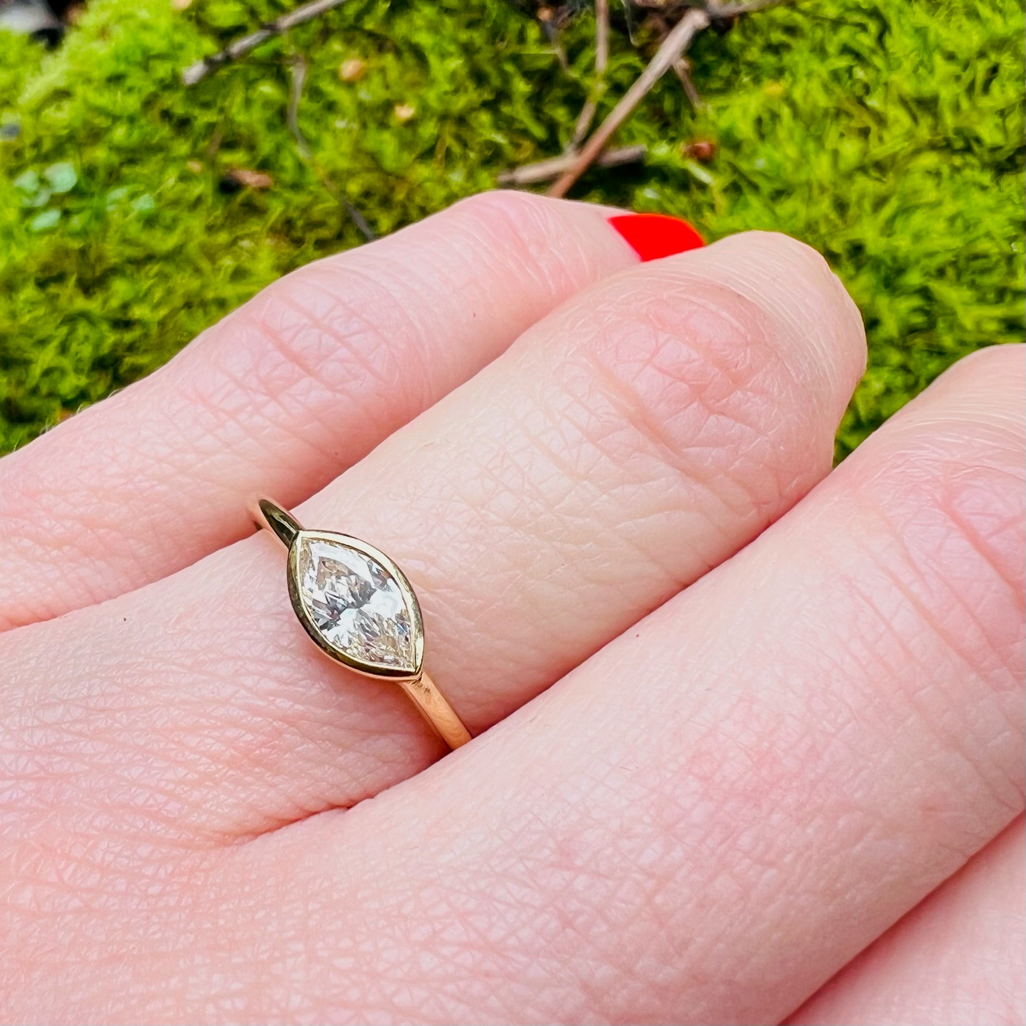 An unbelievable marquise cut diamond is bezel set in rich, recycled 18k yellow gold. The diamond has a wonderful warm hue that is deepened by the luxe yellow gold. It is set with an east/west orientation, like a wise and loving eye. Balanced and beautiful, the design of this ring will always be in style. This ring is lovely, strong, and comfortable to wear.