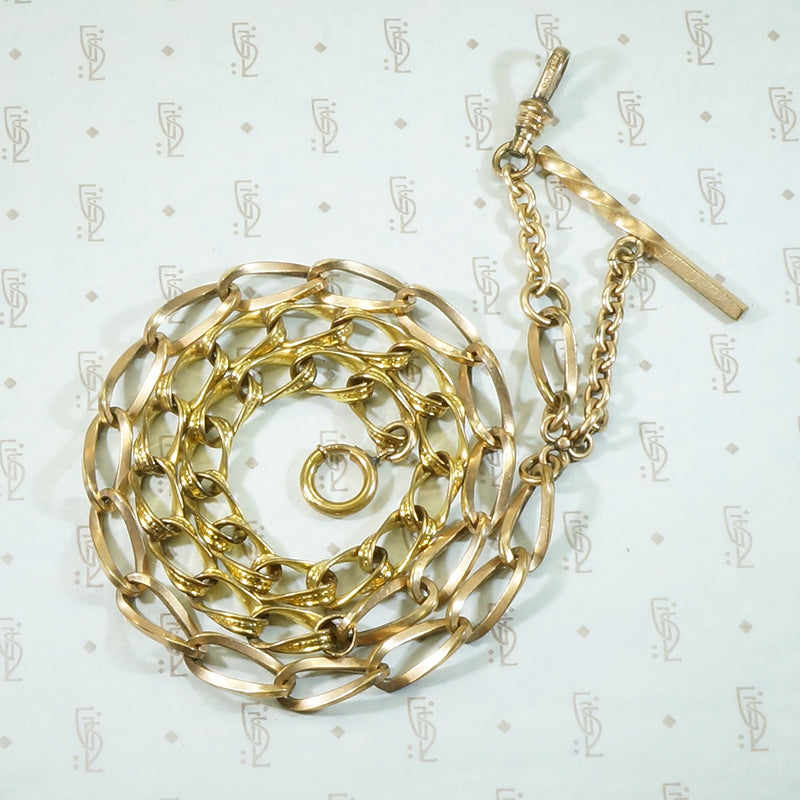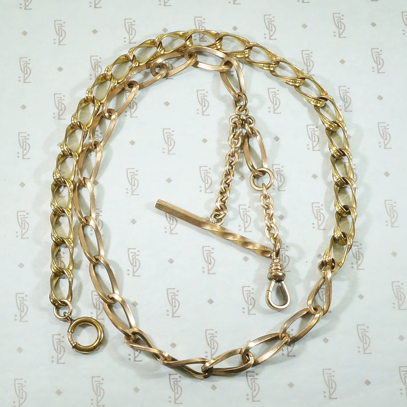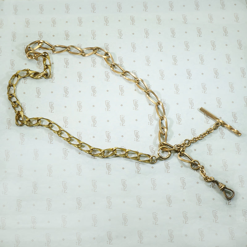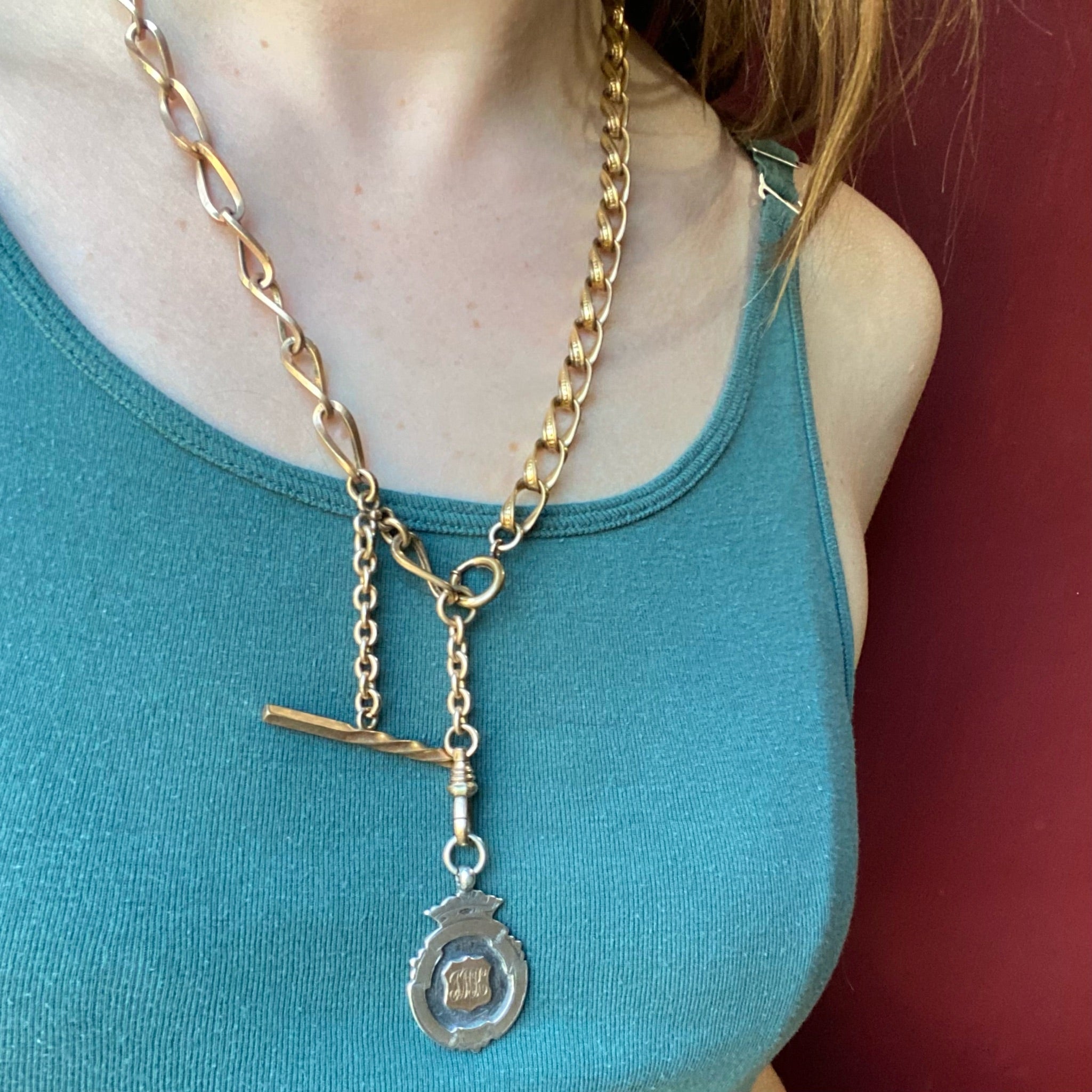 This bold necklace is formed of twisted large curb chains, one of which has a detailed pattern on each link, the other smooth. The necklace clasps at the front with a bolt ring, a trefoil element holds the pendant swivel hook and a unique t-bar with a twist on one end. The ingredients are all gold filled and date from circa 1889-1910.