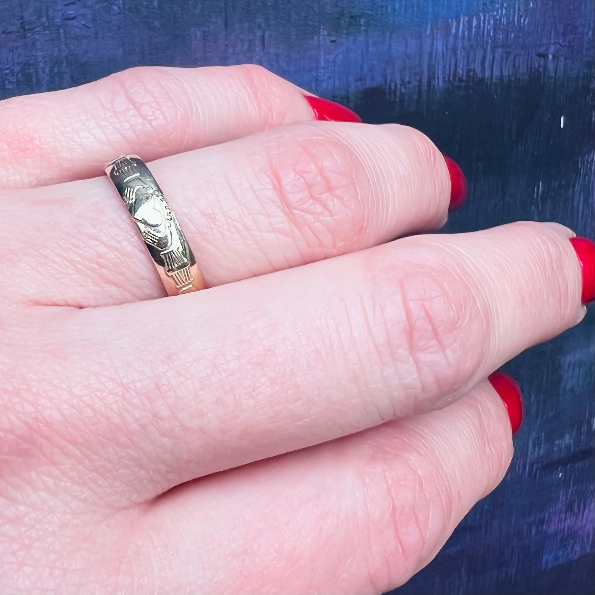 An unusual form of the traditional claddagh ring. This heavy 15ct gold band is engraved with the crowned heart and hand motif, repeated around the exterior of the band. It has a wonderful weight and feels smooth and substantial on the hand. The band is hallmarked and stamped with a makers mark. Circa 1970.